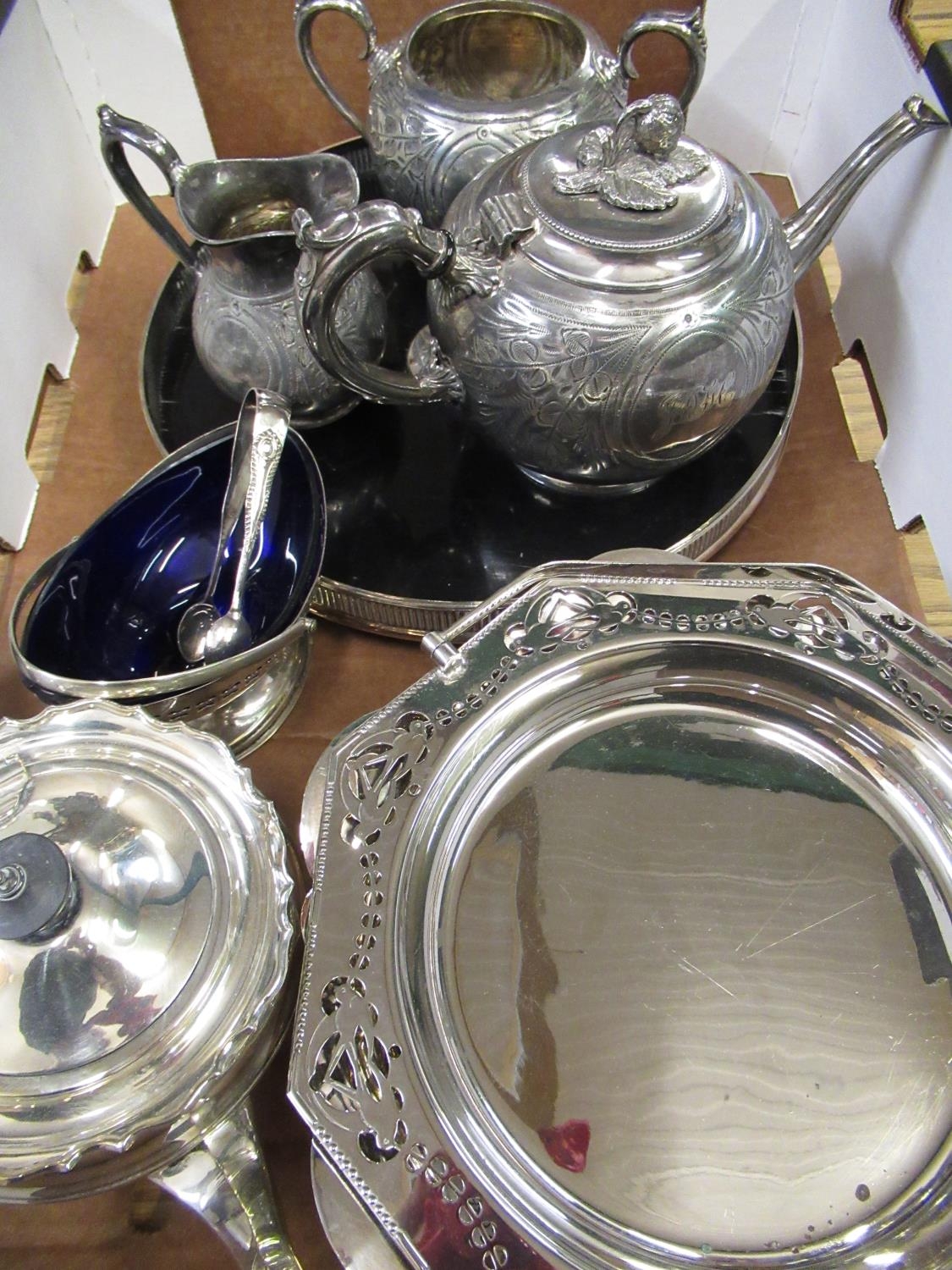 Victorian Howard of Sheffield, silver plated three-piece bullet shaped tea set, early C20th ebony tray with EPNS gallery, and other plated items