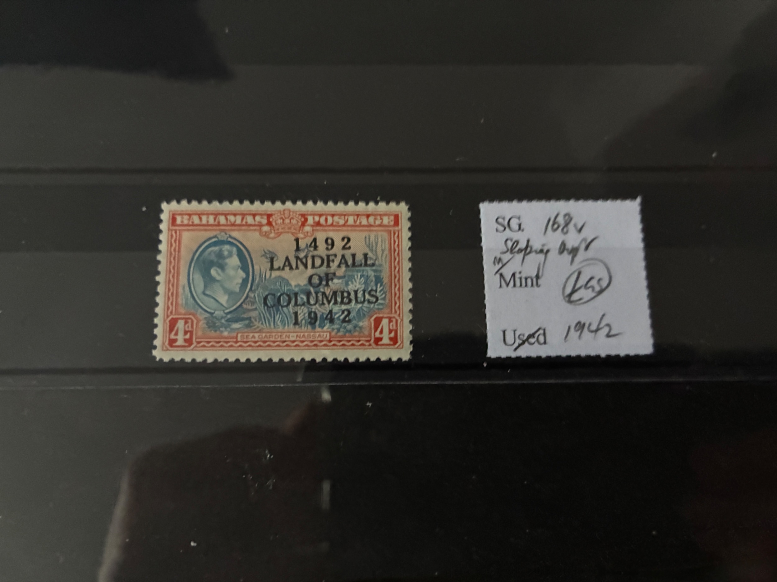Bahamas 1942 4d light blue & red-orange with “sloping ovpt” variety, m/m. (SG 168 var).