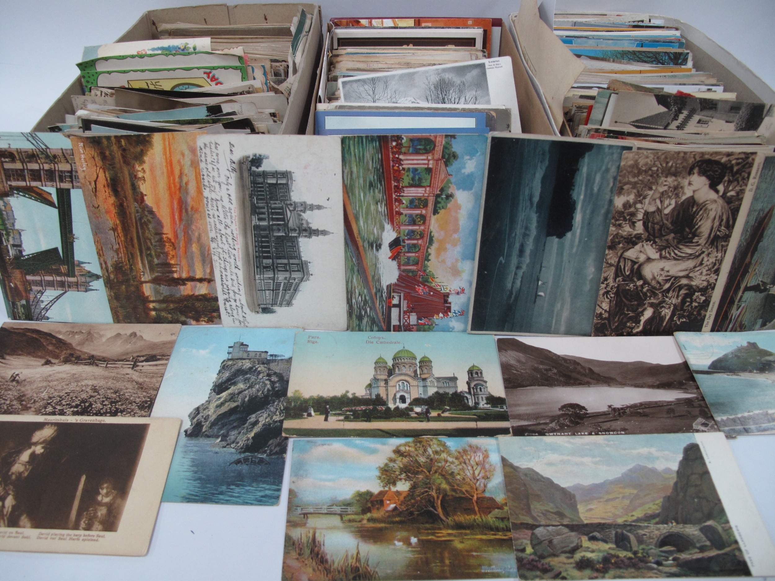 Two Boxes of Picture Postcards, dating from early to late XX Century, to include: topographical views, greetings, comic, etc.