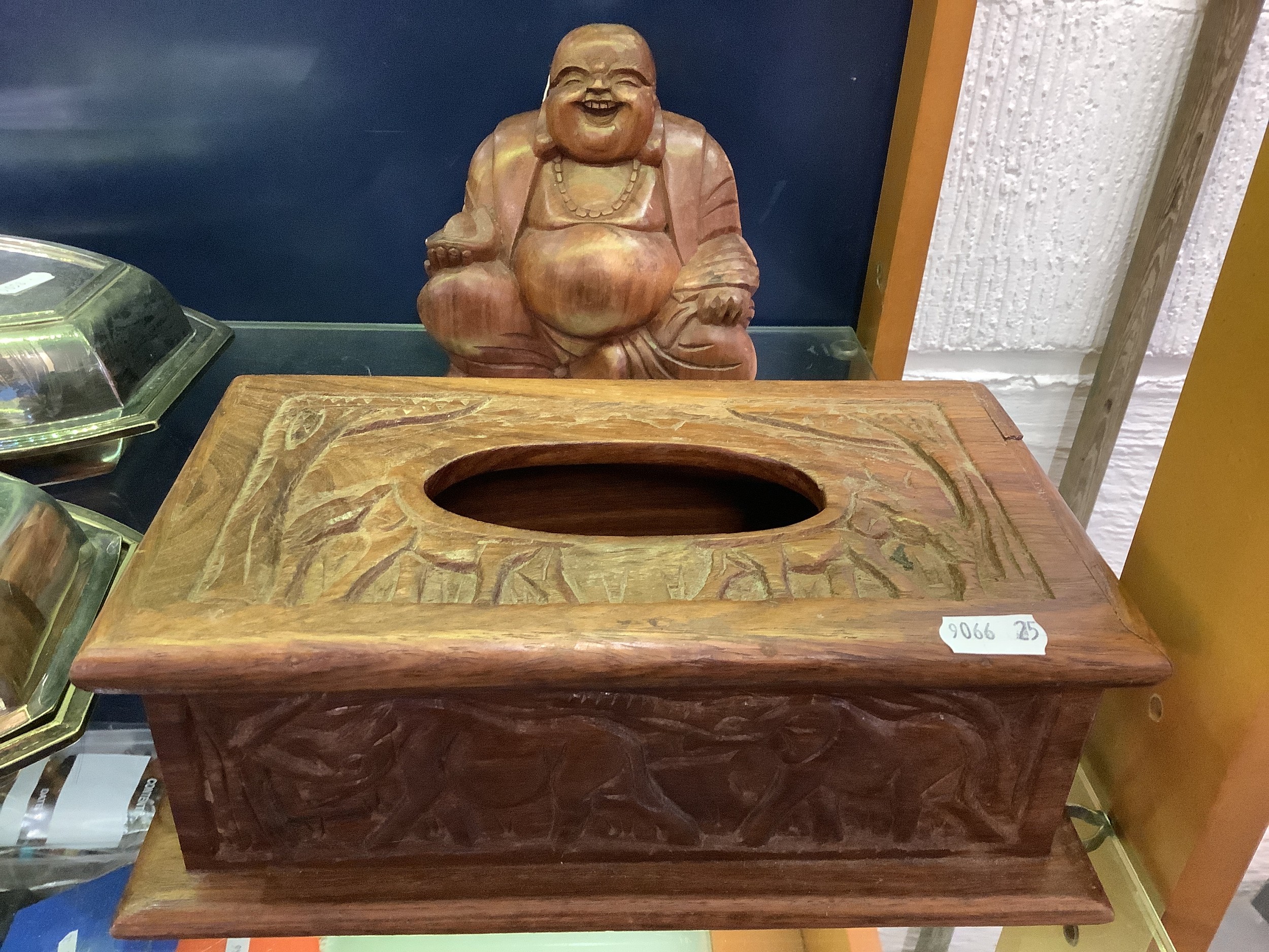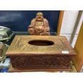 A wooden Buddha together with an Indian carved elephant box