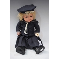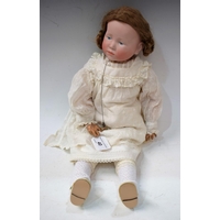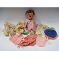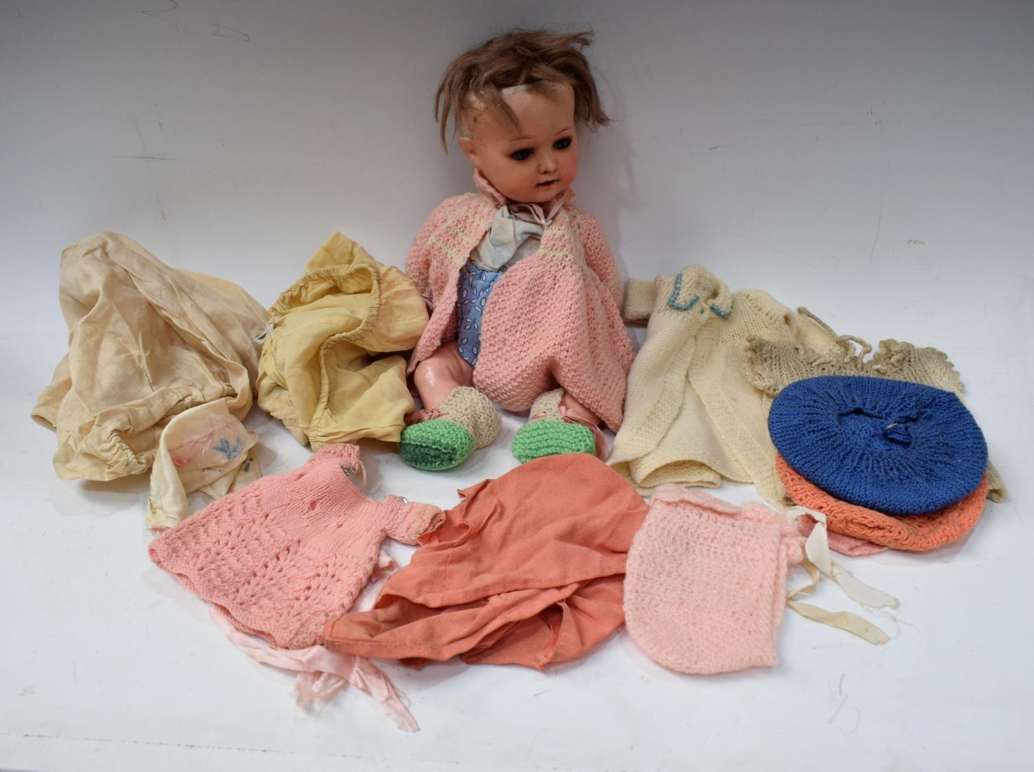 An early 20th century Heubach Koppelsdorf bisque head socket doll, sleeping blue eyes, open mouth, light brown wig, bent limbed composite body, impressed marks, Heubach Koppelsdorf, 320.4/0, Germany, approx 33cm long, with qty hand knitted and other clothes