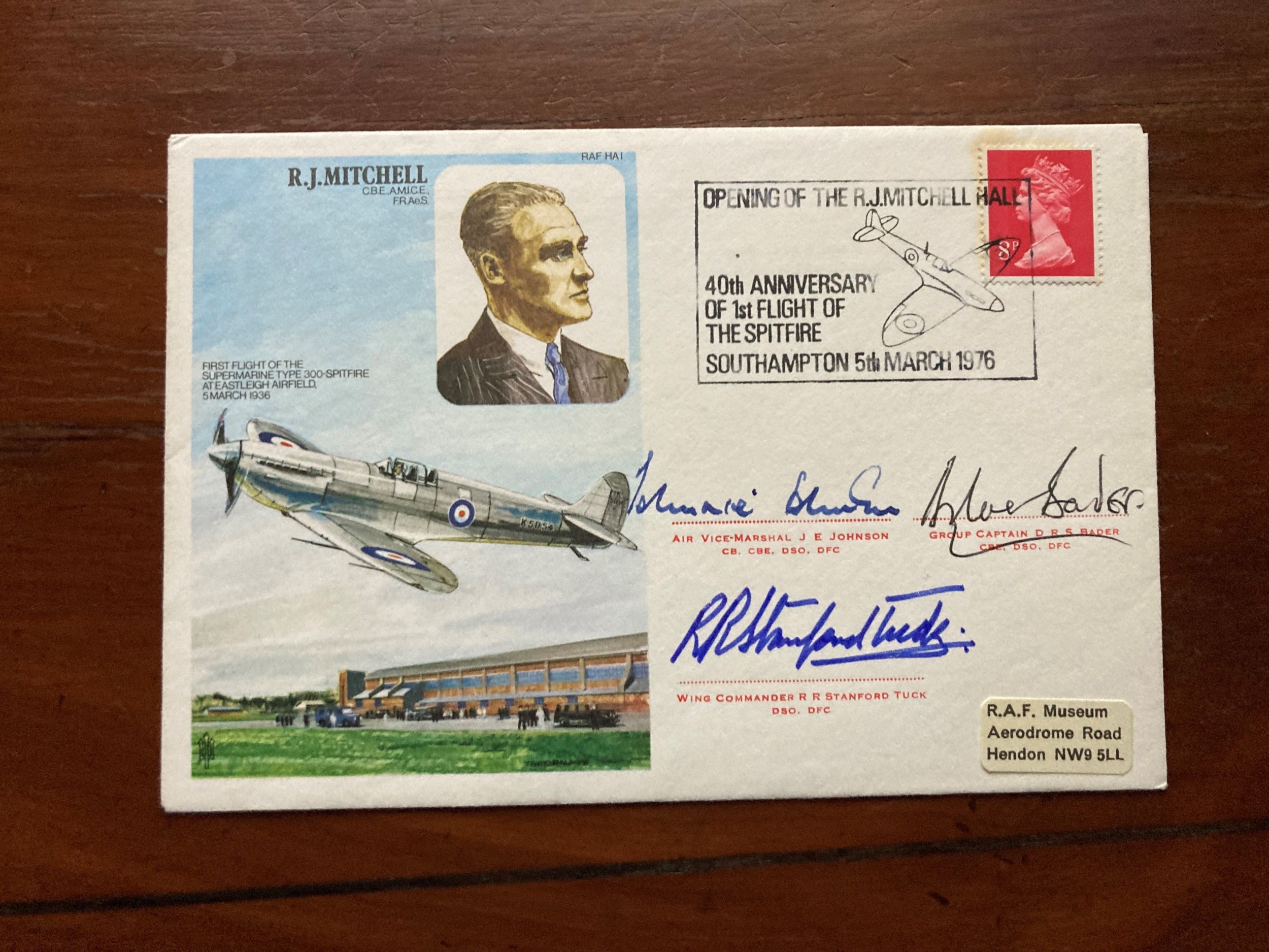 HA1d. R Mitchell Signed by 3 Spitfire Aces, J E Johnson, A Bader and Stanford Tuck. 5 Mar 1976 Southampton Opening of the R. J. Mitchell 40th Anniversary of 1st flight of the Special Postmark on 8p Definitive Stamp Cover depicts R. J. Mitchell and prototype Supermarine Type 300 Spitfire K5054 on first flight from Eastleigh Airfield on 5 March 1936. Flown in Supermarine Spitfire MK 14 to Commemorate the 40th Anniversary of the first flight of the spitfire. Personally Signed by Gp Capt Sir Douglas Bader, the legless Fighter pilot CO 242 Hurricane Squadron during the Battle of Britain, shot down in 1941 and taken prisoner, escaped was recaptured and sent to Oflag 7c Colditz Castle until released by the US Army in 1945, and Signed by James Edgar ( Johnnie ) Johnson Pilot Officer - Pilot Decorations DFC* DSO** CBE CB Squadrons 616 19 127 Wing 125 Wing. 38 Enemy aircraft destroyed. He received the DFC ( US) the order of Leopold and the C de G ( Belg). He served in the USAF and Korea in 1950. He retired on March 15 1966 as an Air Vice Marshal and also Signed by Wg Cdr Stanford Tuck who was OC 257 Squadron during the Battle of Britain and credited with 18 Victories. Certified Copy No 972 of 1026 Signed by project Officer Gp Capt W S O Randle WW11 Wellington Pilot . Single Vendor autograph collection. Good condition. All autographs come with a Certificate of Authenticity. We combine postage on multiple winning lots and can ship worldwide. UK postage from £5.99, EU from £7.99, Rest of World from £9.99