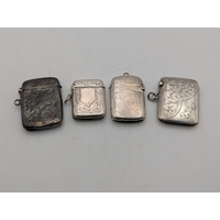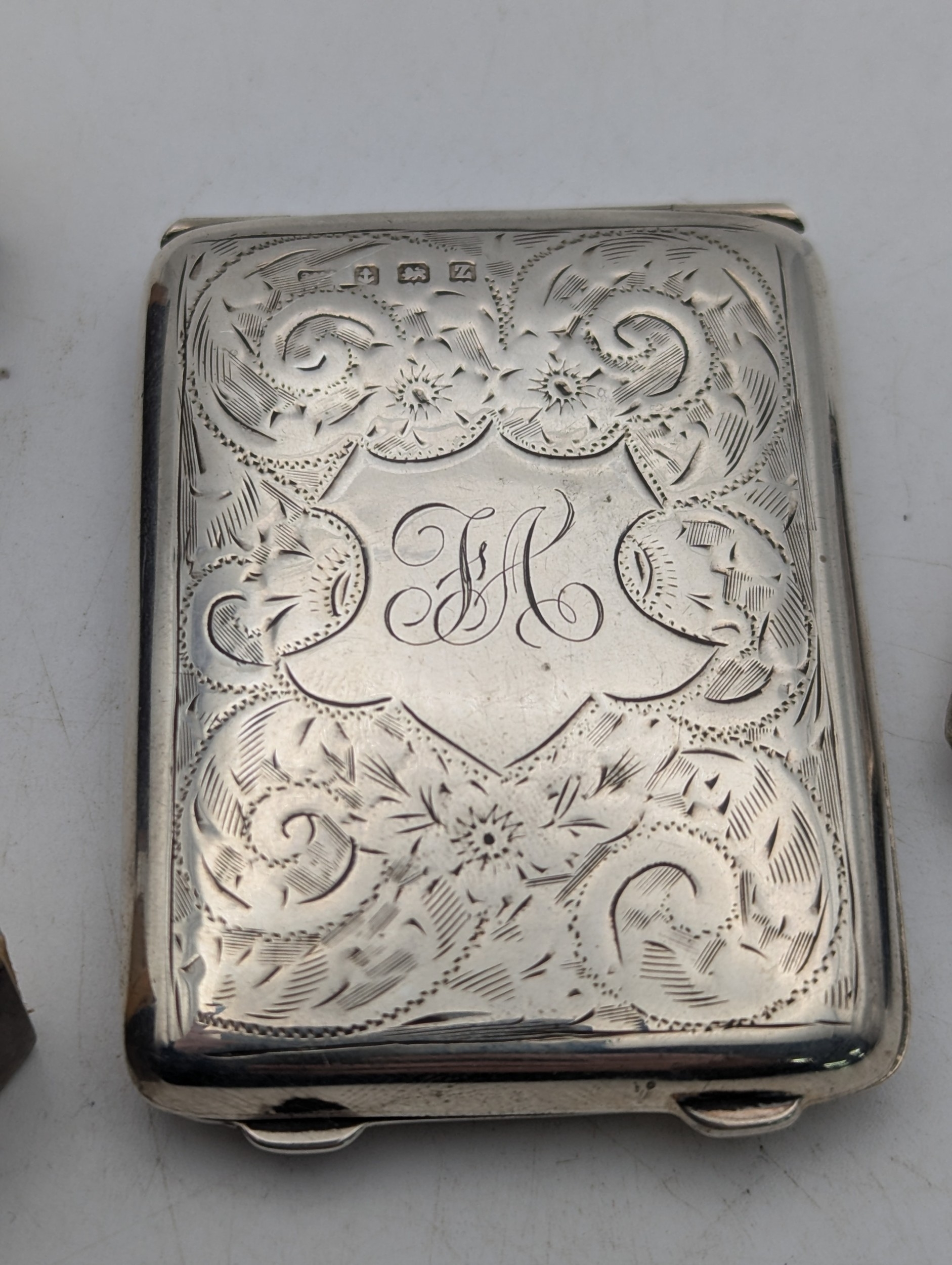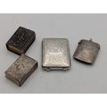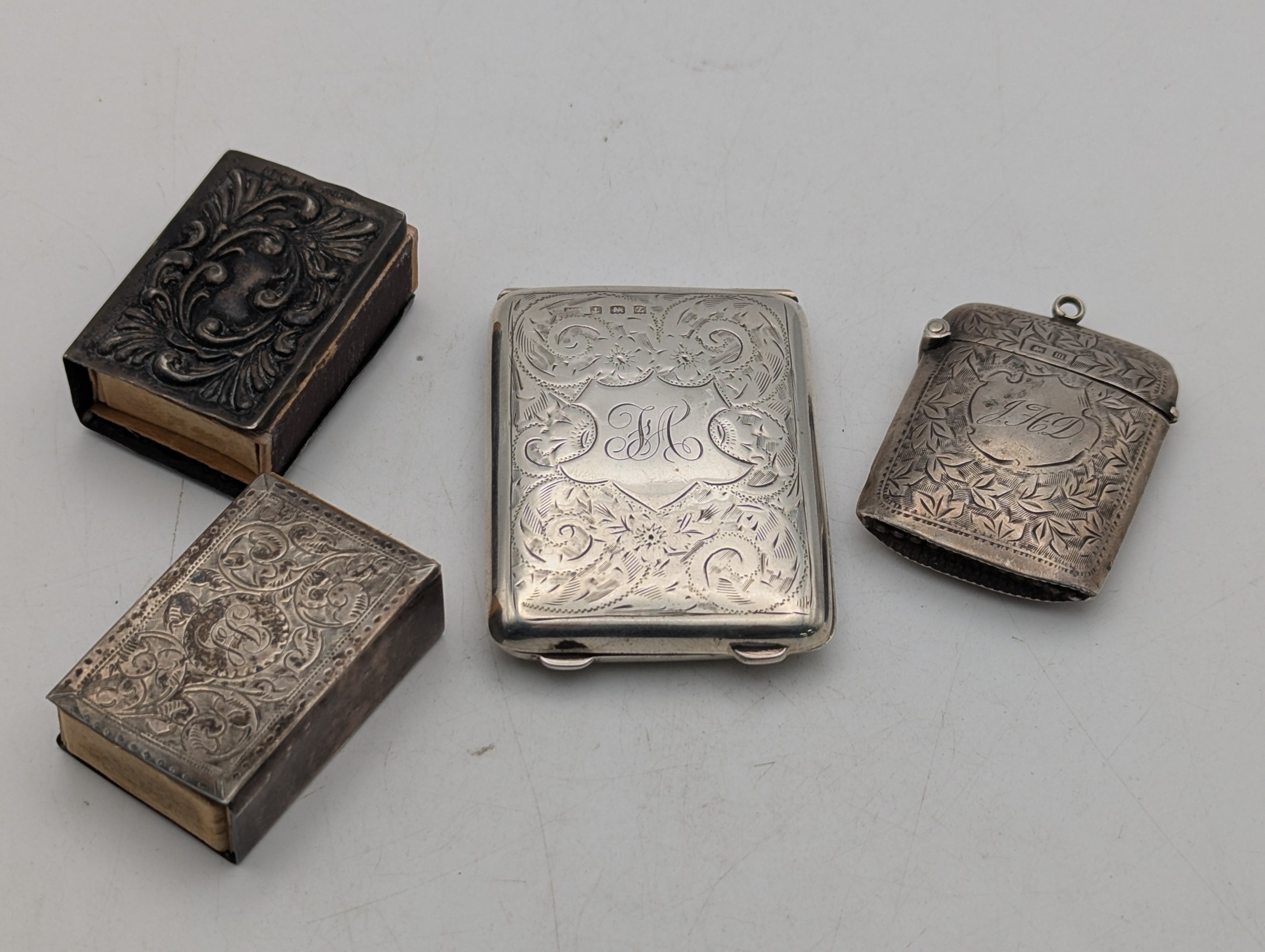 A group of silver items to include a floral engraved match stick case, a vesta case and two matchbox cases, total weight 65.7g