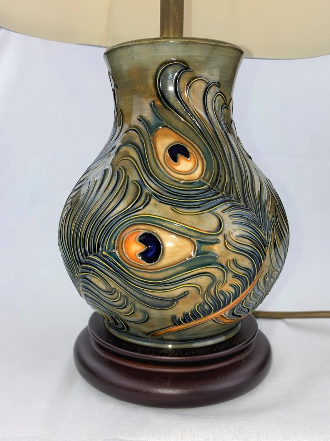 A Moorcroft baluster table lamp decorated with peacock feathers with shade height of base 19cm