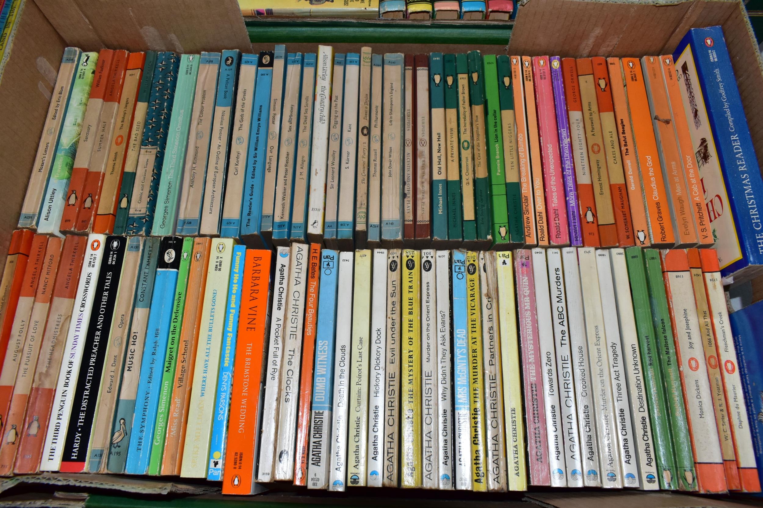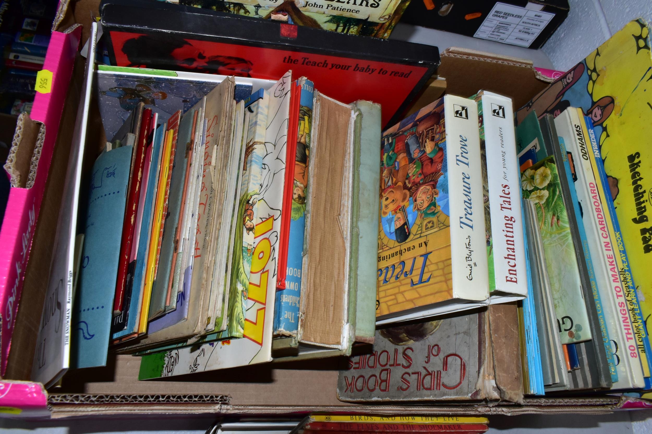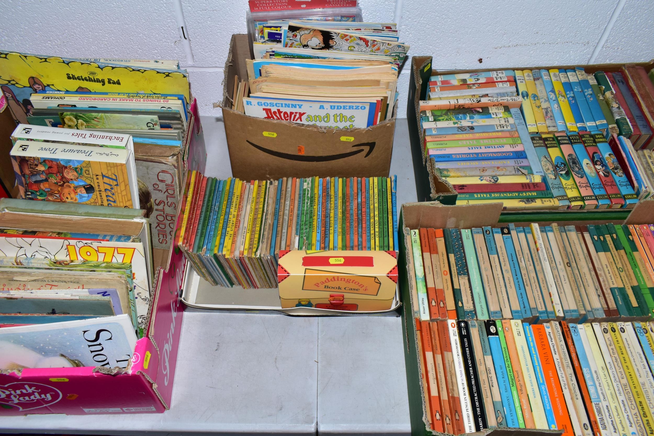 FIVE BOXES OF BOOKS, EDUCATIONAL PAMPHLETS & COMICS, in hardback and paperback formats, four of the boxes mostly consist of Children's books and include many title by Enid Blyton (various Publishers) and Beatrix Potter, there are over fifty 'Ladybird' titles and one box containing over eighty factual, classic or contemporary fiction titles, mostly published by Penguin, Pelican, Puffin and Pan, authors include Roald Dahl, Agatha Christie, Robert Graves, George Orwell and many others (5 boxes)