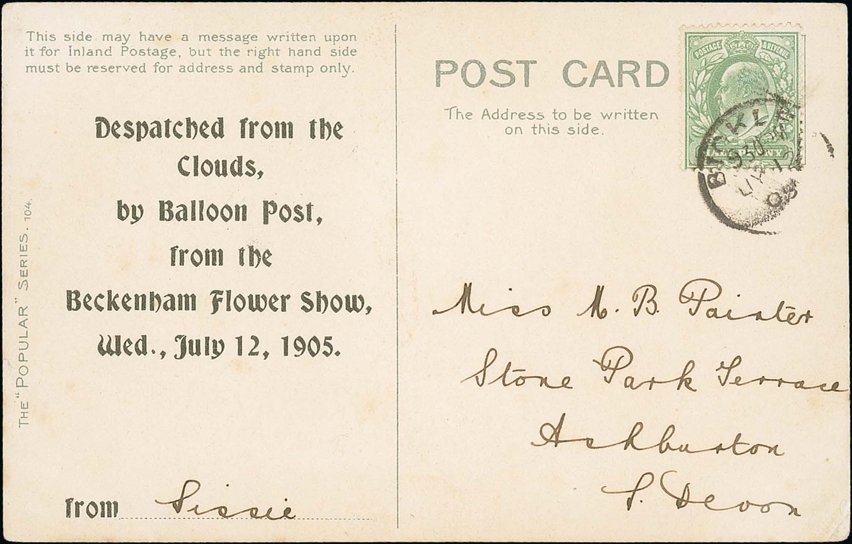 Balloon Mail. 1905 (July 12) Beckenham Flower Show postcard with the printed message "Despatched from the Clouds, by Balloon Post, from the Beckenham Flower Show, Wed., July 12, 1905", addressed to Devon with KEVII ½d cancelled at Bickley. The balloon flew from Beckenham to Romford; cards were dropped en route at Bickley, Chislehurst, Greenhithe and Romford. Fine and scarce. Photo on Page 46.