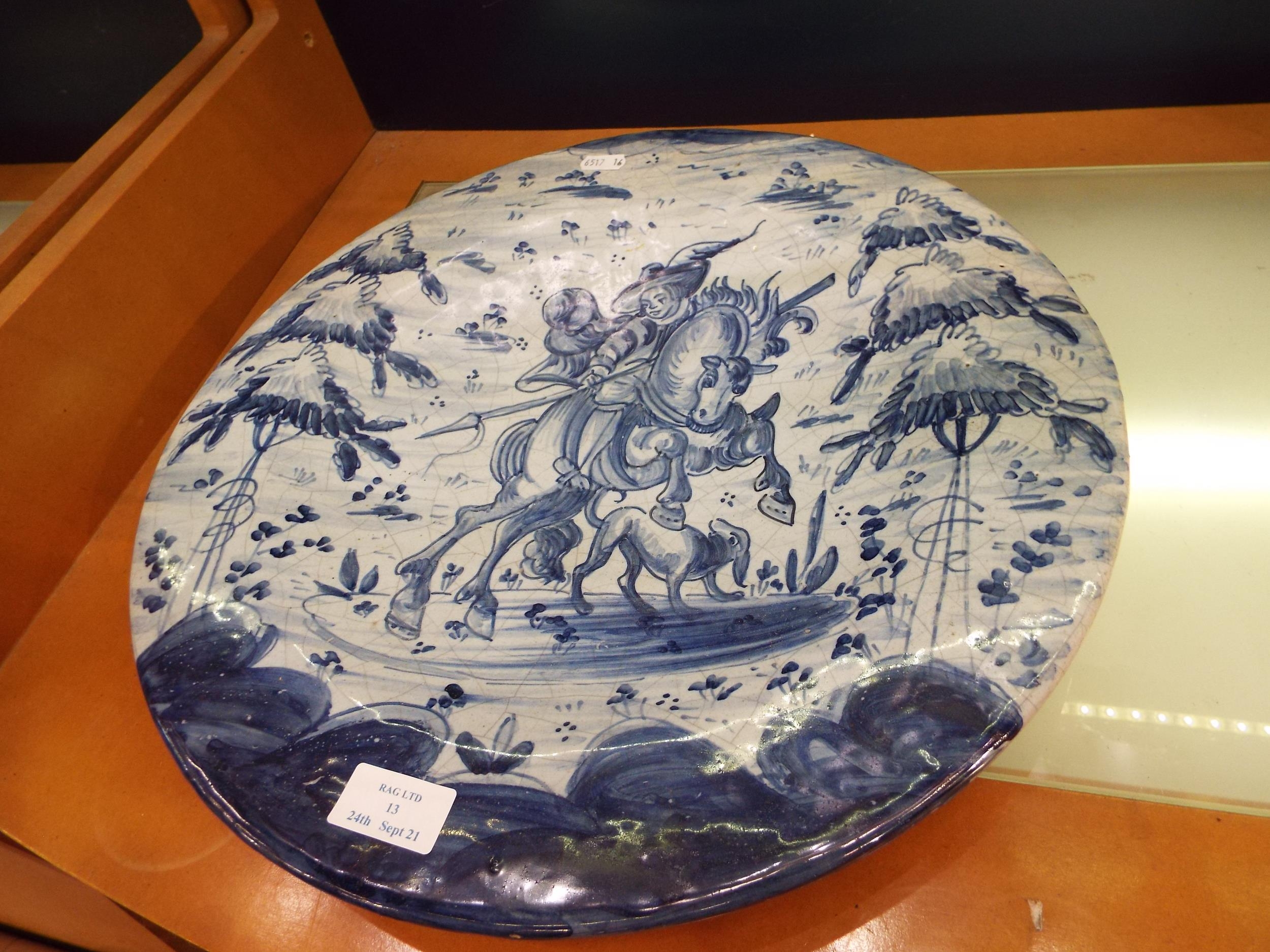 A Talavera Spanish wall plaque with hunting scene decoration