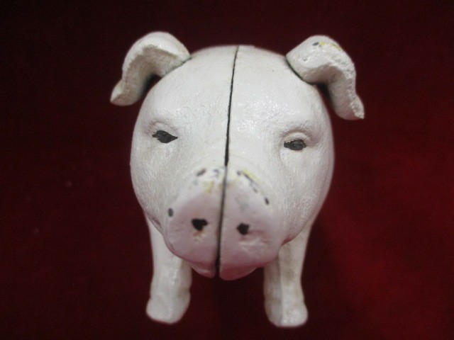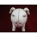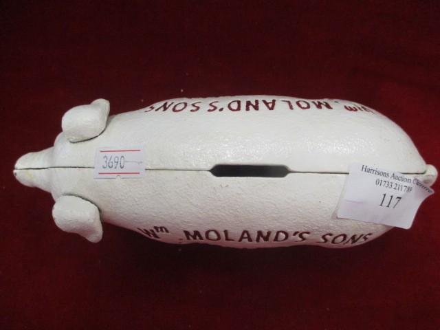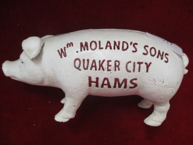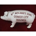 CAST IRON PIG MONEY BOX ADVERTISING Wm MOLAND'S SONS, QUAKER CITY, HAMS