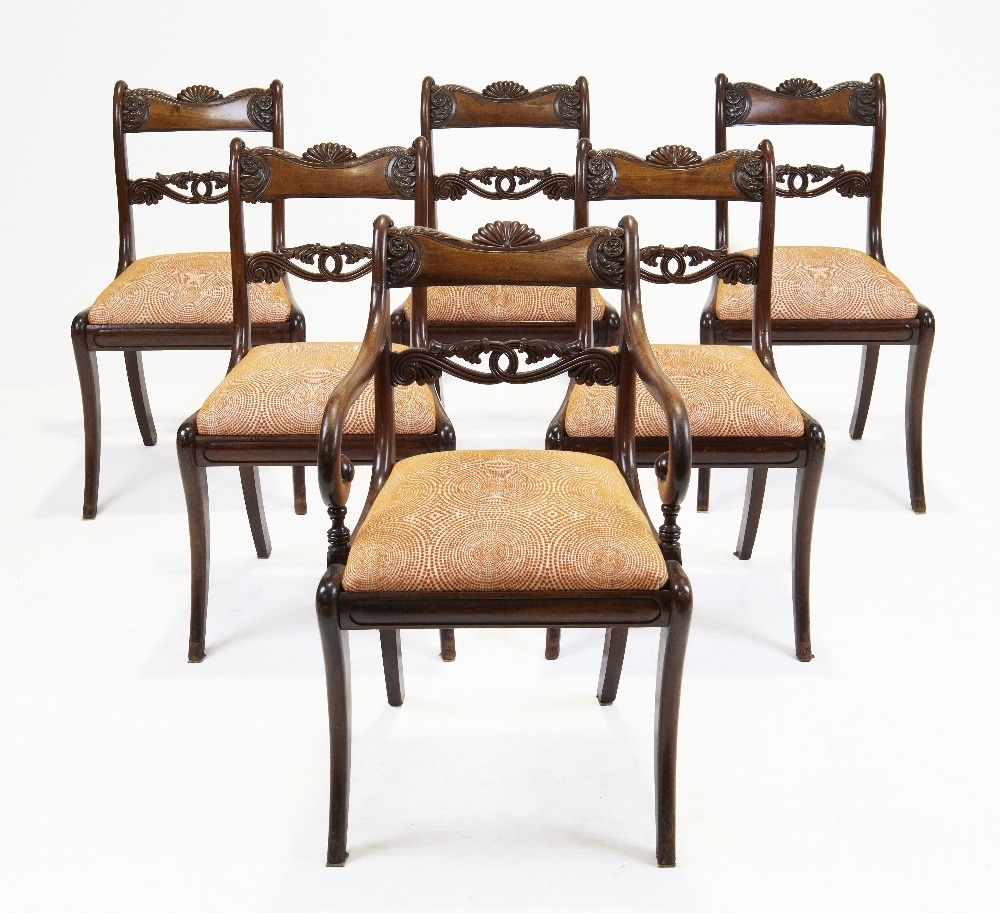 A set of six Regency mahogany dining chairs, first quarter 19th century, to include one scroll armchair (6)
