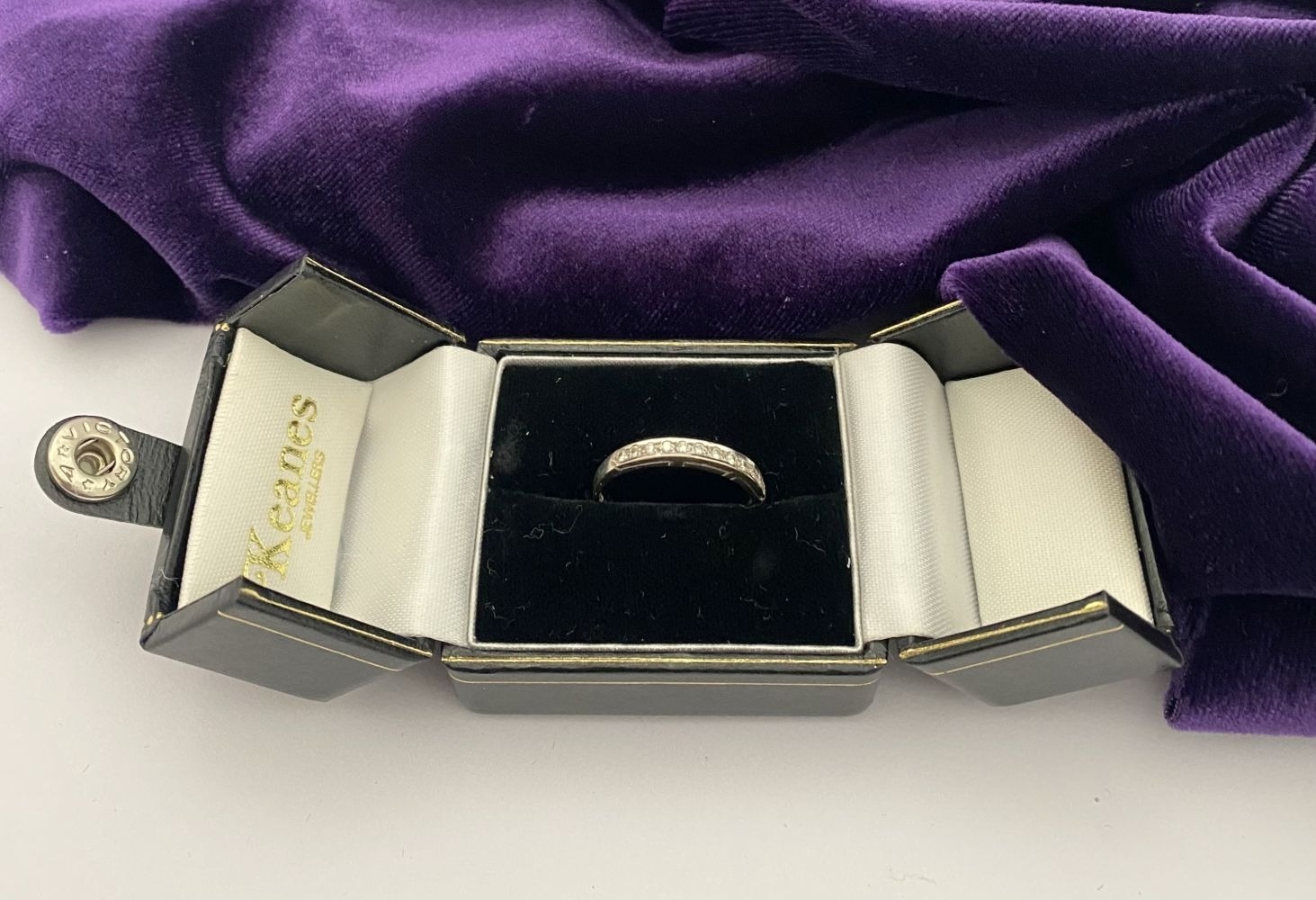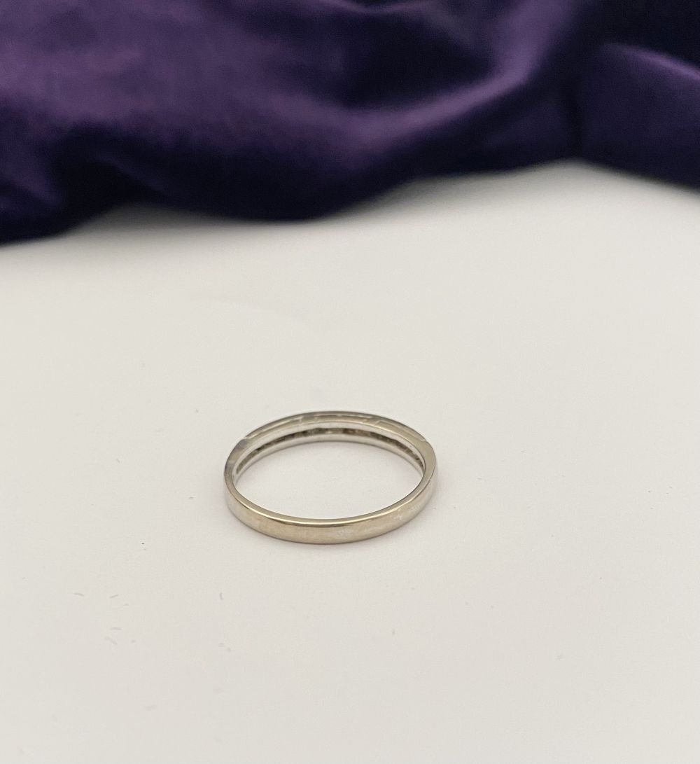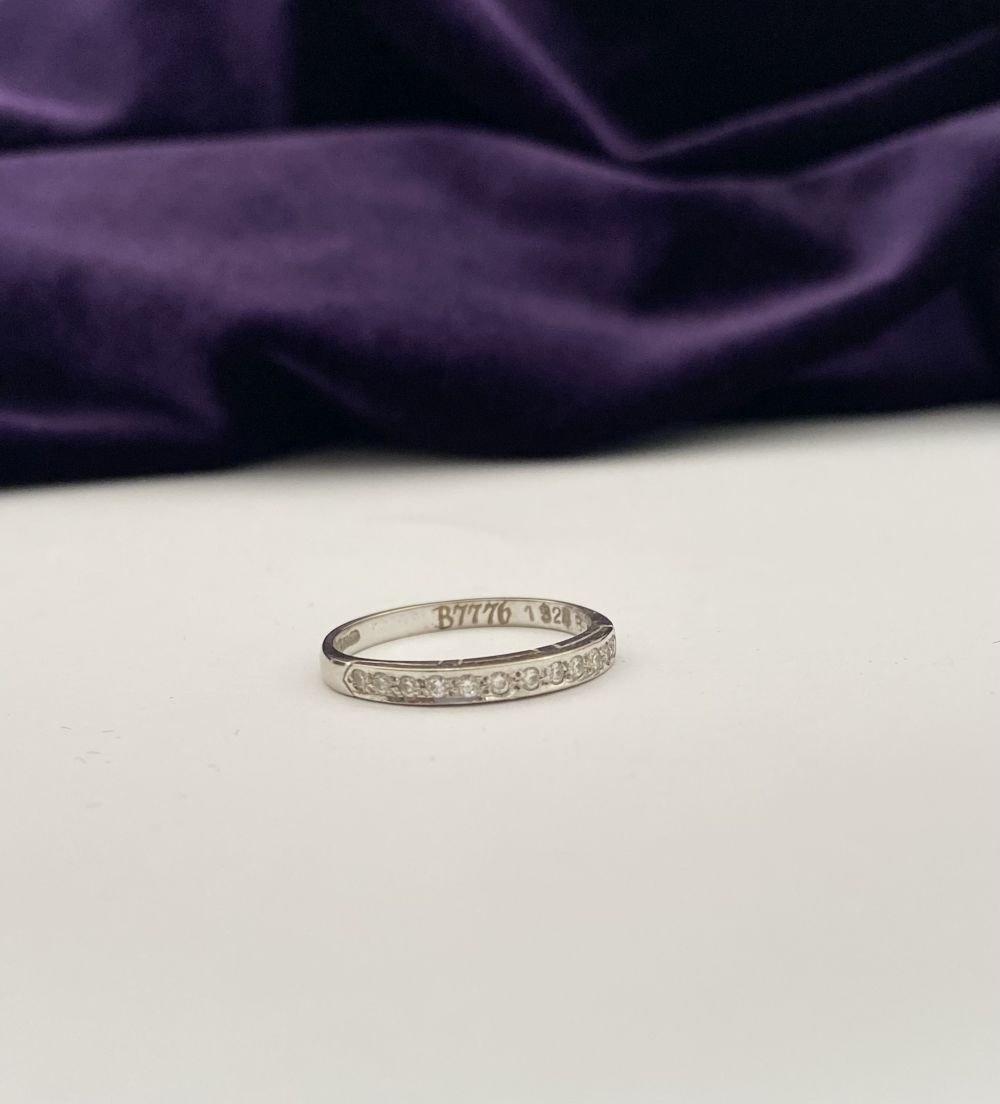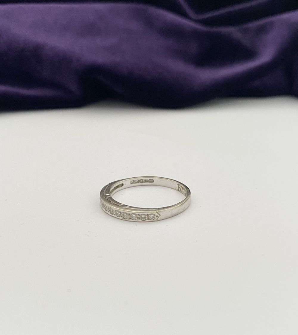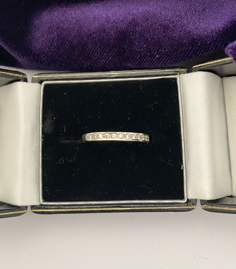 AN ELEGANT 18CT WHITE GOLD DIAMOND HALF ETERNITY RING, with twelve round cut diamonds in raised pave setting, hallmarked 750 with Irish Makers marks to interior band. Ring size: P