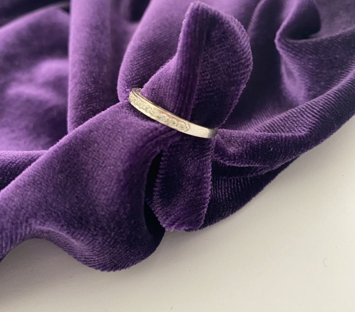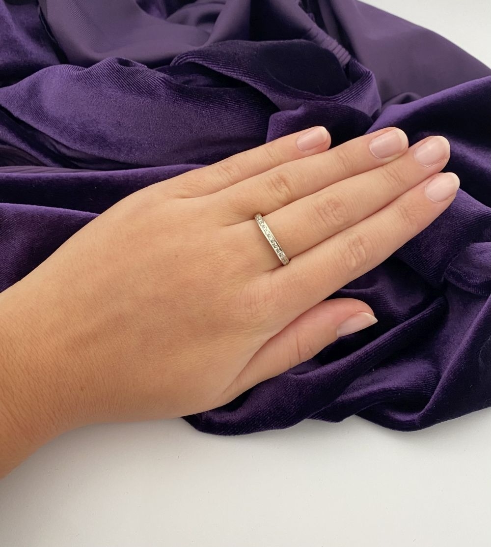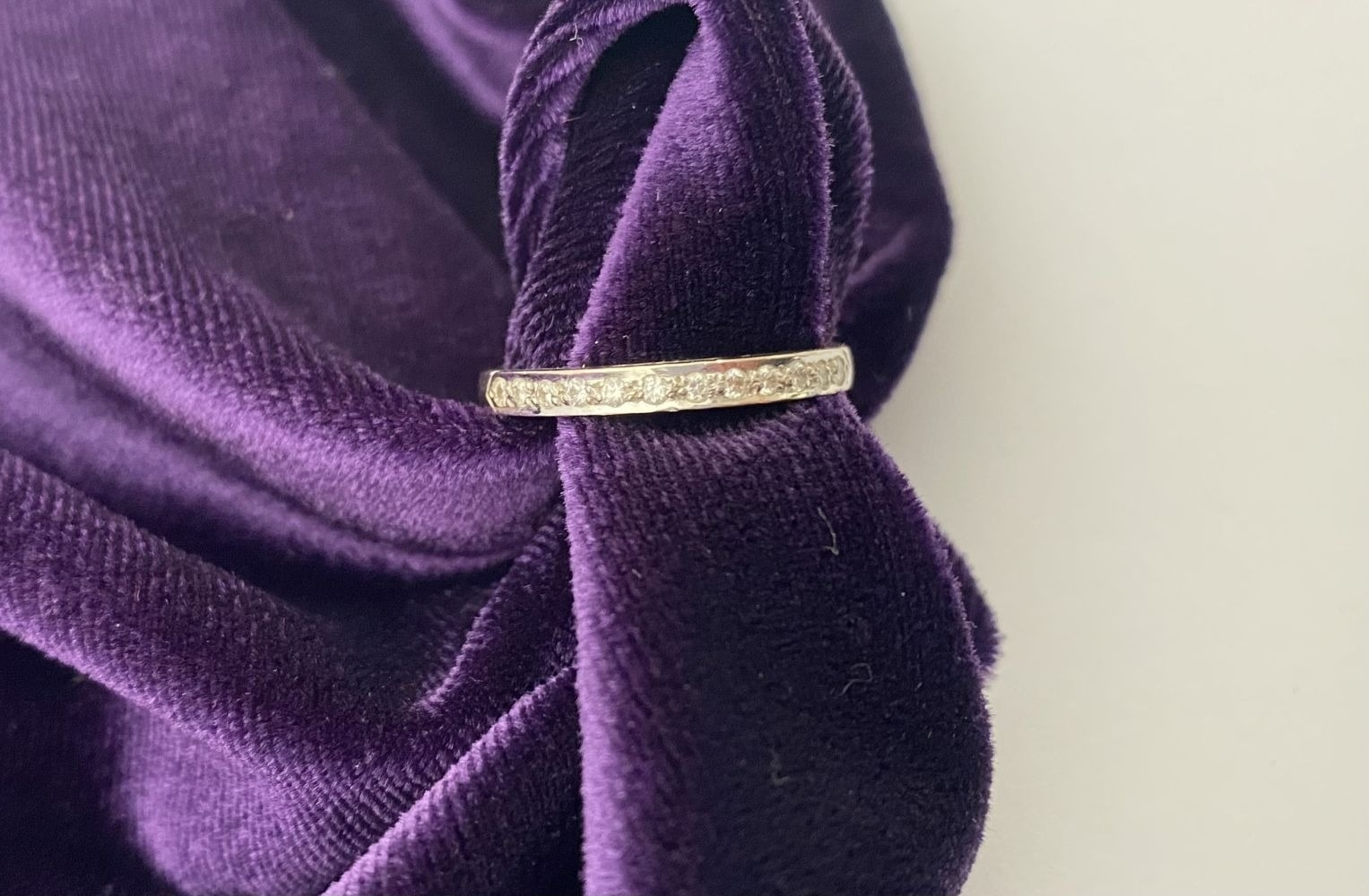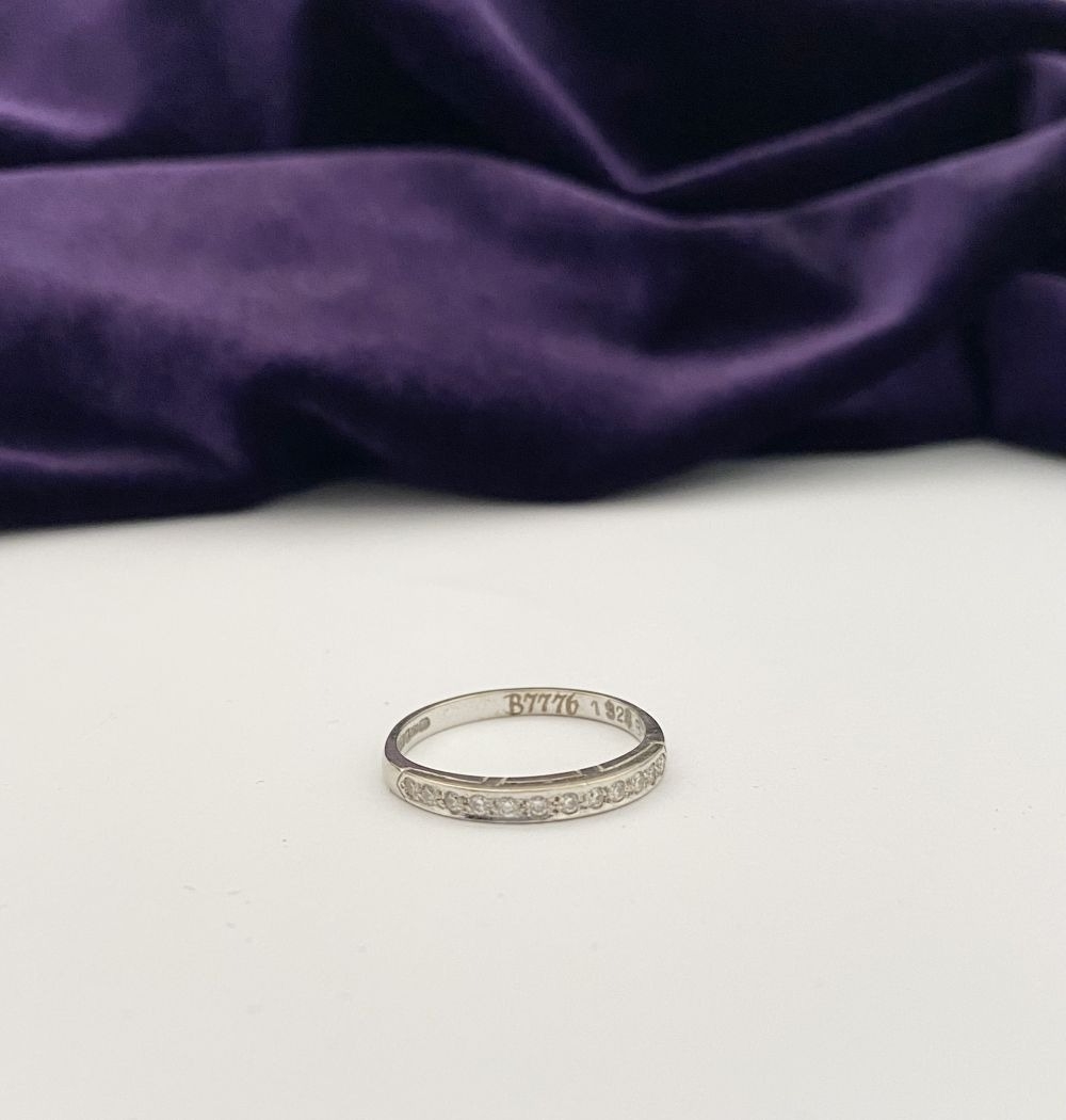 AN ELEGANT 18CT WHITE GOLD DIAMOND HALF ETERNITY RING, with twelve round cut diamonds in raised pave setting, hallmarked 750 with Irish Makers marks to interior band. Ring size: P