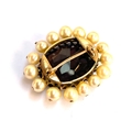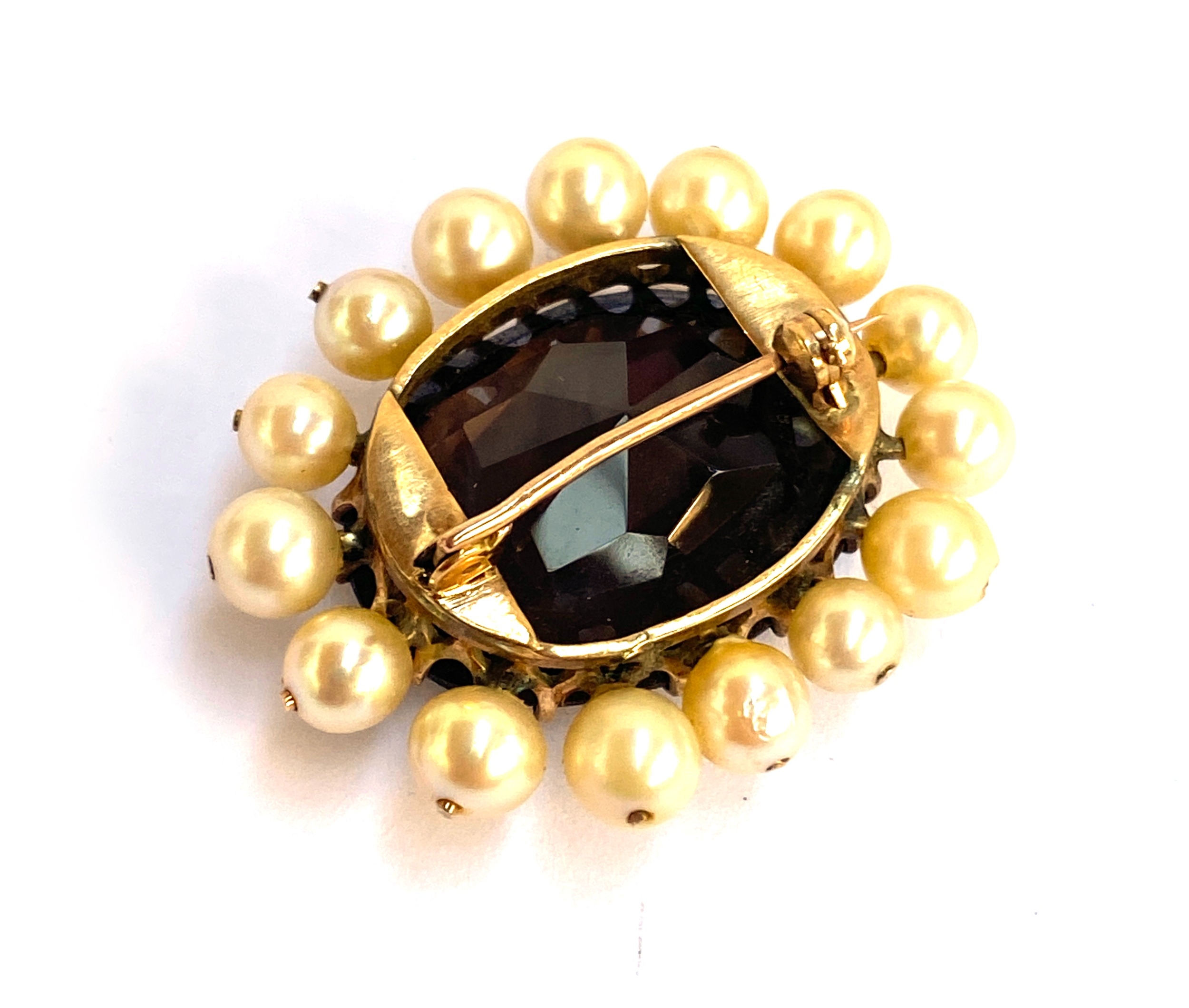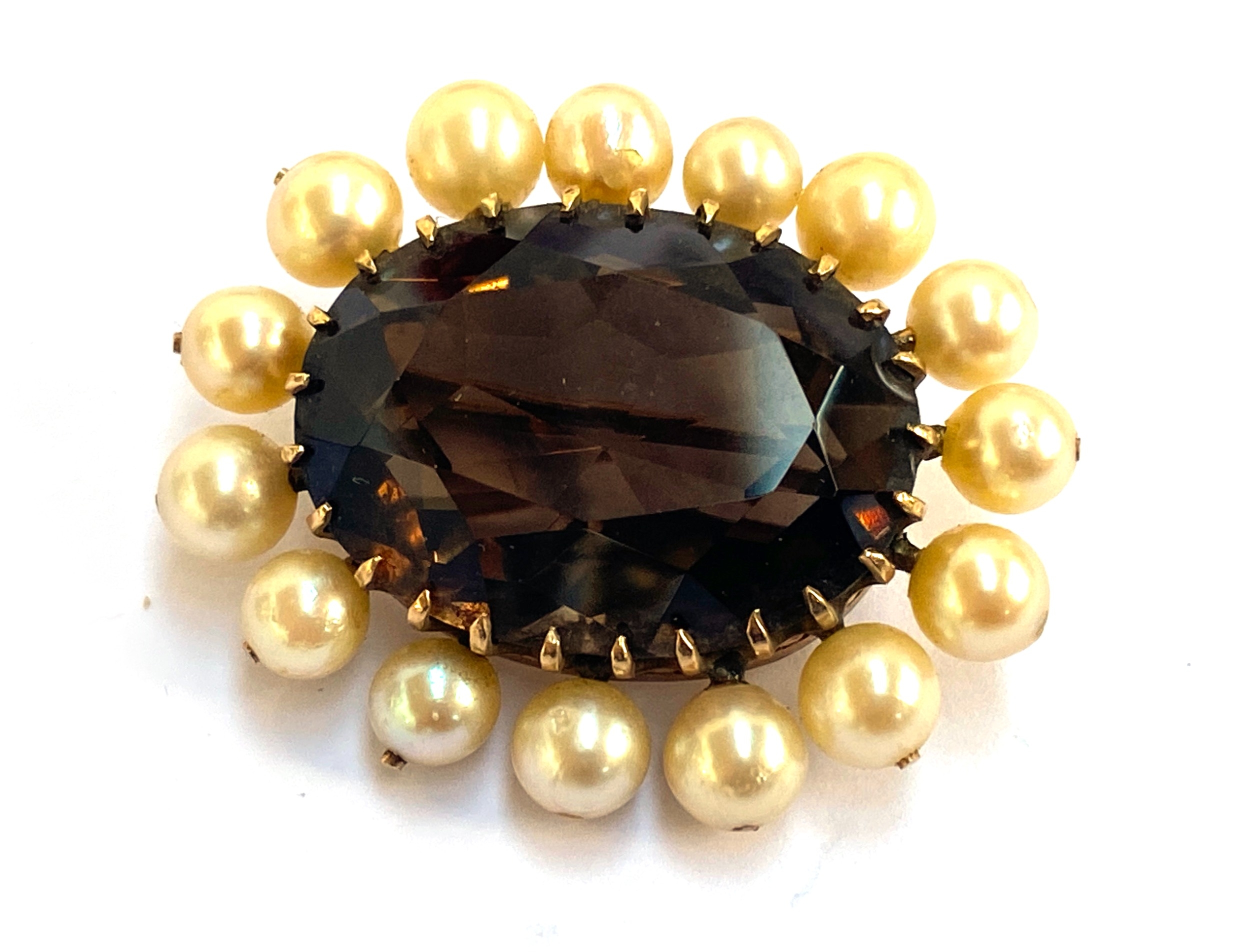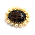 A gold mounted smoky quartz brooch surrounded by cultured pearls, unhallmarked but tests as 9ct or higher, 3.5cmL, gross weight 12.8g