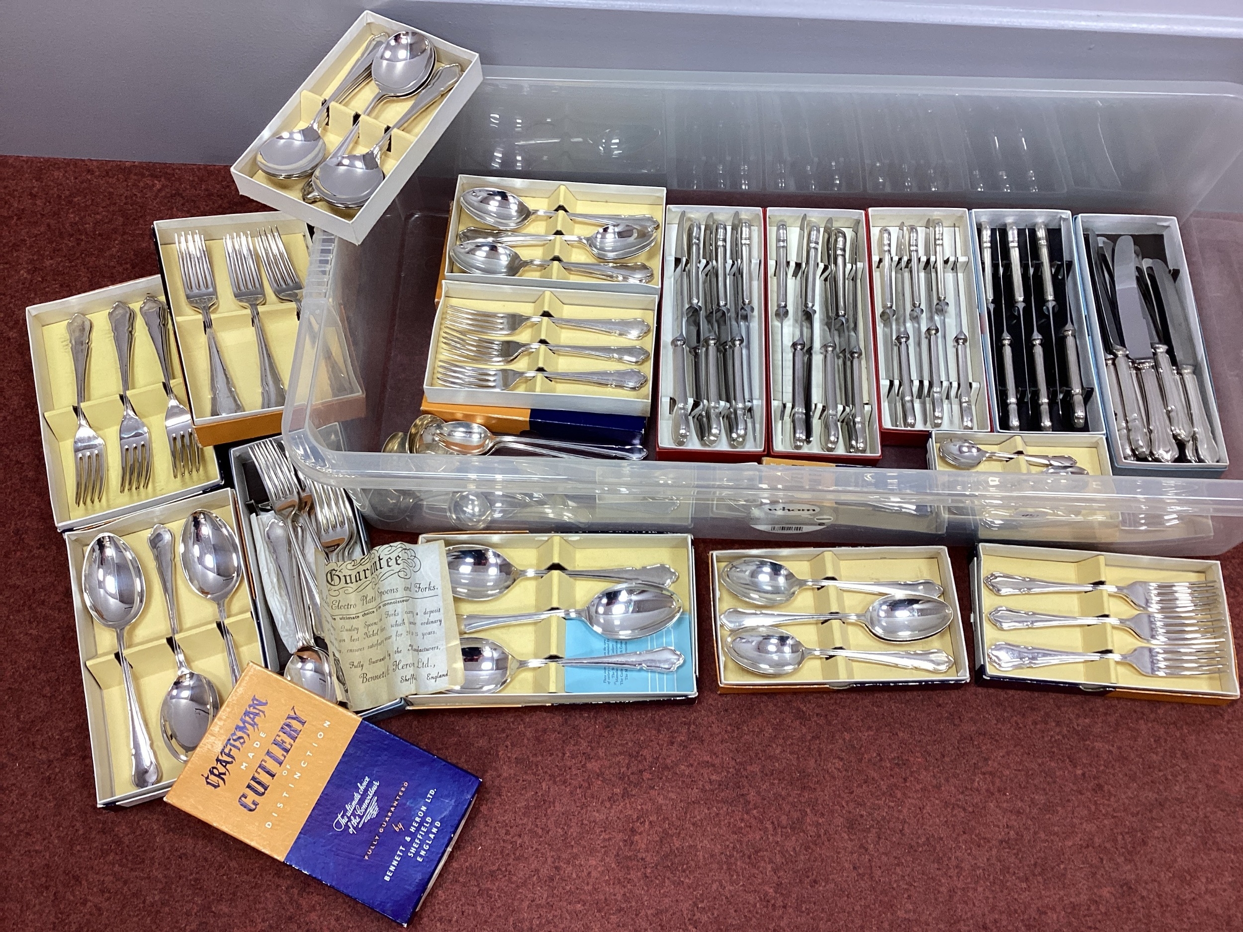 A Quantity of Bennett & Heron Ltd (Sheffield) Dubarry Pattern Plated Cutlery, boxed, together with matching sauce ladles etc.