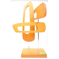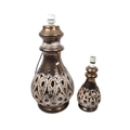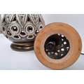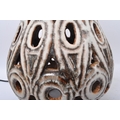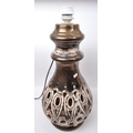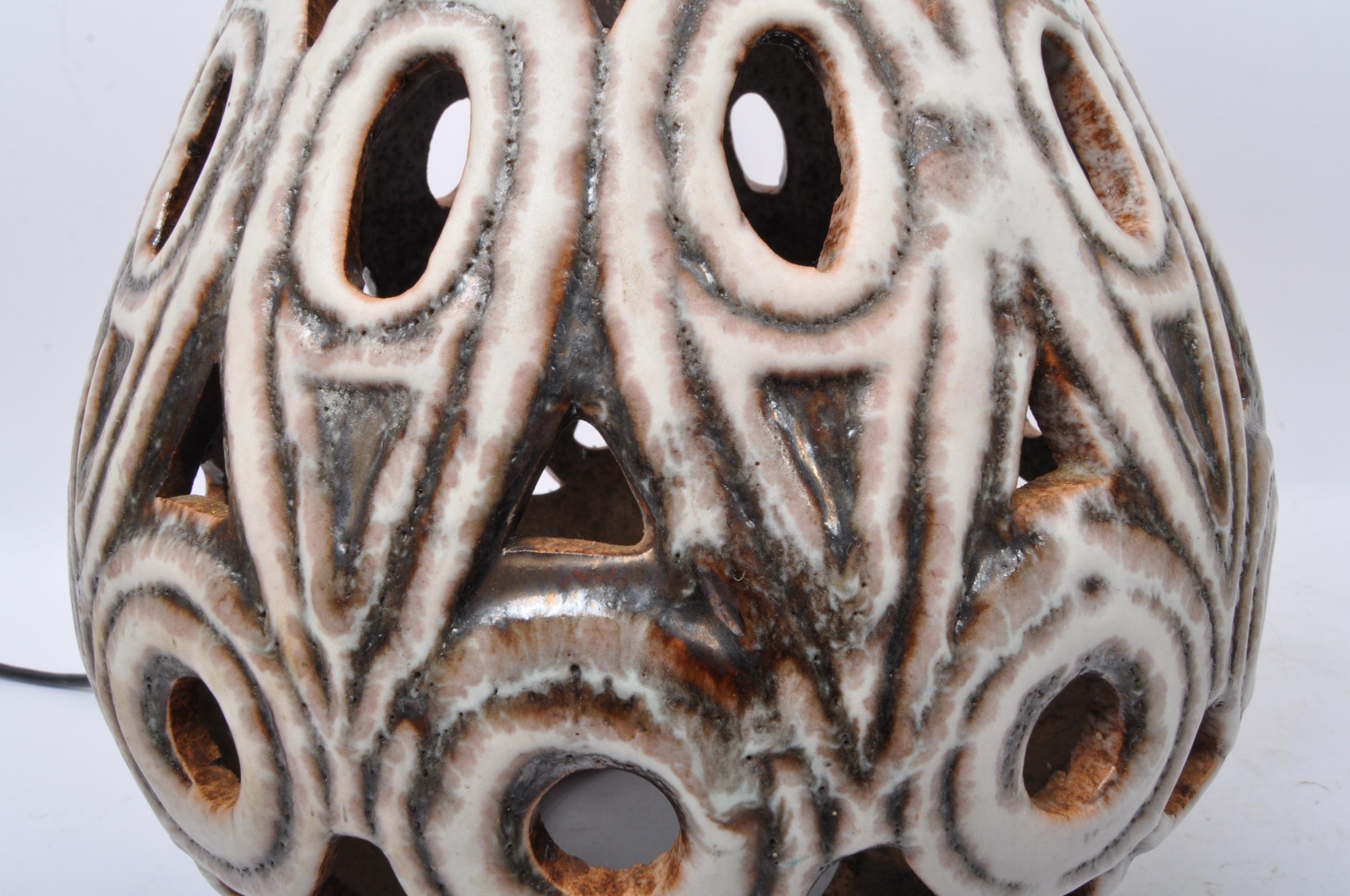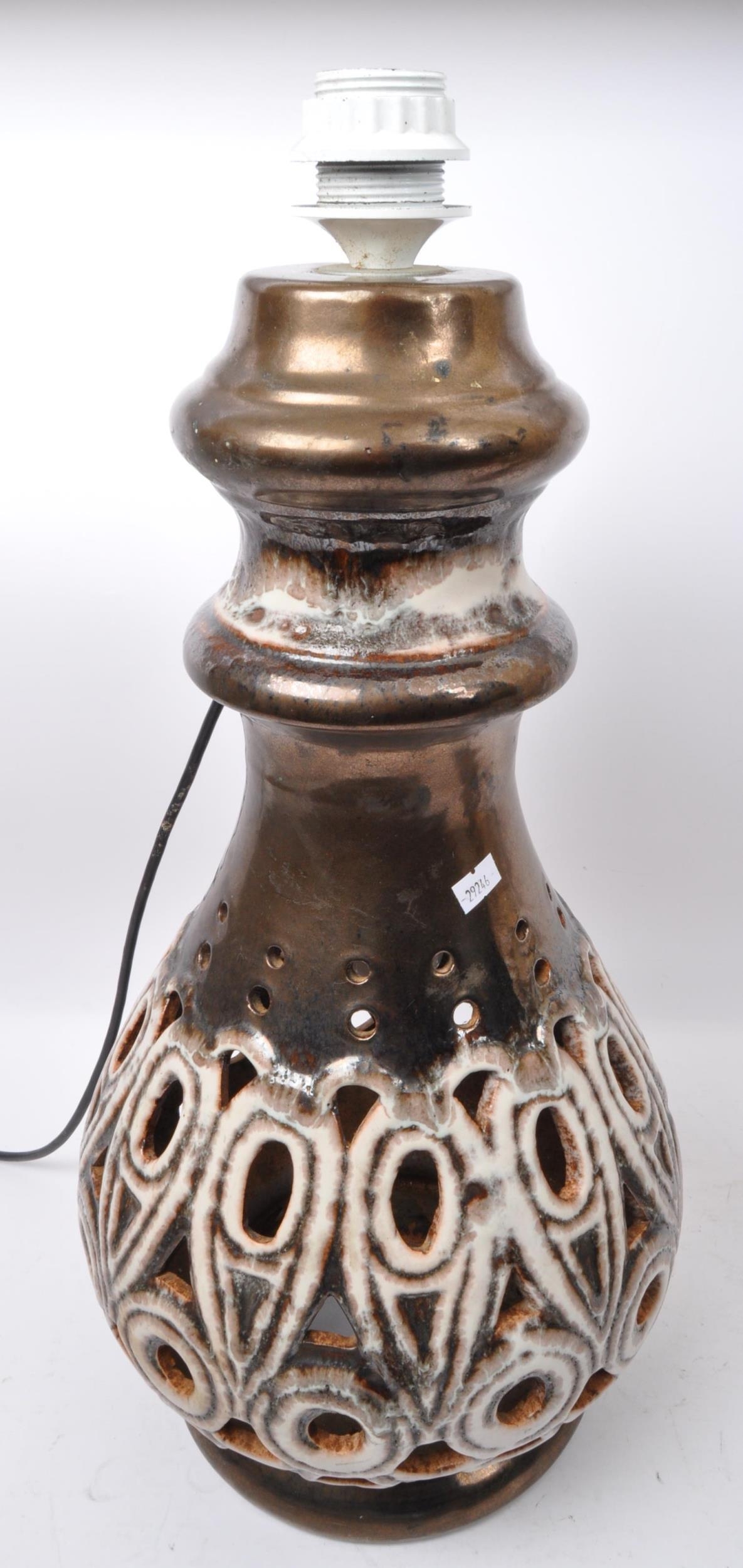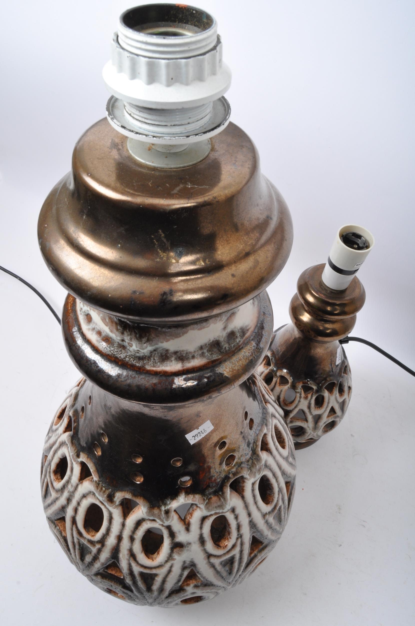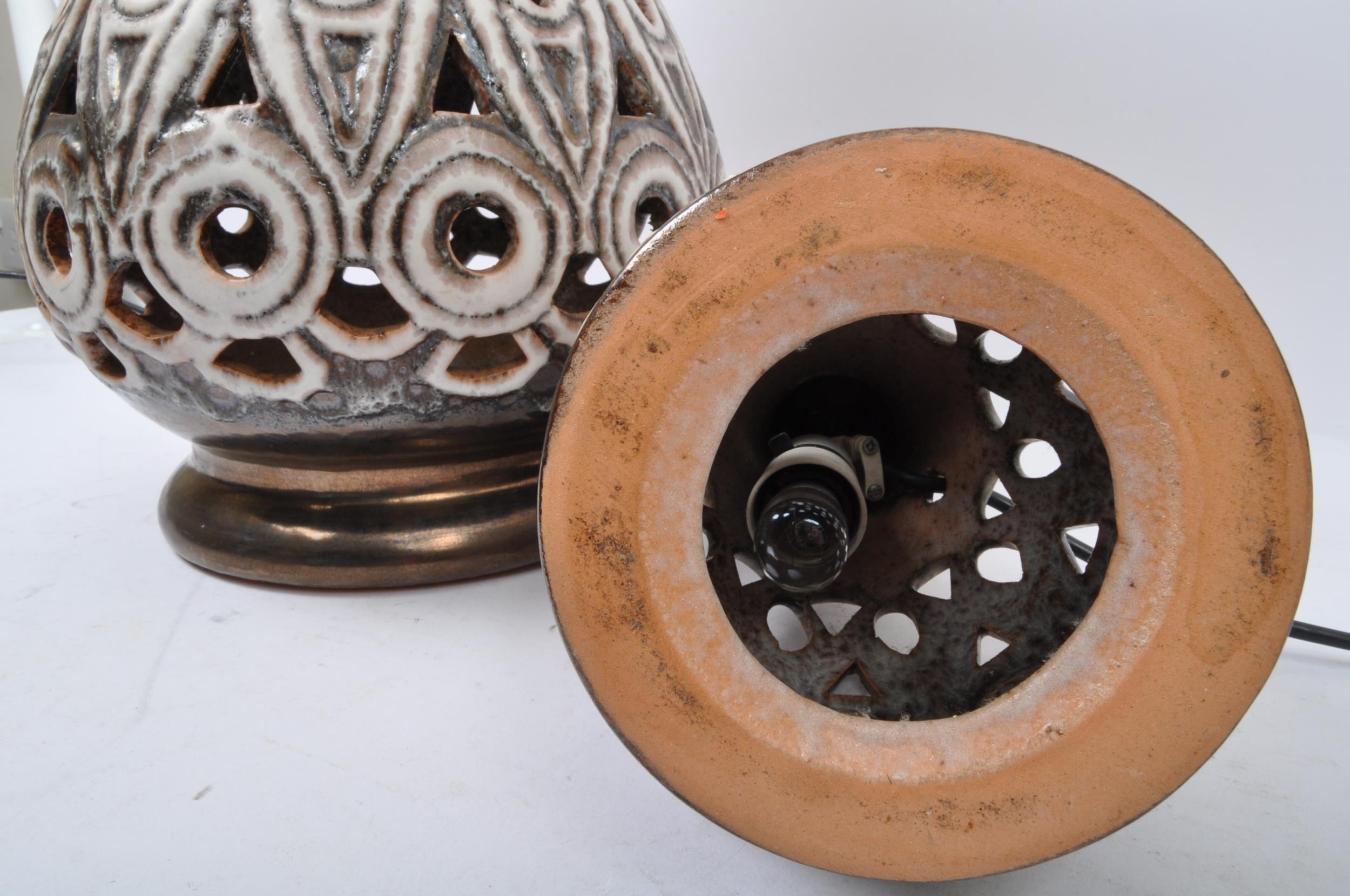 A pair of 20th Century West German style pottery table lamp bases. Having a tiered top into a tapering round repeating geometric pattern pierced body with a glazed finish, with a matching smaller bedside lamp. Largest measures approx. 55cm tall.