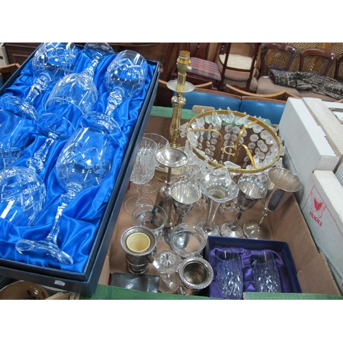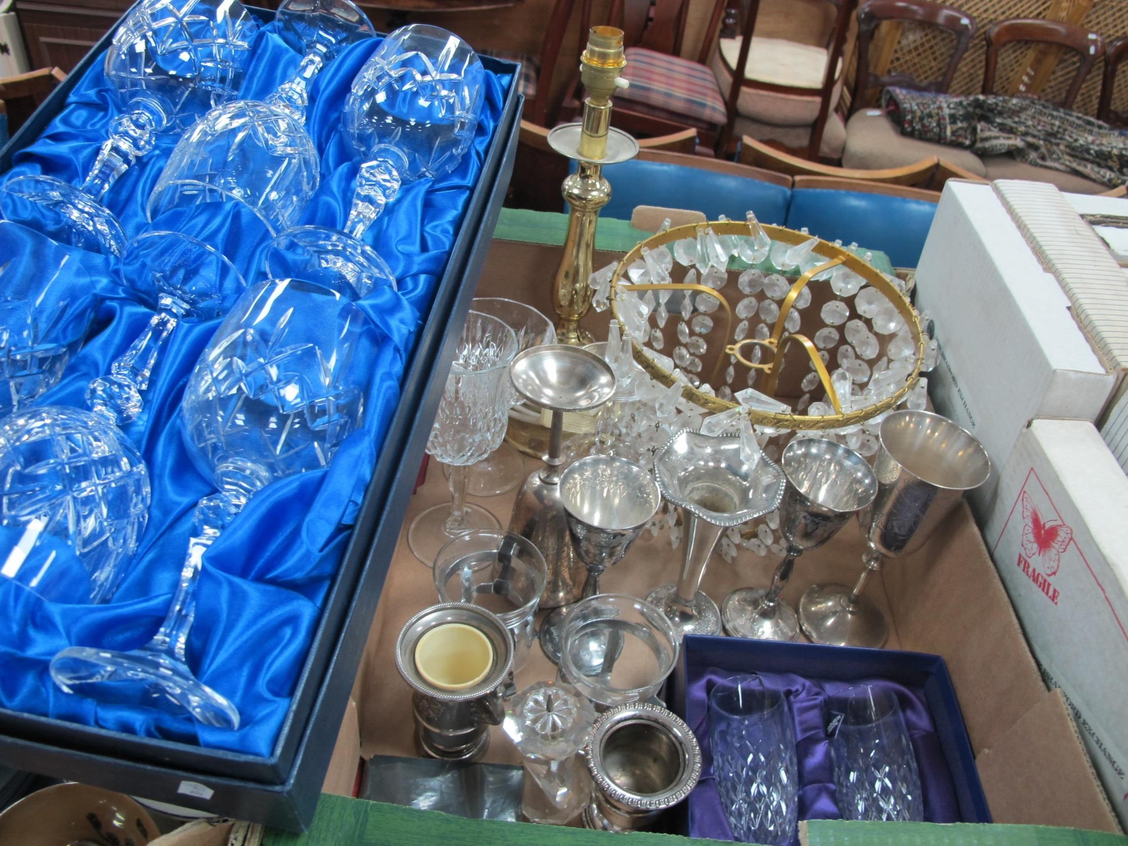 Table Lamp, boxed drinking glasses, plated goblets, candlesticks, etc.