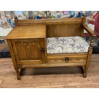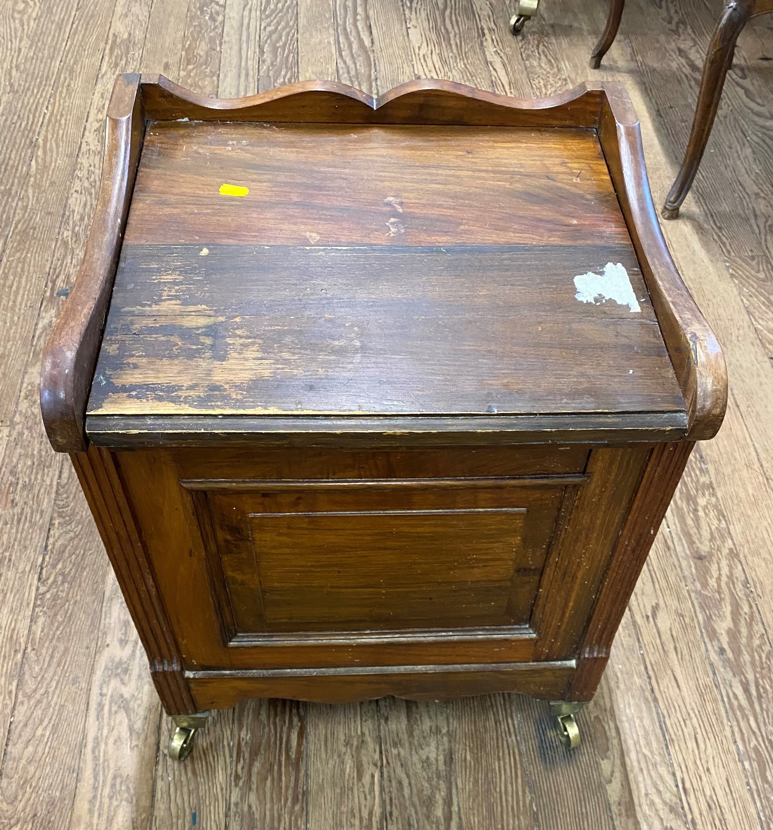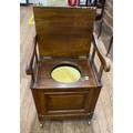 A Victorian Pine Commode. The hinged lid opening to reveal handles. Twin side grips and with a potty. 60cm x 49cm x 44cm closed