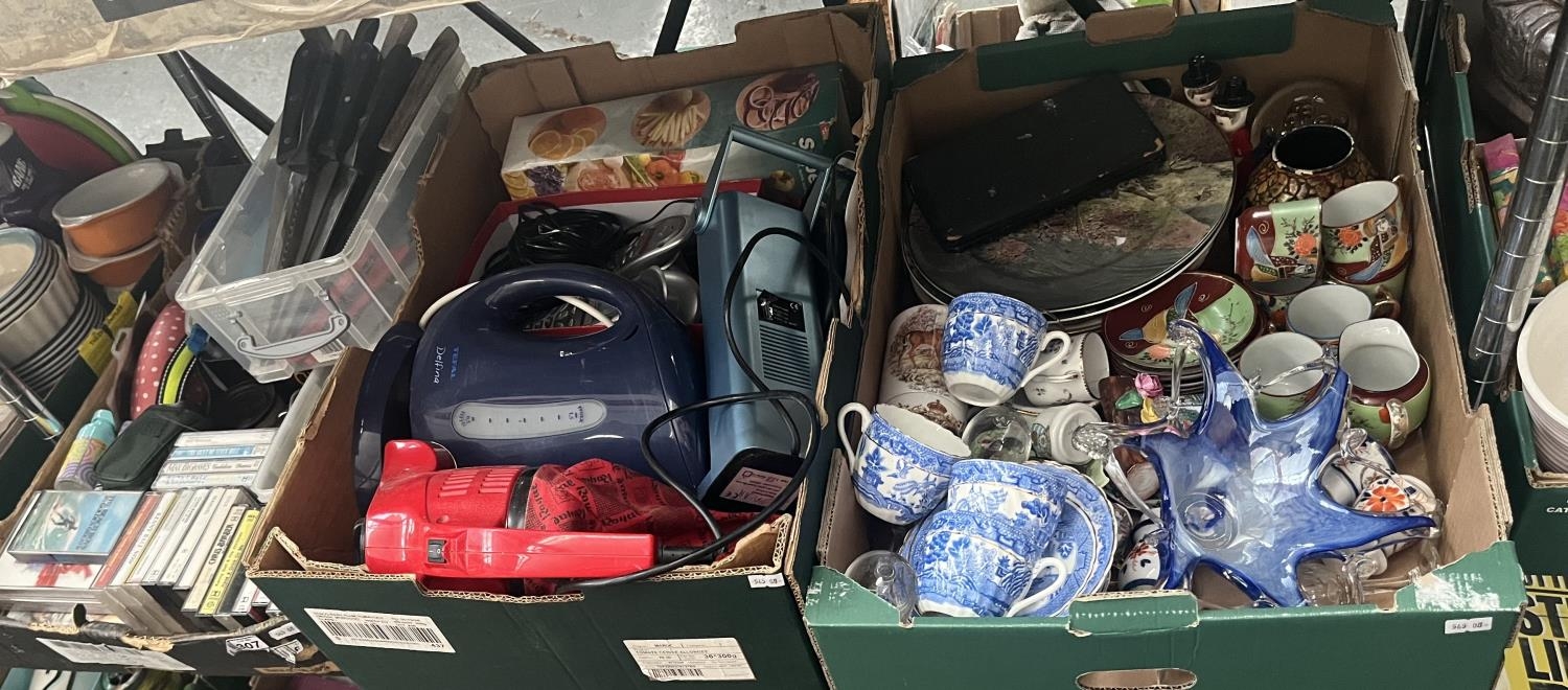 3 Boxes containing a quantity of kitchen knives, Dirt Devil hand vac, and assorted ceramics including oriental