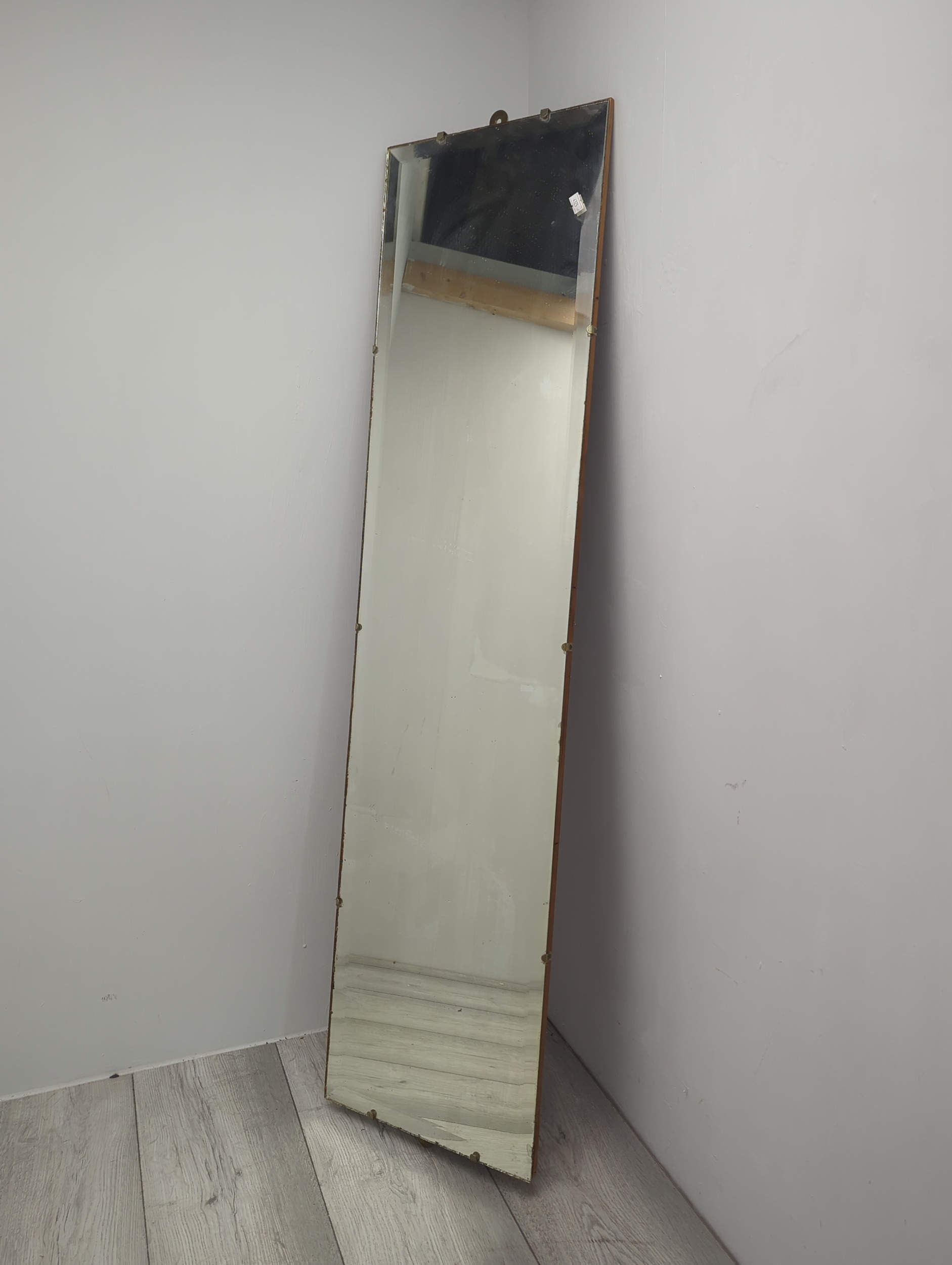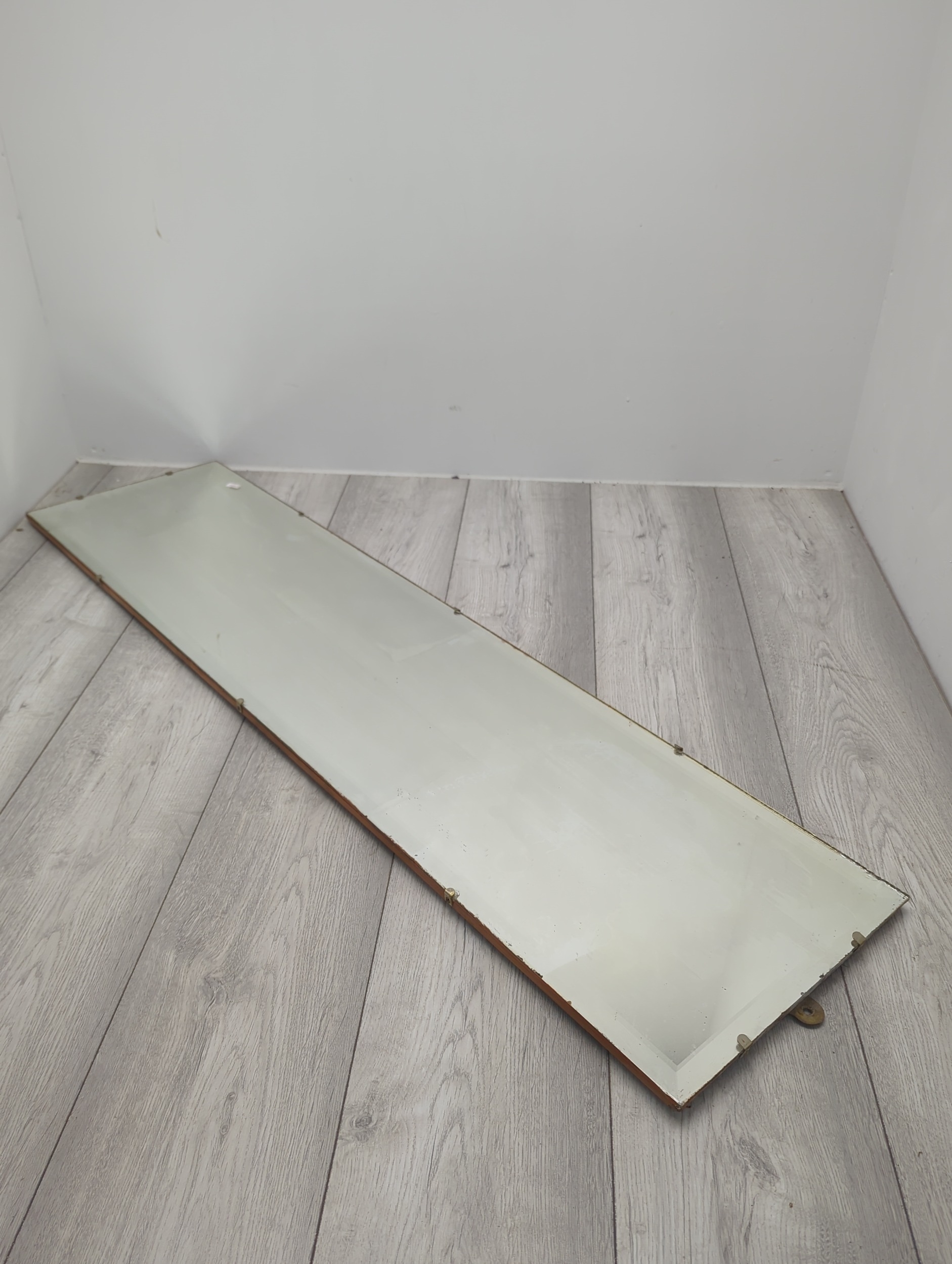 This is a large rectangular wall mirror with a wooden frame, suitable for adding a touch of elegance to any room. The mirror has a sleek design with secure mounting features visible on its sides. The surface appears clear, making it ideal for functional and decorative purposes.