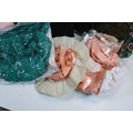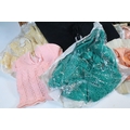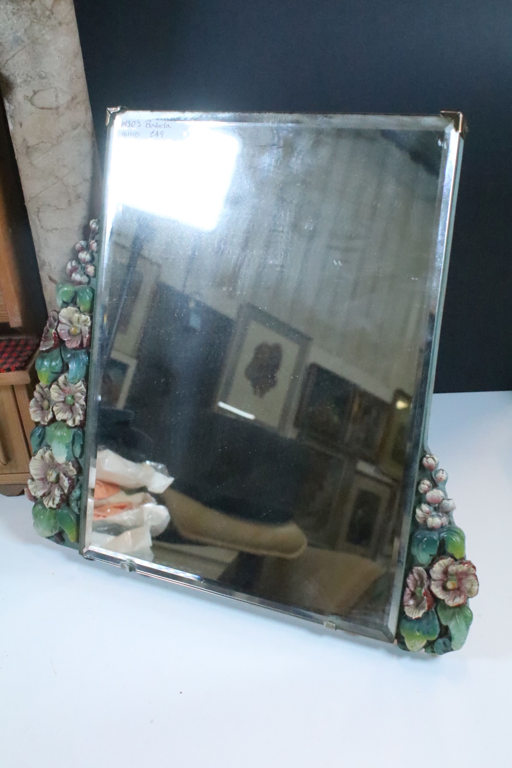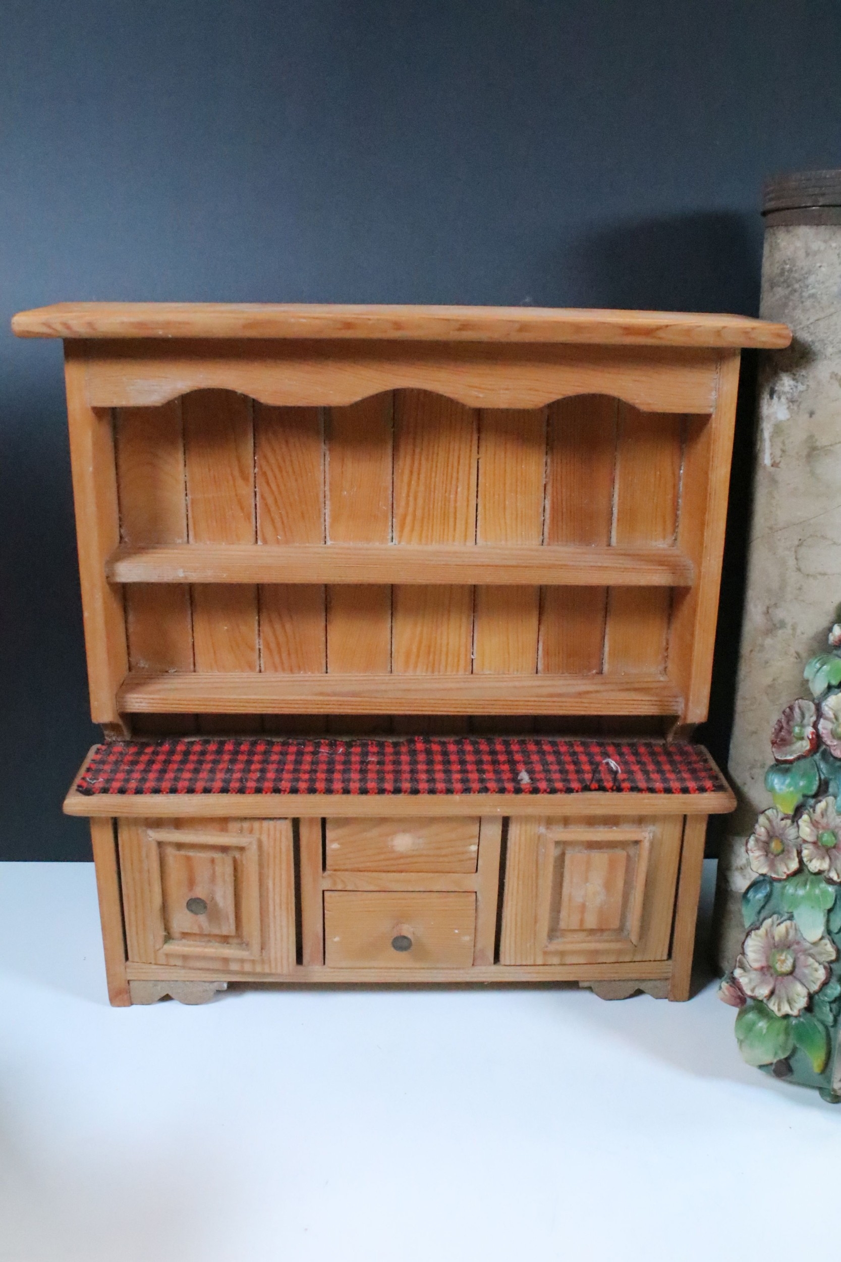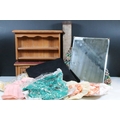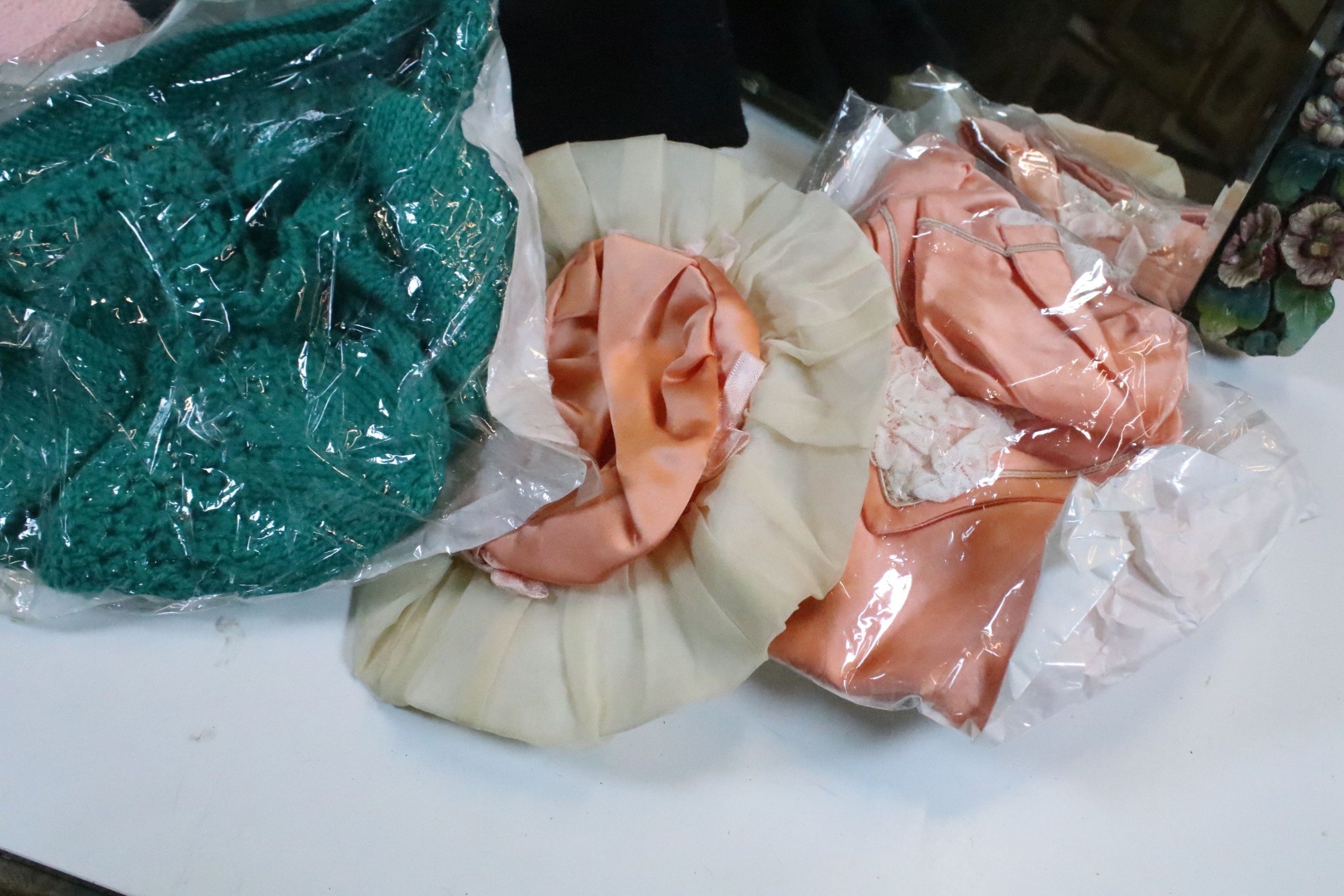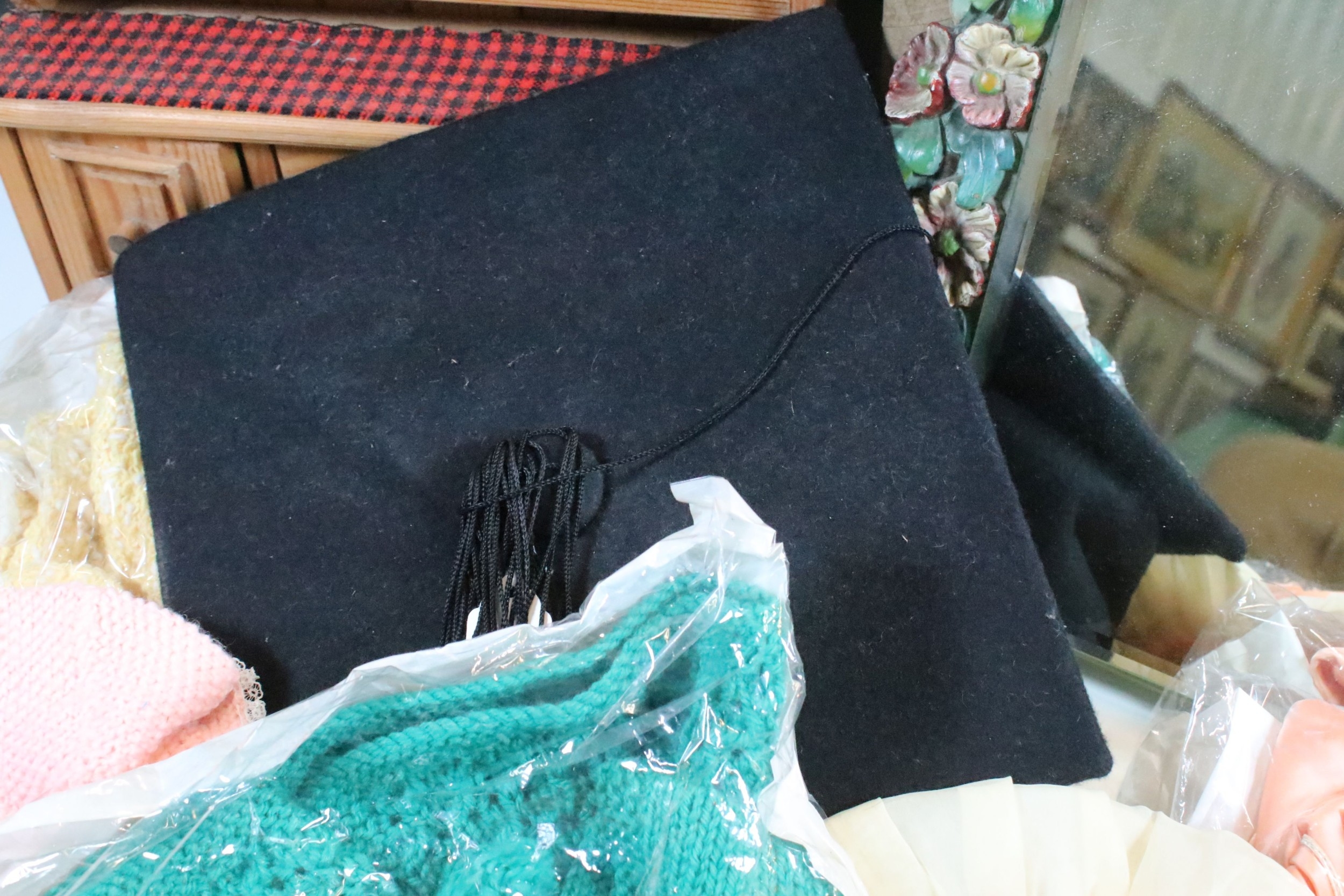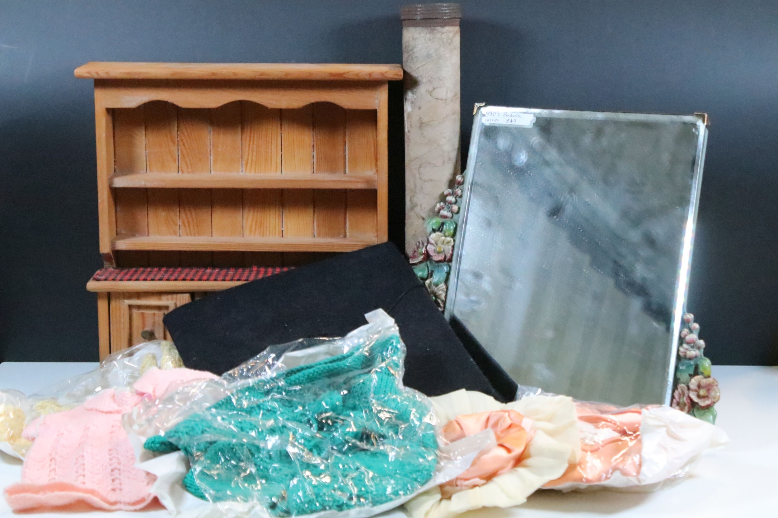 1930's Barbola mirror together with a range of doll's clothes, doll's house dresser, a set of vintage linen with acorn pattern and a mortar board hat, etc (1 box)