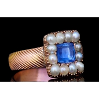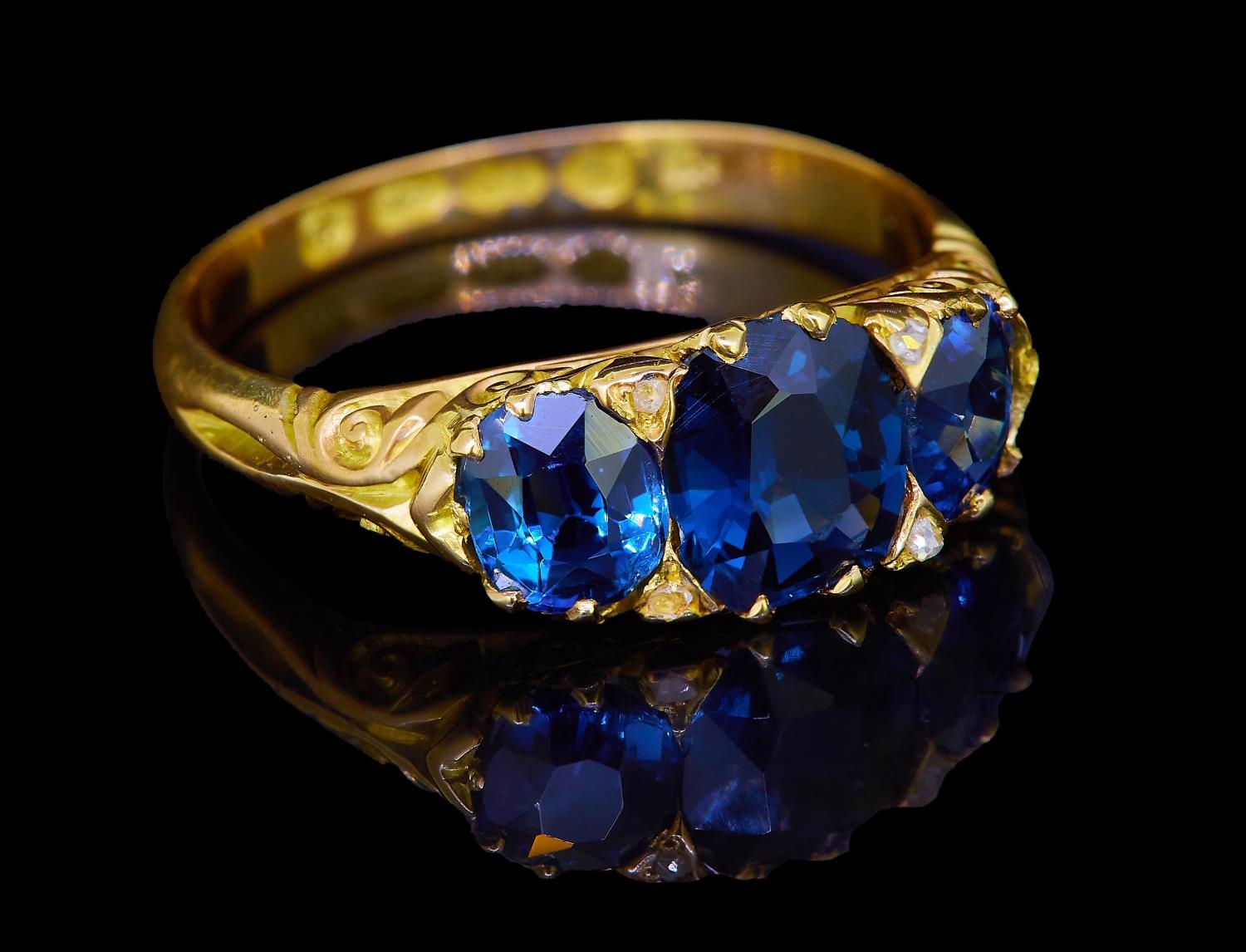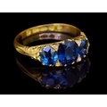 SAPPHIRE AND DIAMOND DRESS RING, in 18-ct gold. Set with 3 blue sapphires totalling approx. 2.50 ct, accentuated with 4 diamonds. The side of the head and part shoulders with scrolling design. Size N 1/2. 3.7 grams.