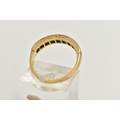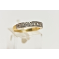 A NINE STONE DIAMOND HALF ETERNITY RING, designed as a graduated line of brilliant cut diamonds in square settings, with engraved scrolling decoration to the gallery, stamped 18ct, ring size M, approximate weight 3.6 grams (condition report: would benefit from a clean and polish, some settings and the engraved decoration show wear)
