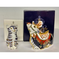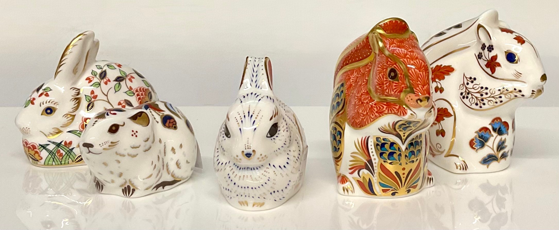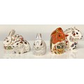 A Royal Crown Derby paperweight, Red Squirrel, gold stopper, 8.5cm high, printed mark in red; others, Squirrel, gold stopper, 8.5cm, printed mark in red; Meadow Rabbit, Collectors Guild exclusive, gold stopper, 7cm high, printed mark; Bunny, Collectors Guild exclusive, gold stopper, 7cm high, printed mark; Bank Vole, Collectors Guild exclusive, gold stopper, 7.5cm long, printed mark (5)