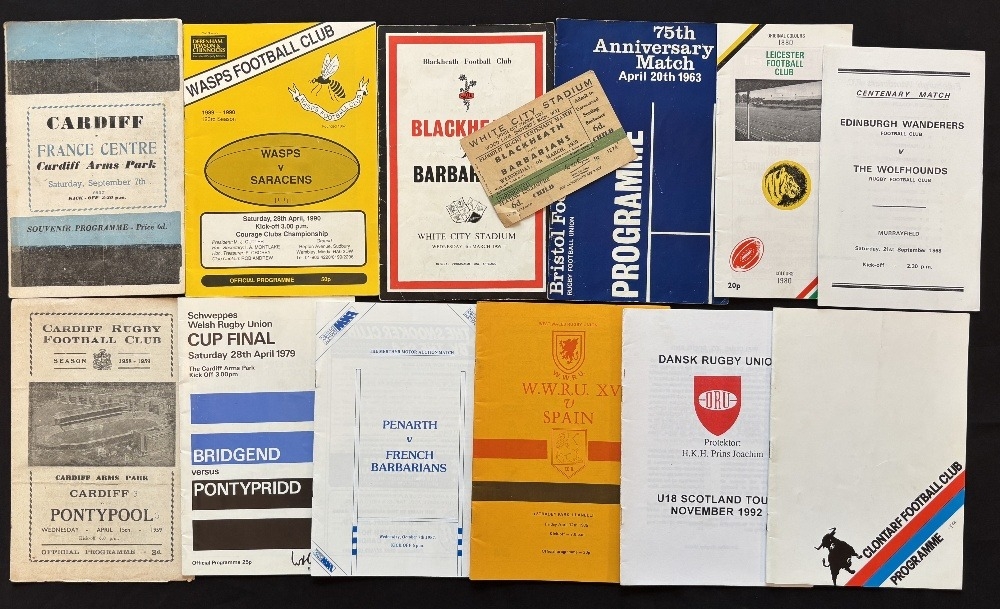 1957-92 ‘Special’ Rugby Programmes in the British Isles Selection A (12+): 1959 Blackheath v Baabaas at White City, Floodlit Centenary match, plus scarce ticket; Bristol 75th v Int’l XV 1963; Wasps signed by team v Saracens 04/90; Eng U-23s v Holland at Leicester 1981; Cardiff v France centre 1957 and v Pontypool 04/59; WRU Final Bridgend v Pontypridd 1979; Penarth v French Barbarians 1987; WWRU XV v Spain 1985; Edinburgh Wands v Irish Wolfhounds 1968 Centenary; Danish RU on Scottish Tour U-18s 1992; Clontarf v West of Scotland 1982. G/VG