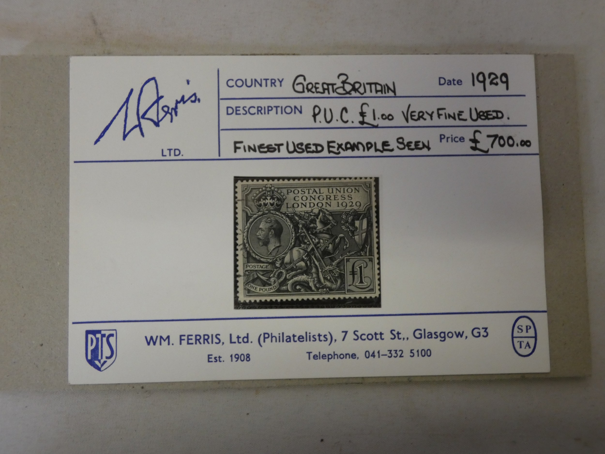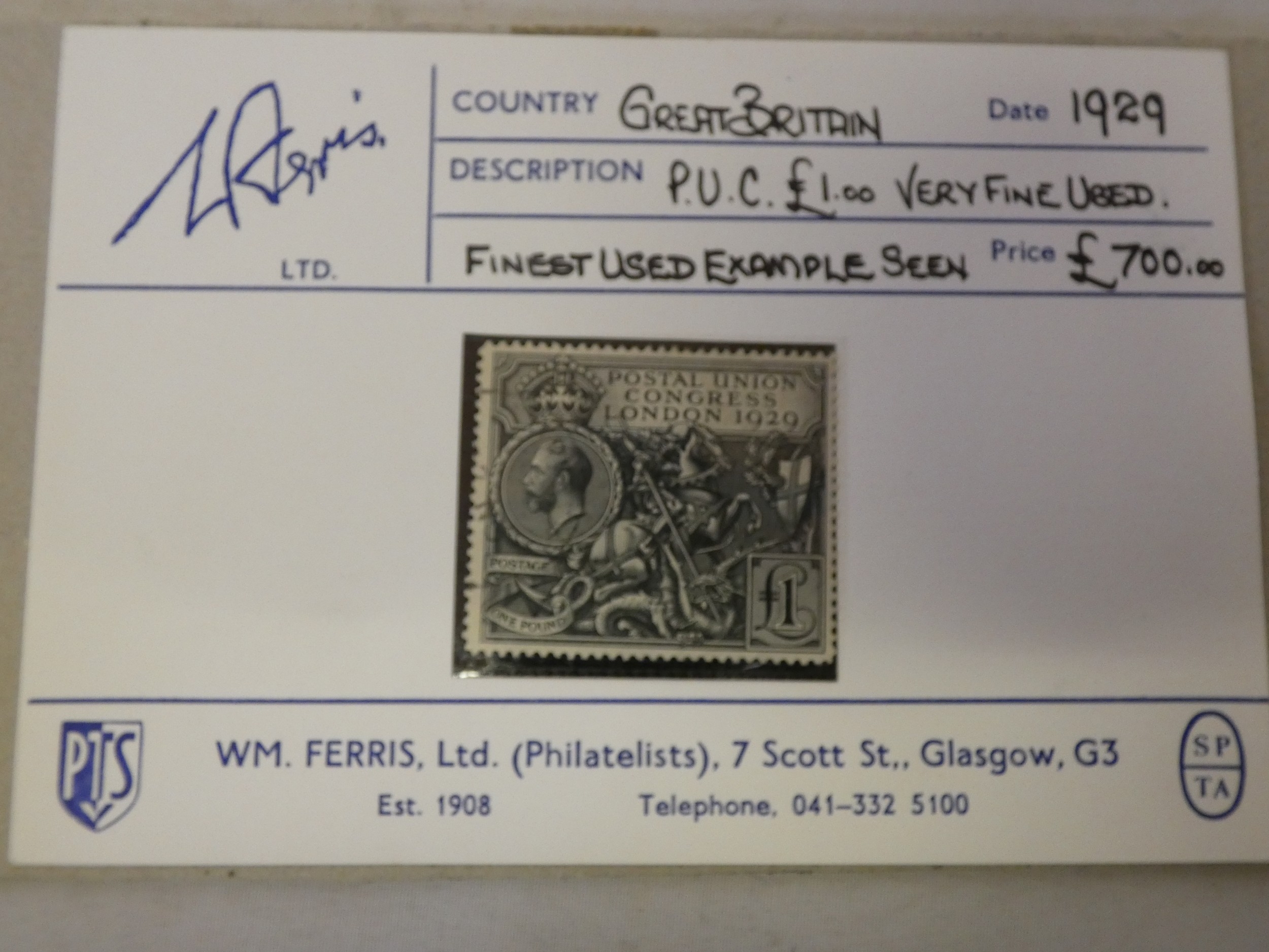 Great Britain 1929 PUC (Postal Union Congress) £1 very fine used stamp, retailed by Wm Ferris Ltd (Philatelists), 7 Scott St, Glasgow, retail price £700m marked 'Finest Used Example'.