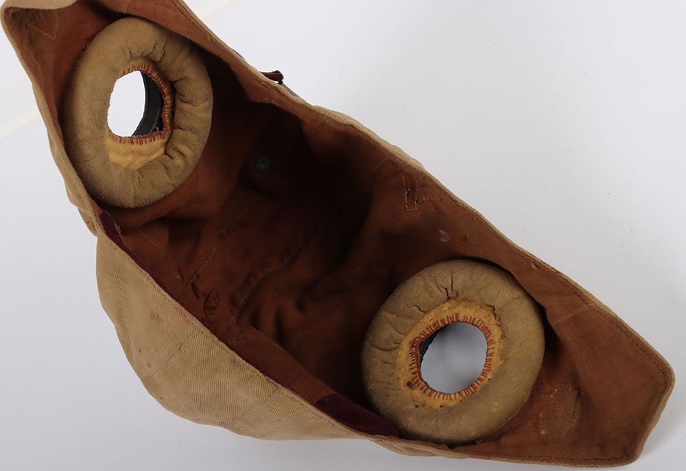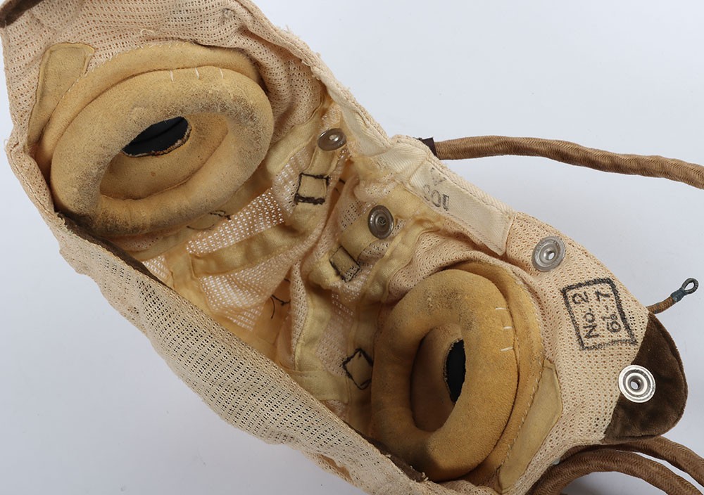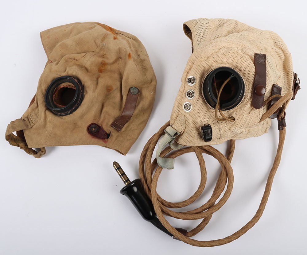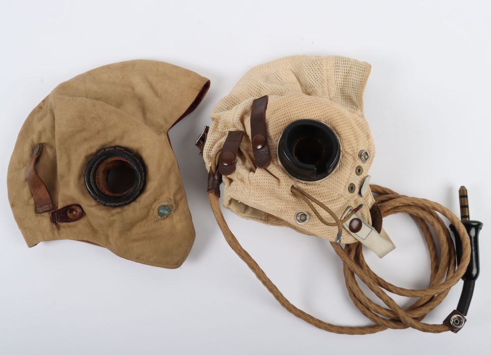 WW2 RAF E Type Flying Helmet. A good unissued example of an E Type flying helmet as used by the RAF in wartime ah post war periods. Good clean aertex material with a new internal wiring loom, no recievers. A second helmet thats included is of an unkown type constructed in cotton drill with raf type reciever cups. Age related wear and staining. Two good flying helmets for display.