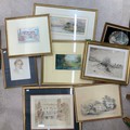 A collection of eight pictures, to include a watercolour portrait, three watercolour landscapes, two architectural pictures, and a mother and child scene.