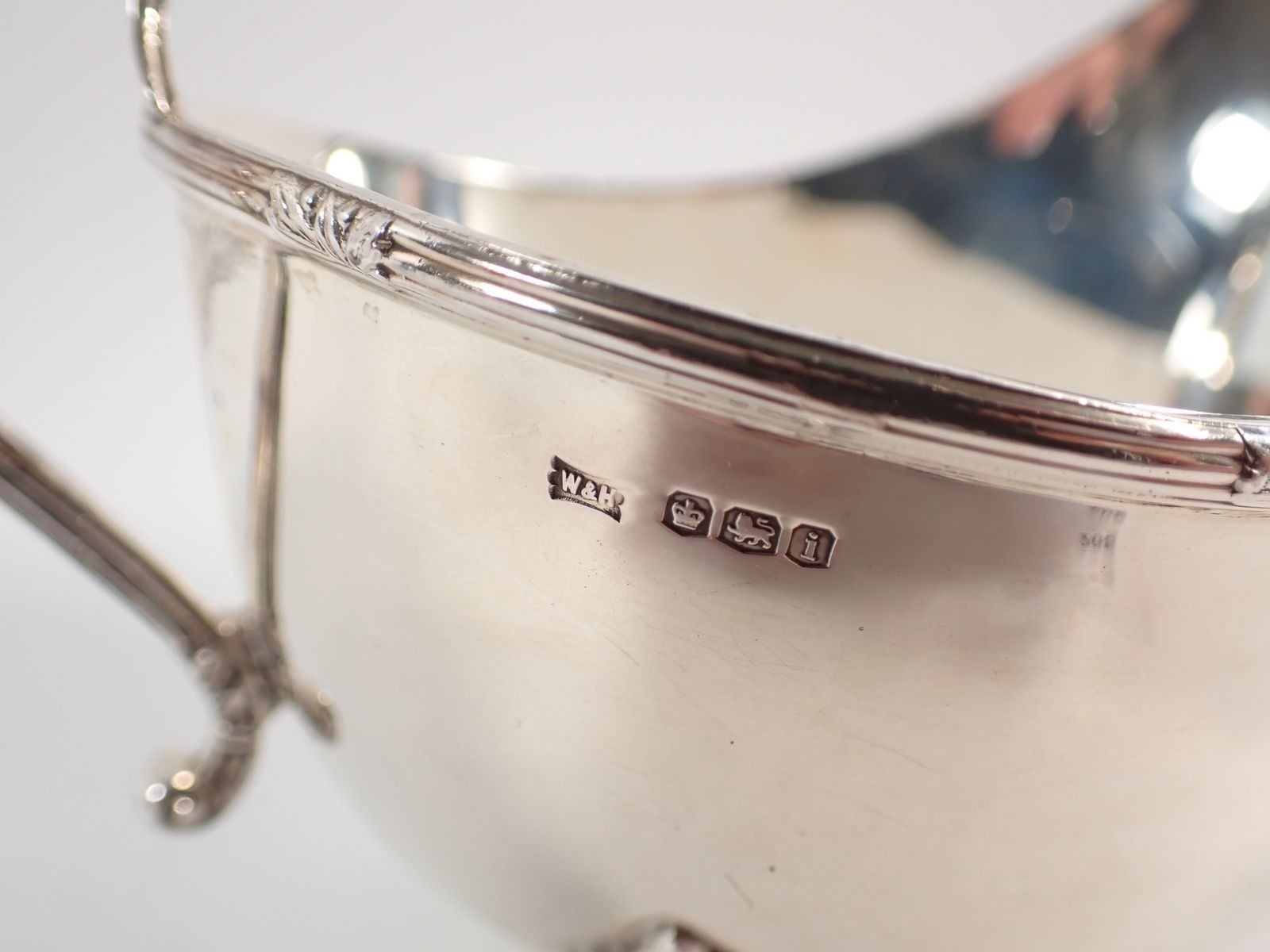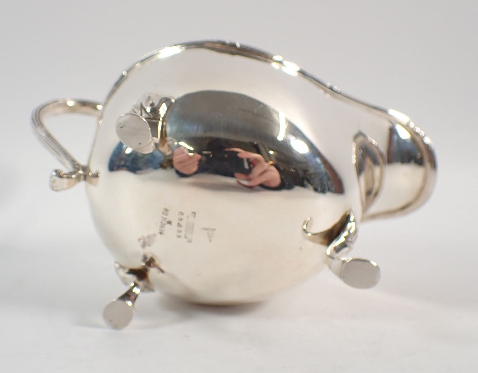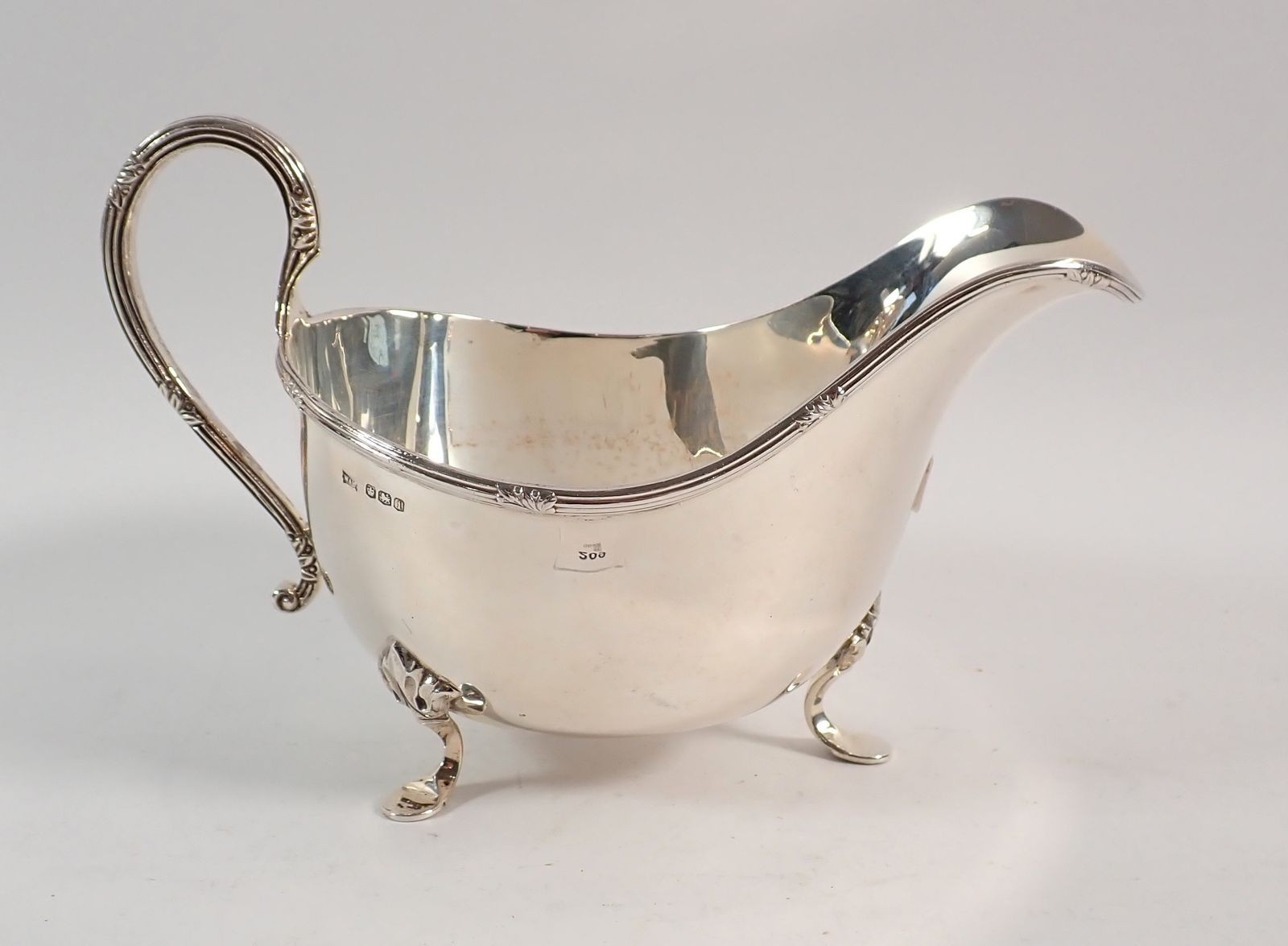 A silver sauce boat with three foliate pad feet, Walker & Hall, Sheffield 1926, 148g