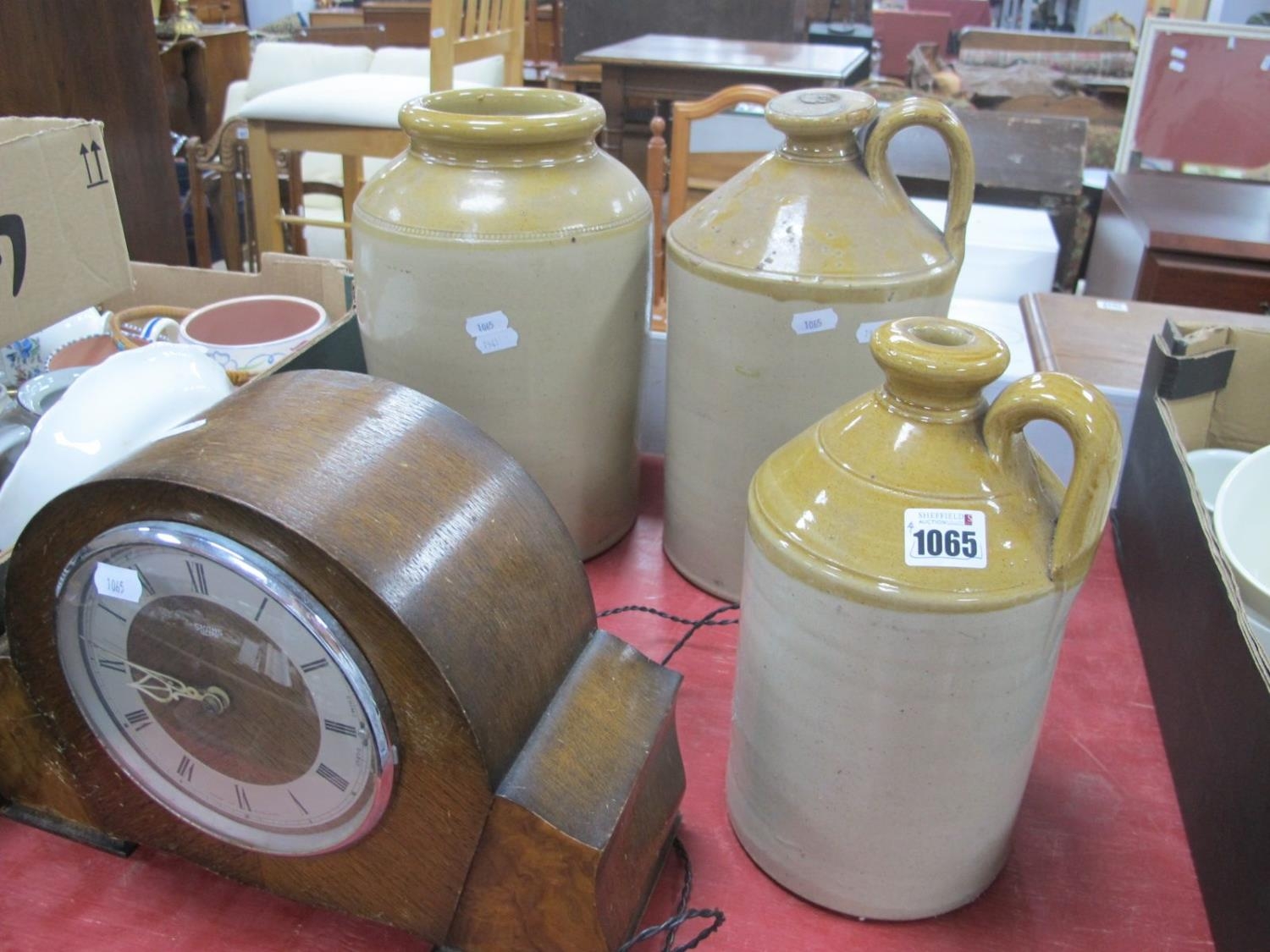 Two Stoneware Flagons and Jar, 29cm high; Smiths mantel cloc...
