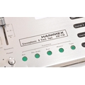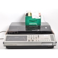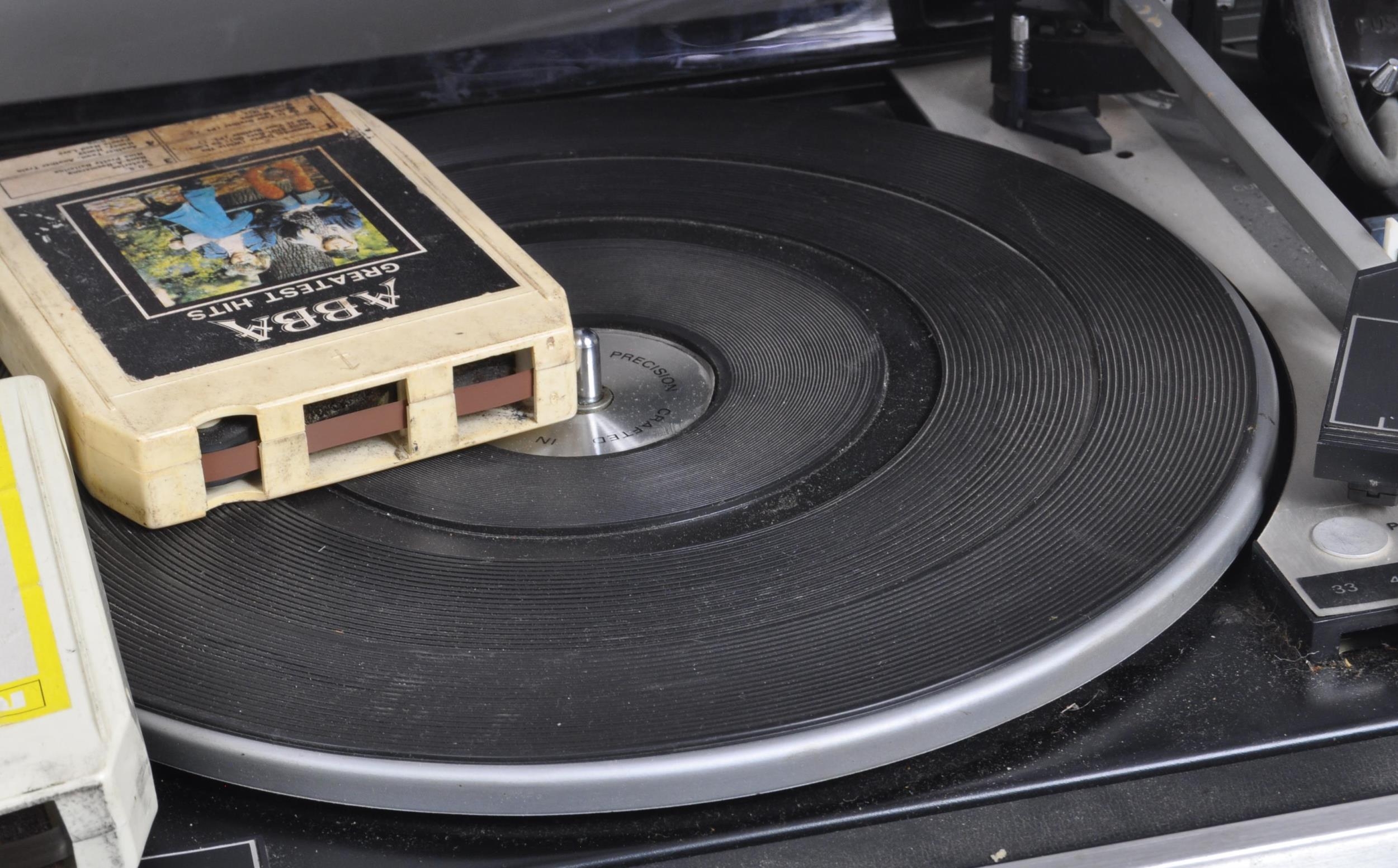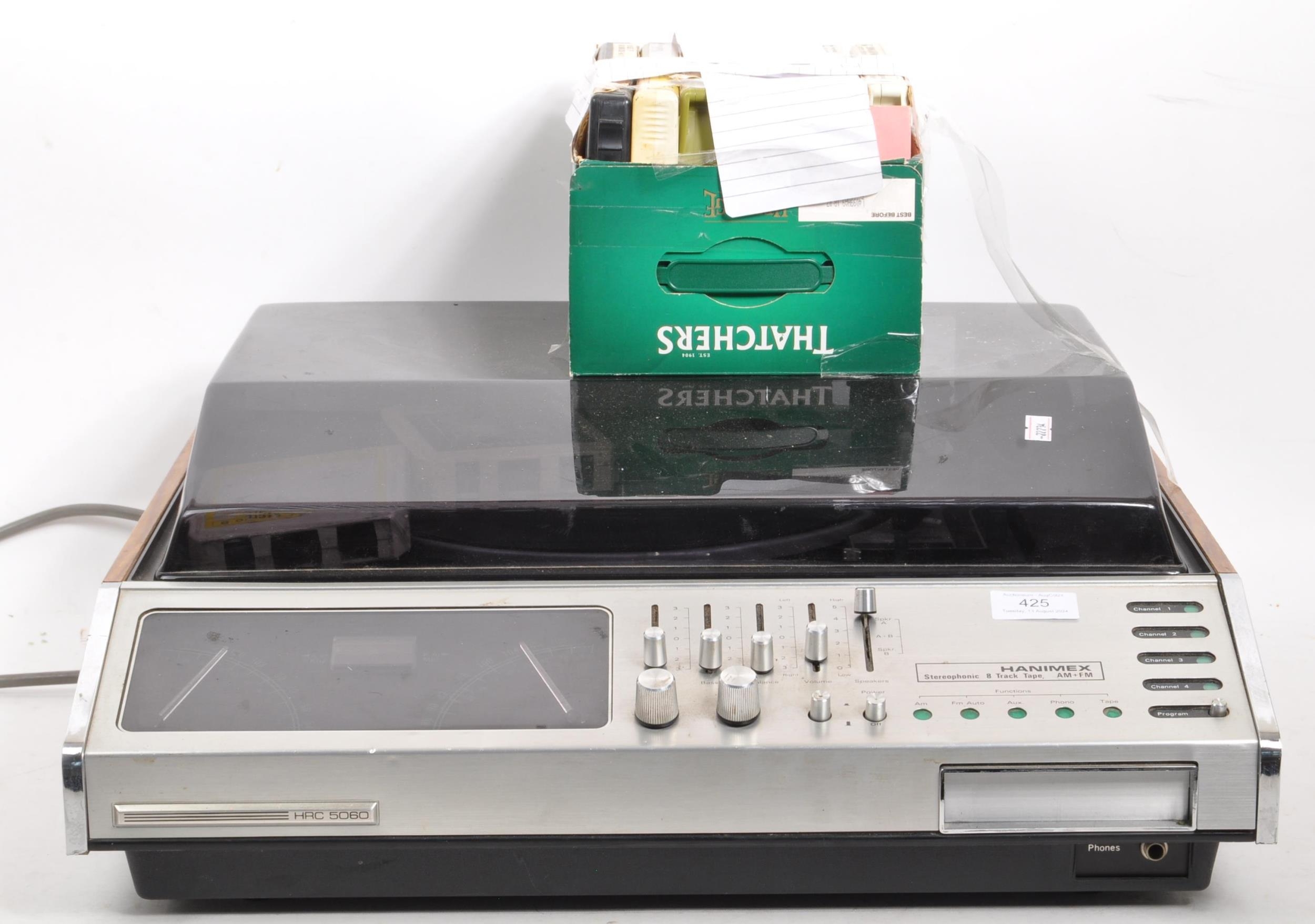 Hanimex stereophonic eight track tape & AM - FM player. With BSR P128R record player turntable deck and tapes. With a pair of speakers. Speakers measure 38cm tall.