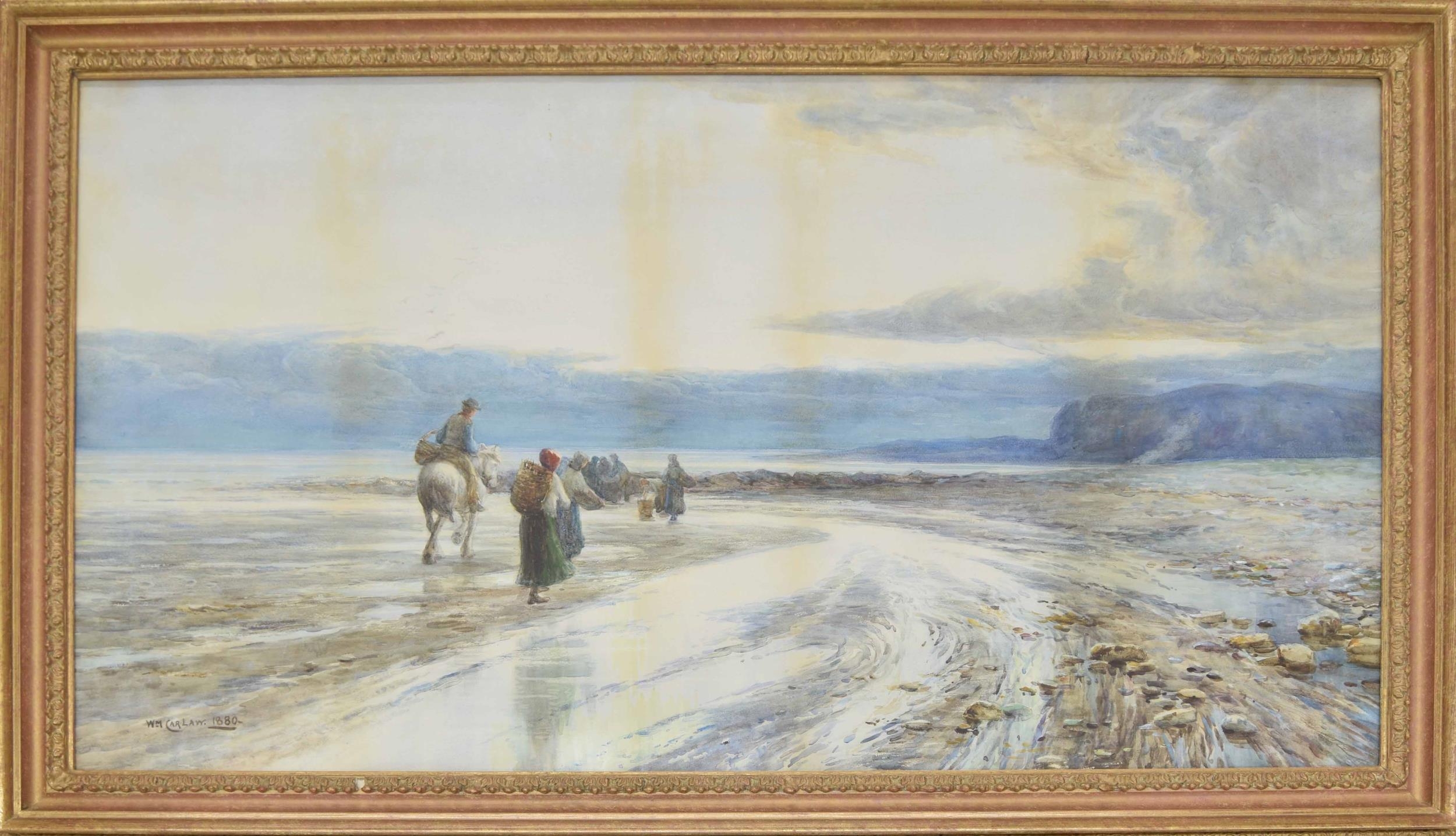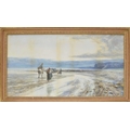 William Carlaw RSW., (1847-1889) - "Day that glides by amidst unfinished toil", beach scene at low tide with figures carrying baskets of fish, a man on horseback nearby, signed and dated 1880, pencil and watercolour, 26" x 47"
