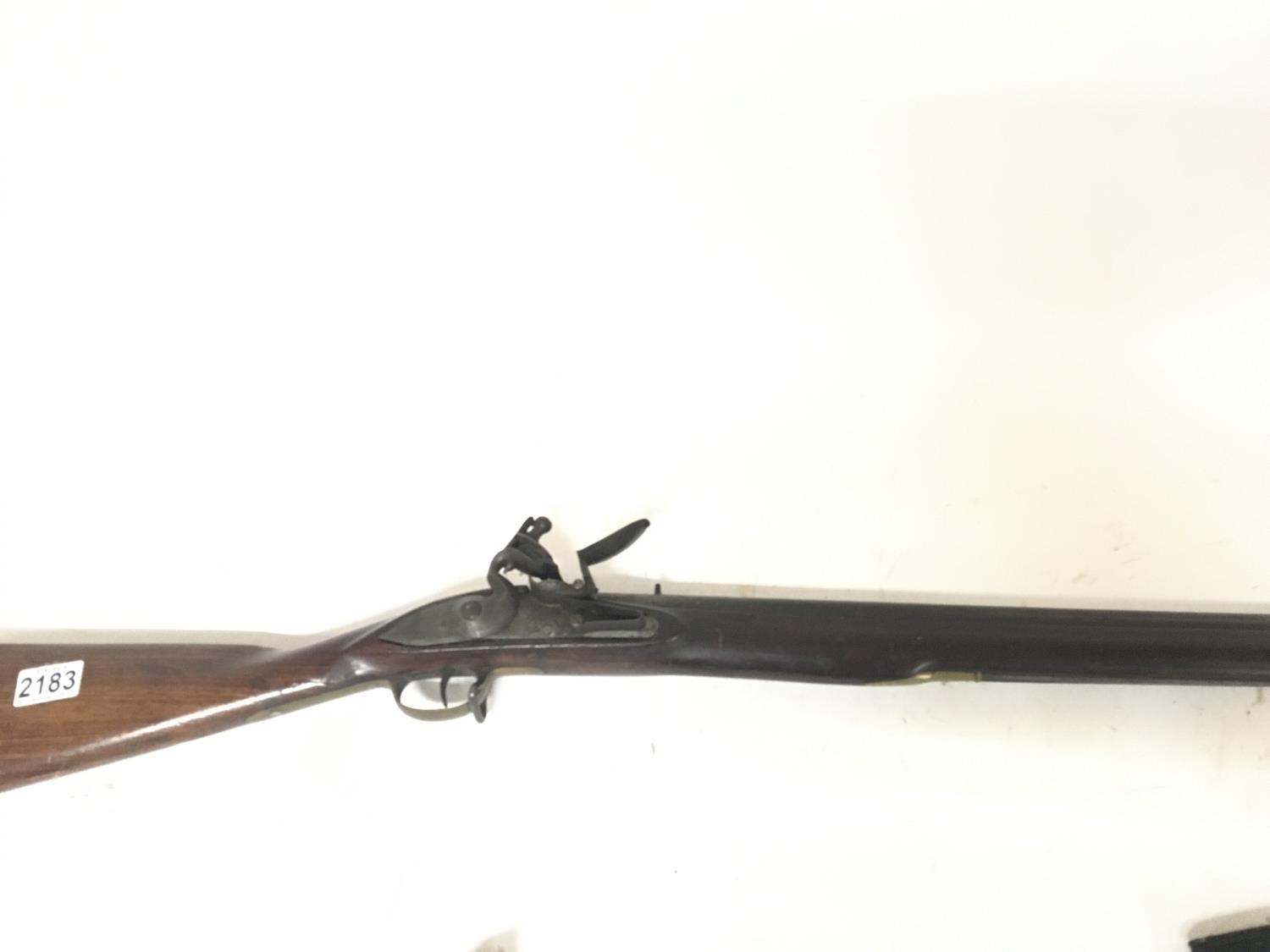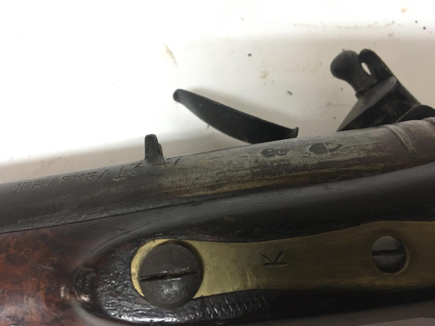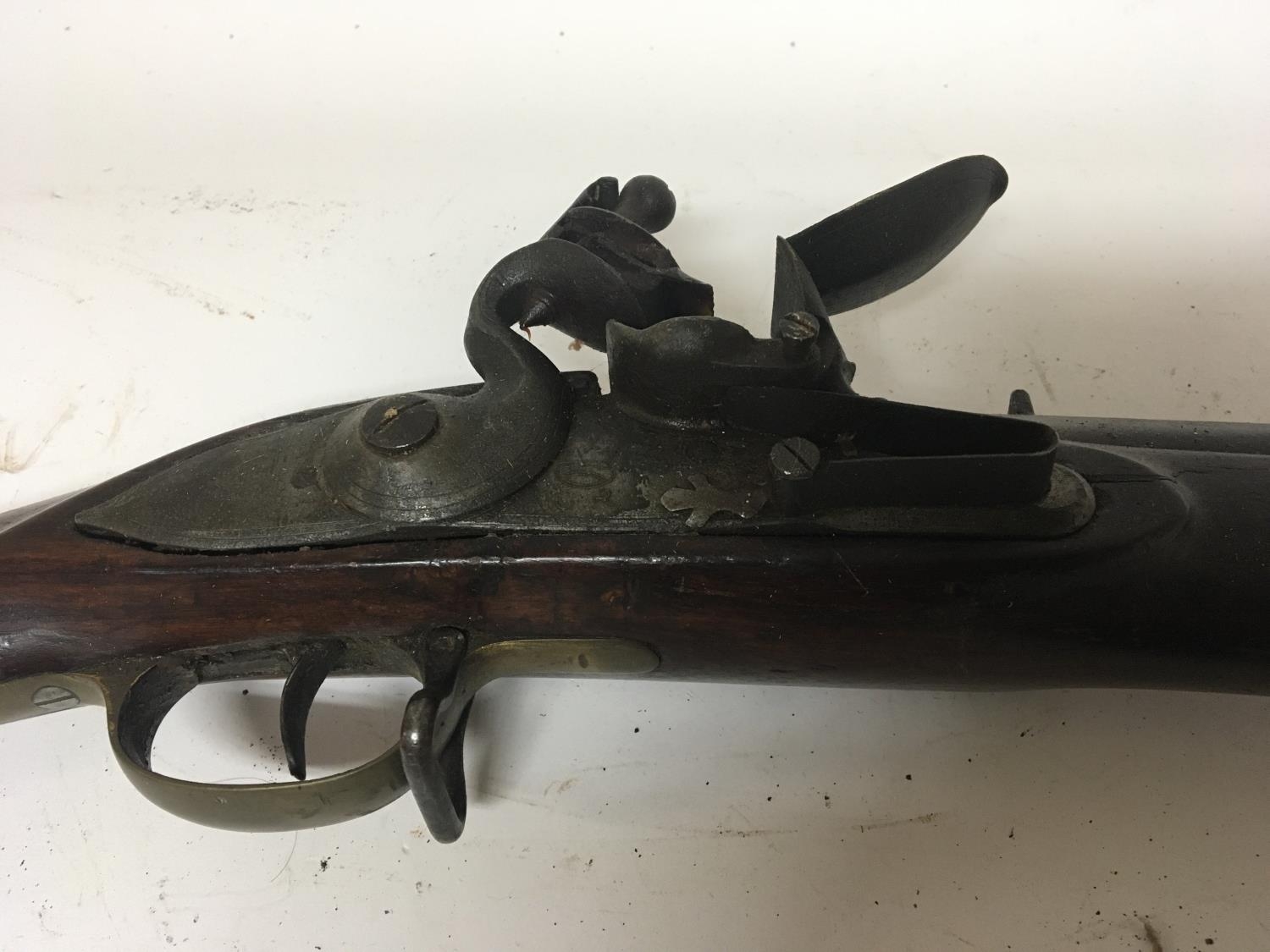 A George lll service flintlock musket rifle the action with crown marks barrel with further marks brass fittings walnut stock length 140cm