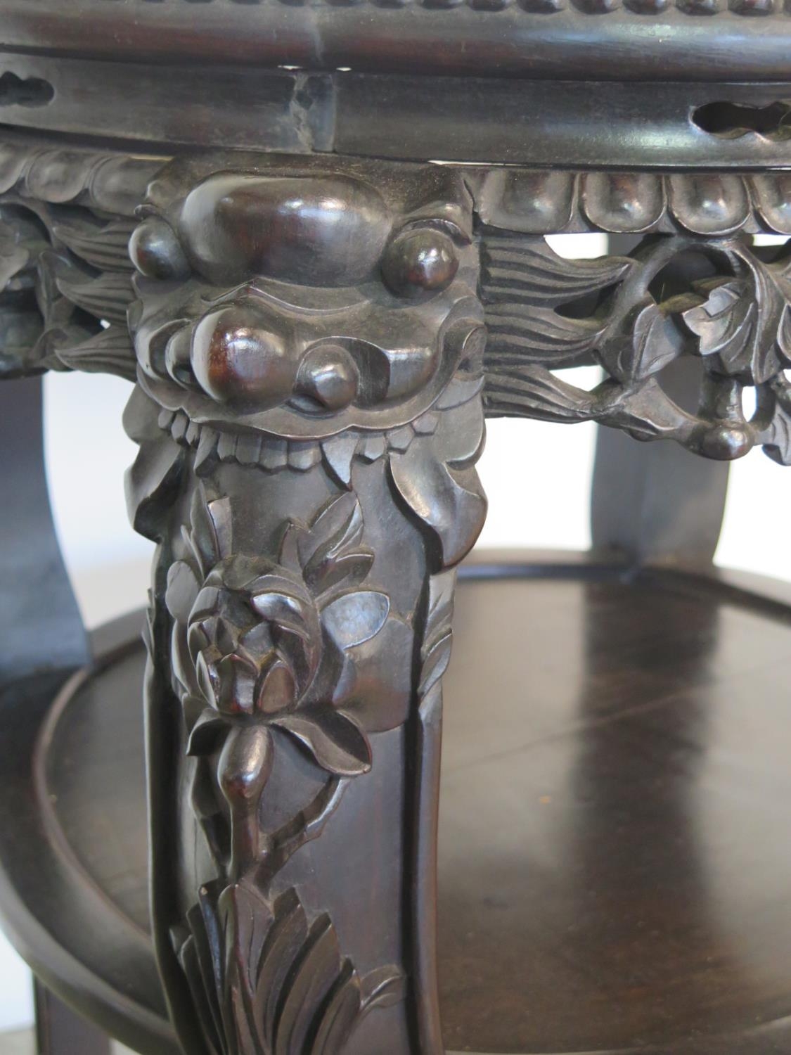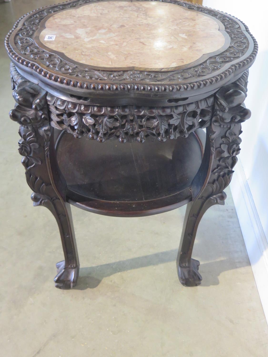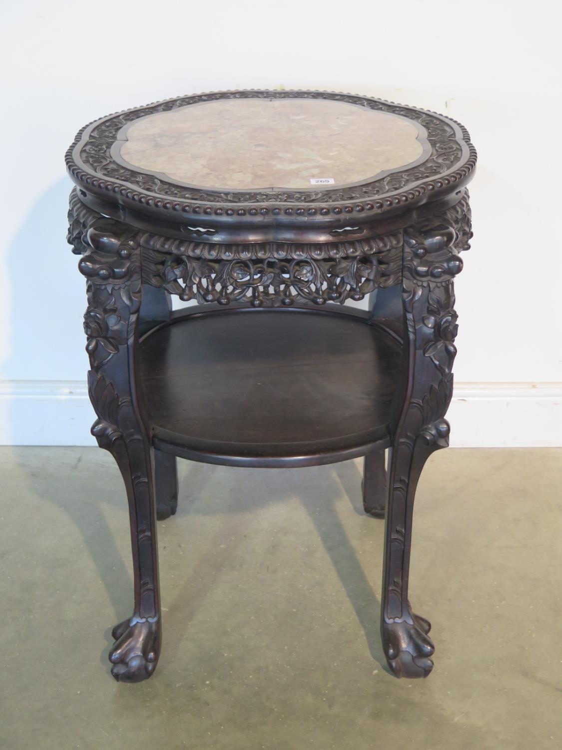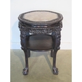 A tall Oriental carved hardwood marble top jardiniere stand with under tier, with good colour and in good condition H81cm x W70cm