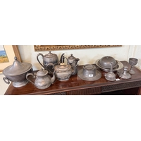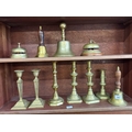 Two pairs of brass candlesticks together with two desk bells, three hand bells and further candlesticks