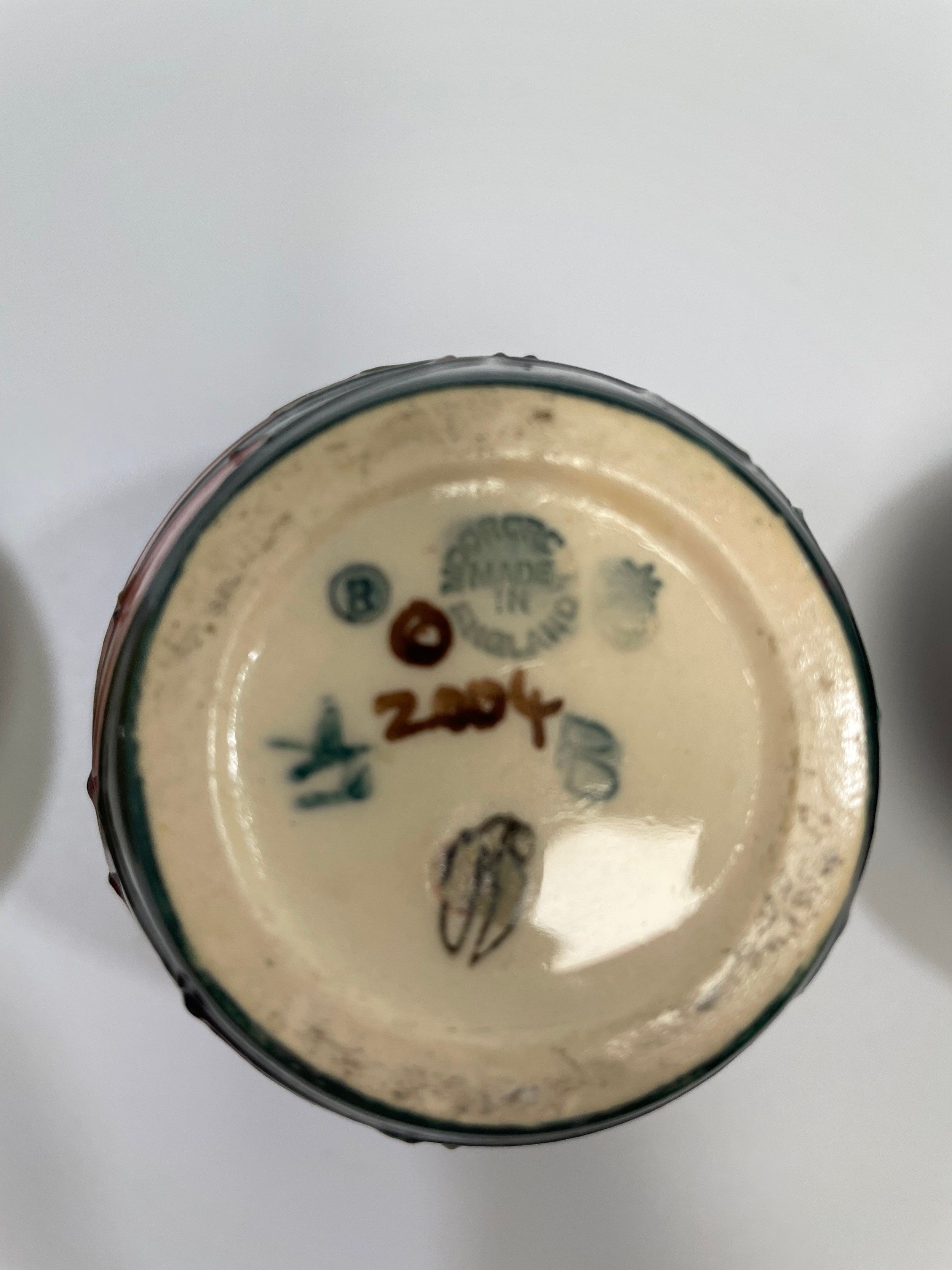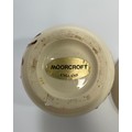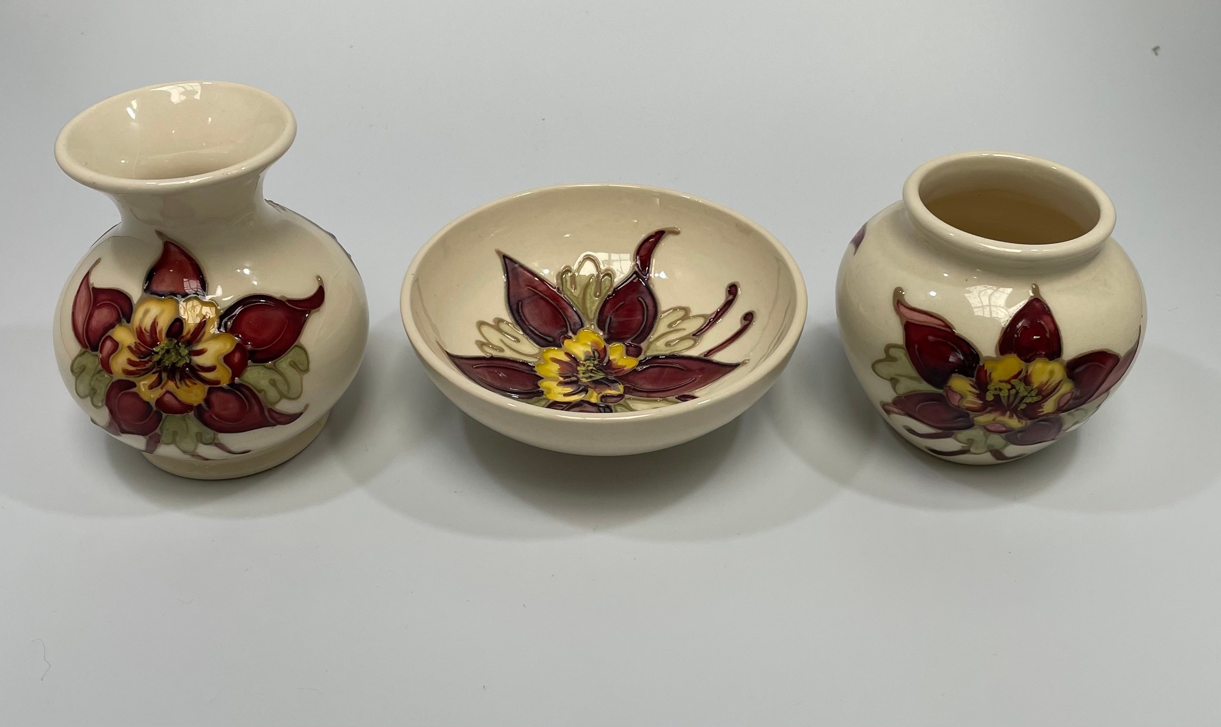 Six Moorcroft pottery items including two various small vases and a dish decorated with deep red and yellow flowers to ivory ground and three further small vases including one decorated with a dragonfly by Emma Bossons (6)