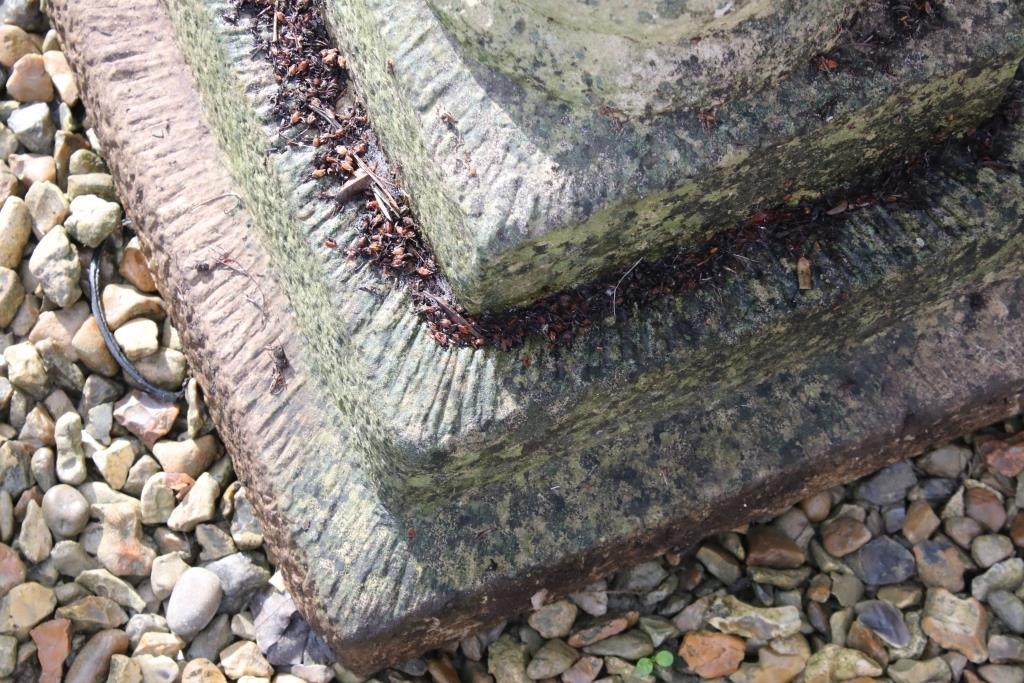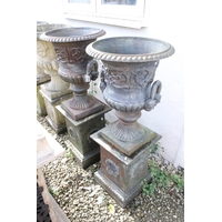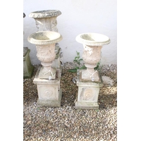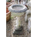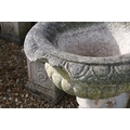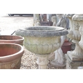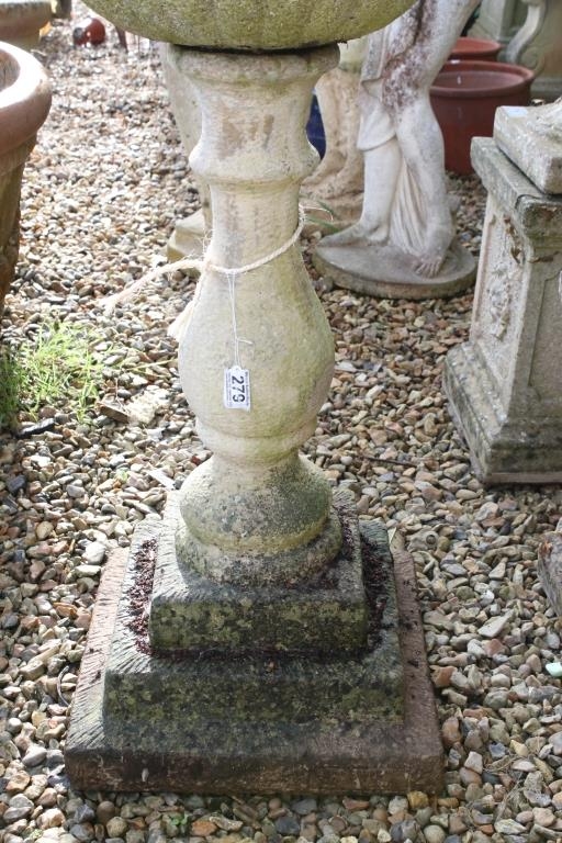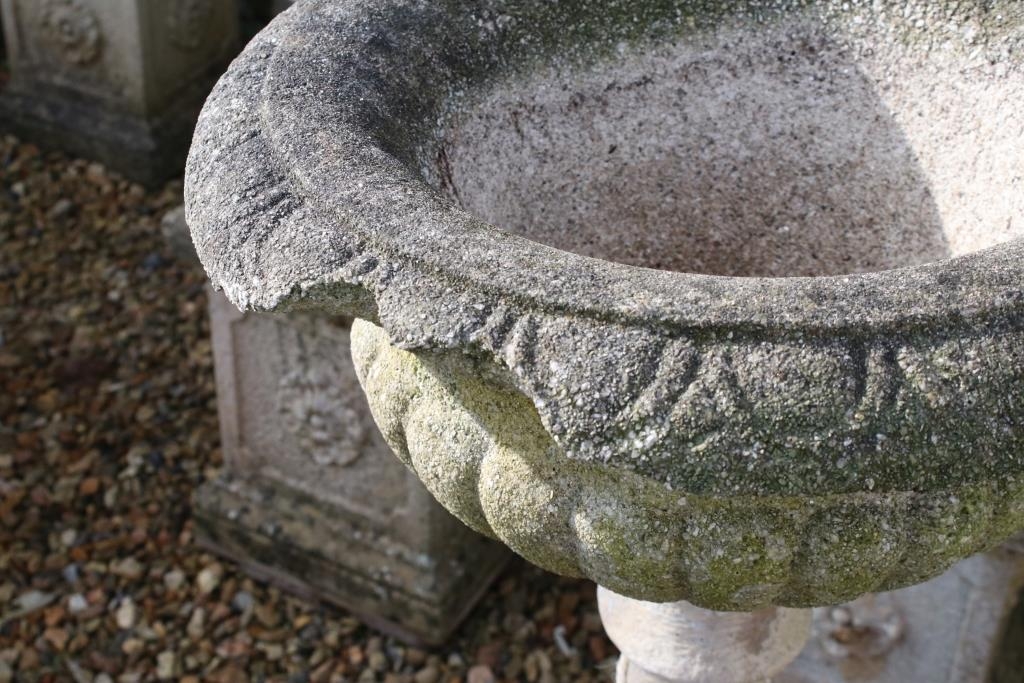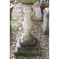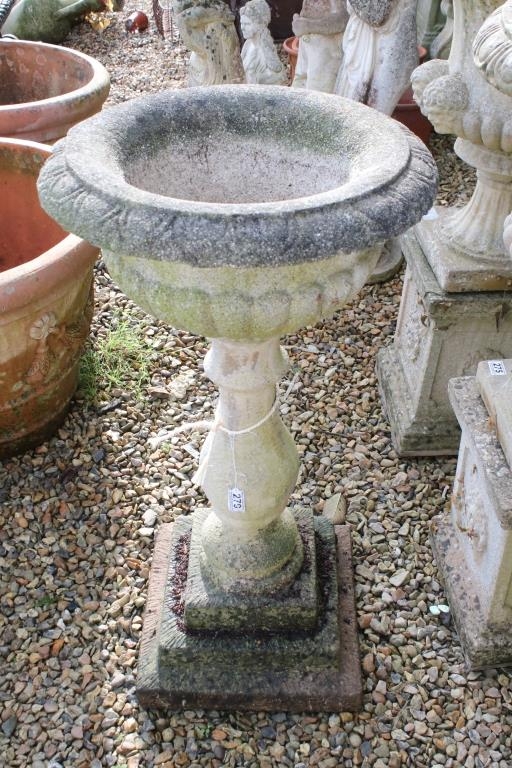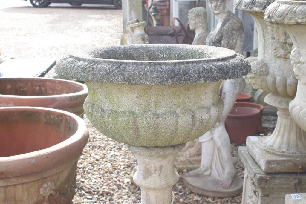 Reconstituted stone garden urn, the bowl of shallow form, raised on a baluster column base. (Measures approx 97cm high)