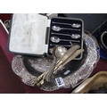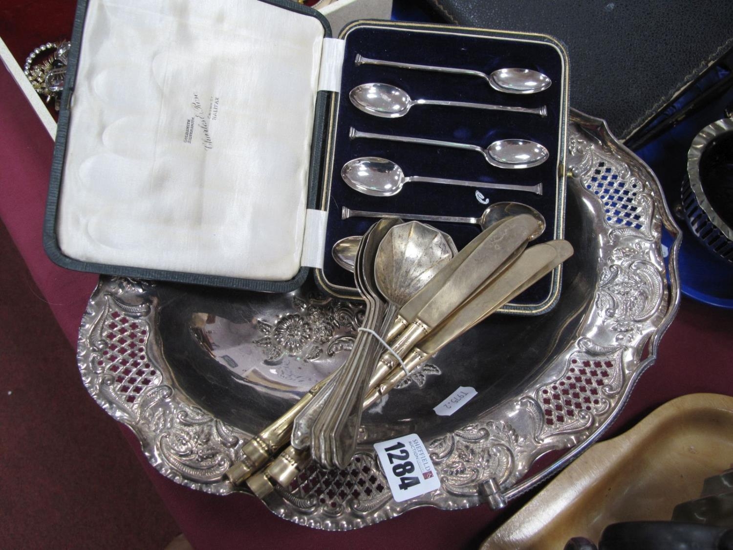 A Set of Six Silver Teaspoons, Sheffield hallmark 1922 (cased). James Dixon E.P.N.S basket with pierced decoration etc.