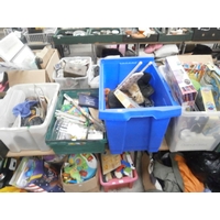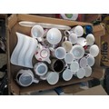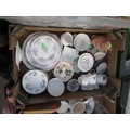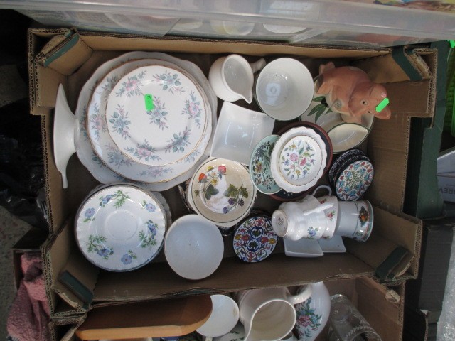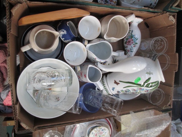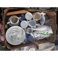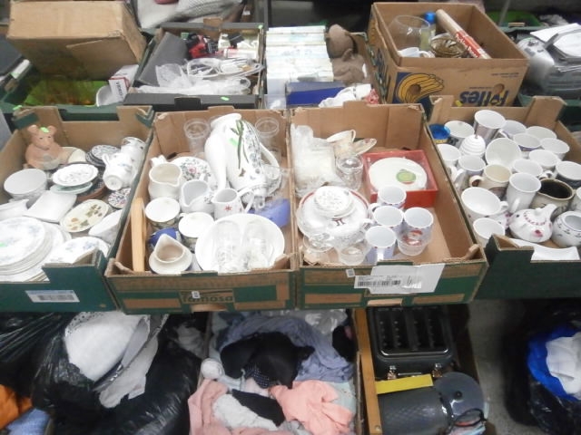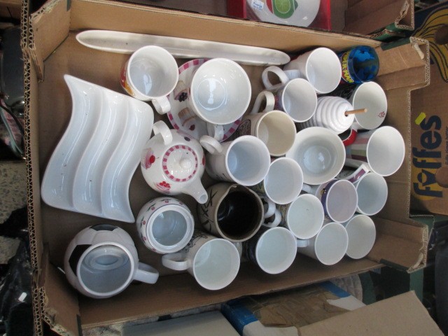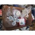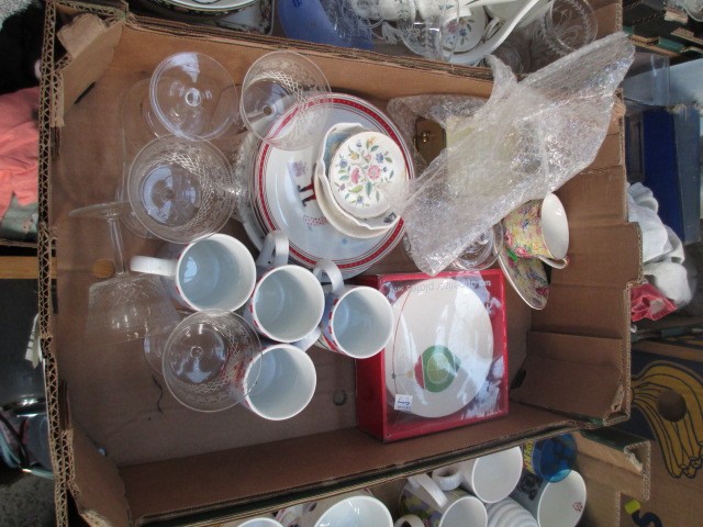 Four boxes inc bone china pieces, mugs, glassware, teapot, etc