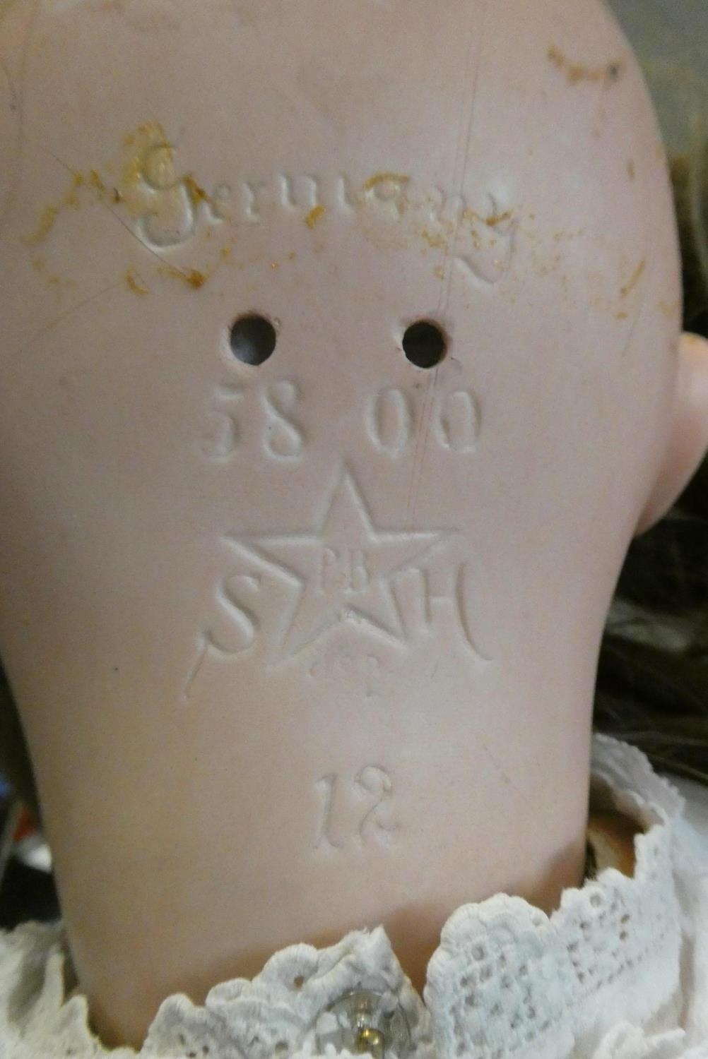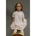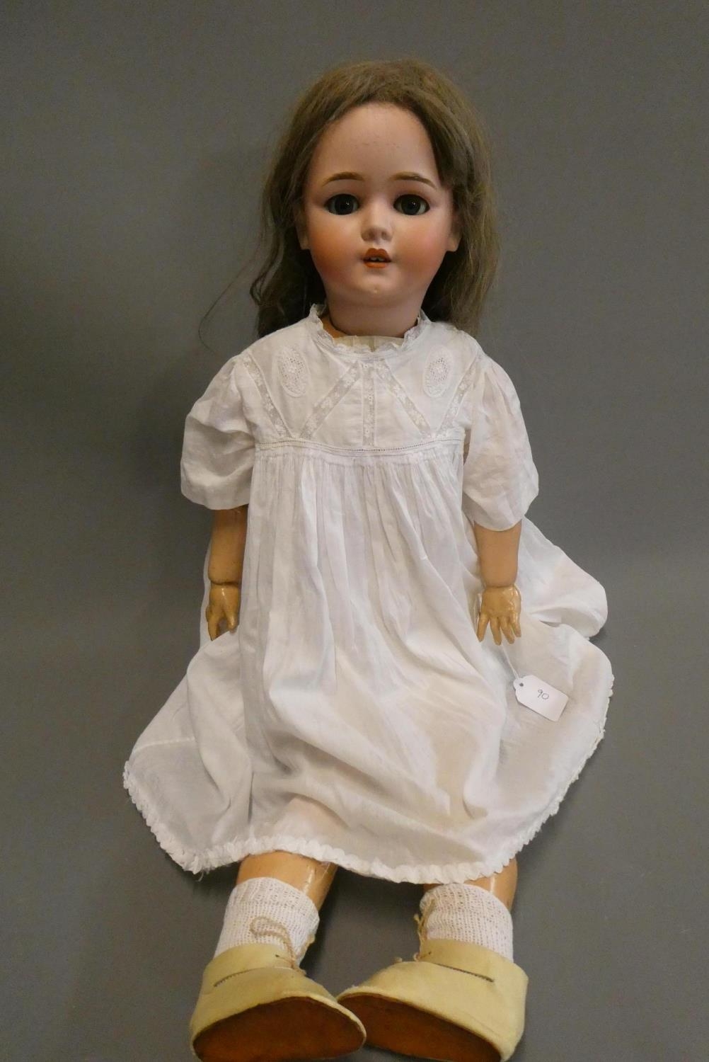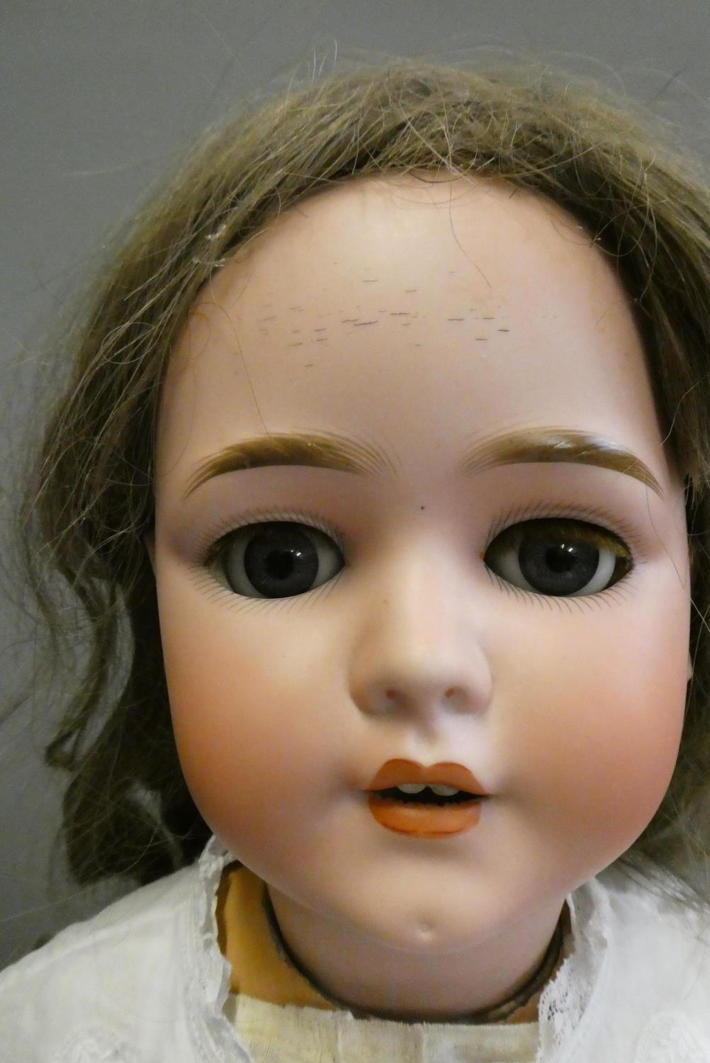 A Schoenau & Hoffmeister bisque socket head doll, with blue glass sleeping eyes, open mouth, teeth, white dress and cream shoes, numbered 5800 12, 32" long