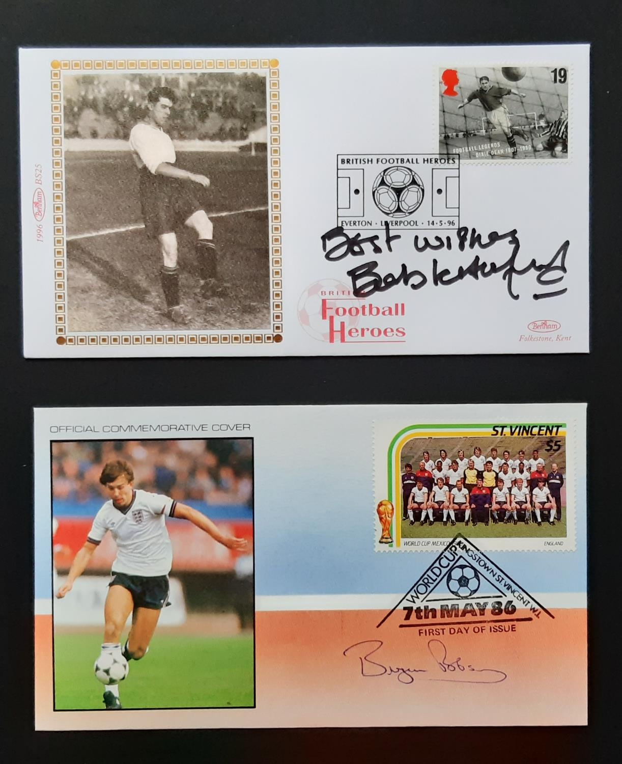 AUTOGRAPHED COVERS, circa 1990's, Signed Commemorative covers by England & Manchester United ex captain Bryan Robson along with ex Everton legend Bob Latchford. Estimate: £10/£20 - Opening Bid: £8
