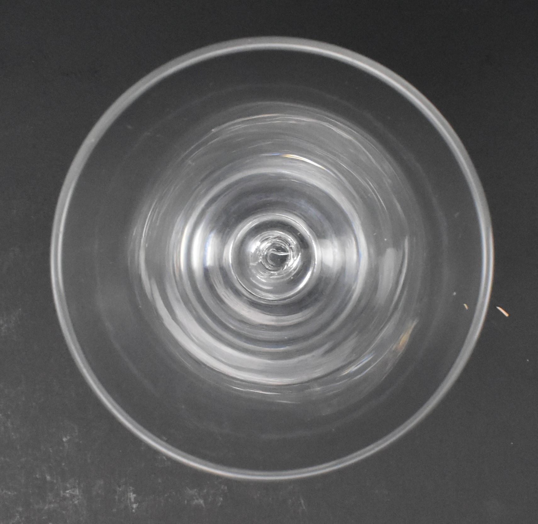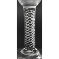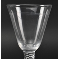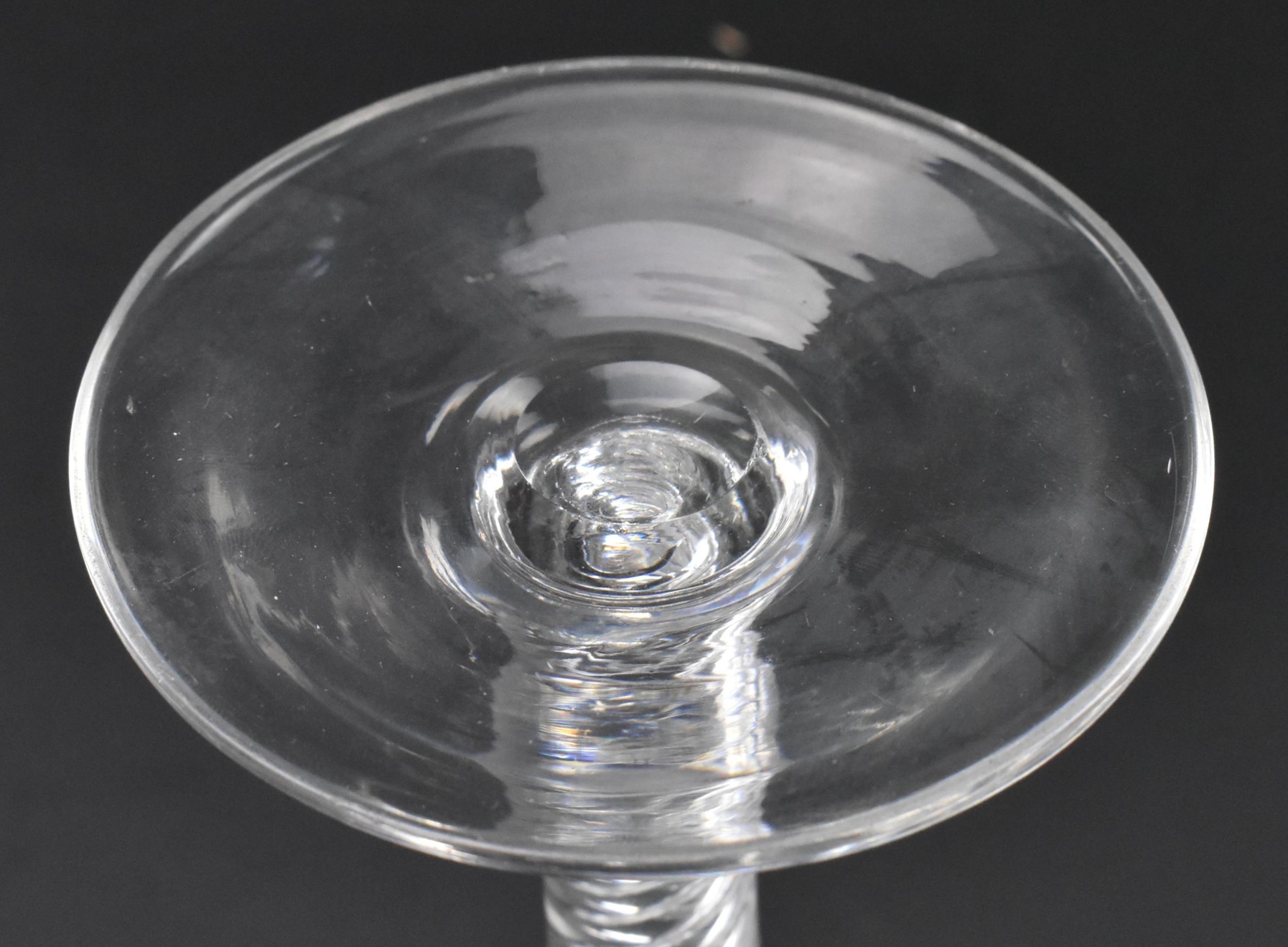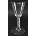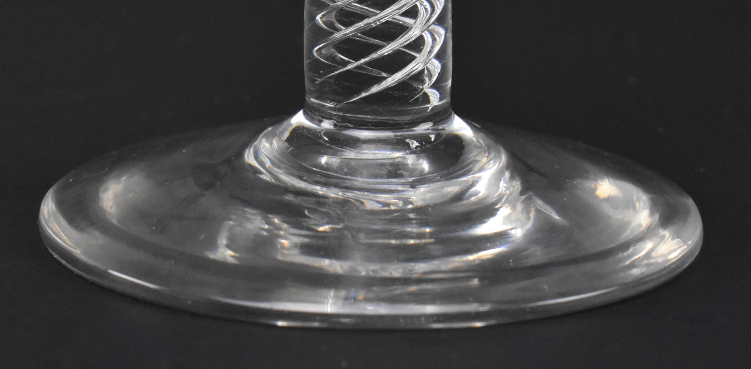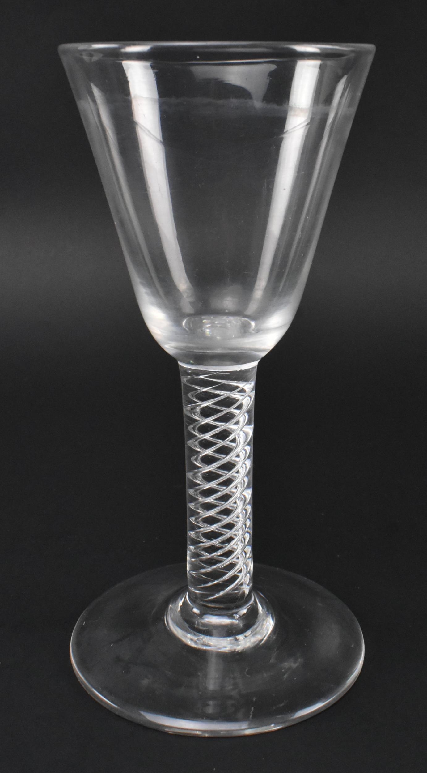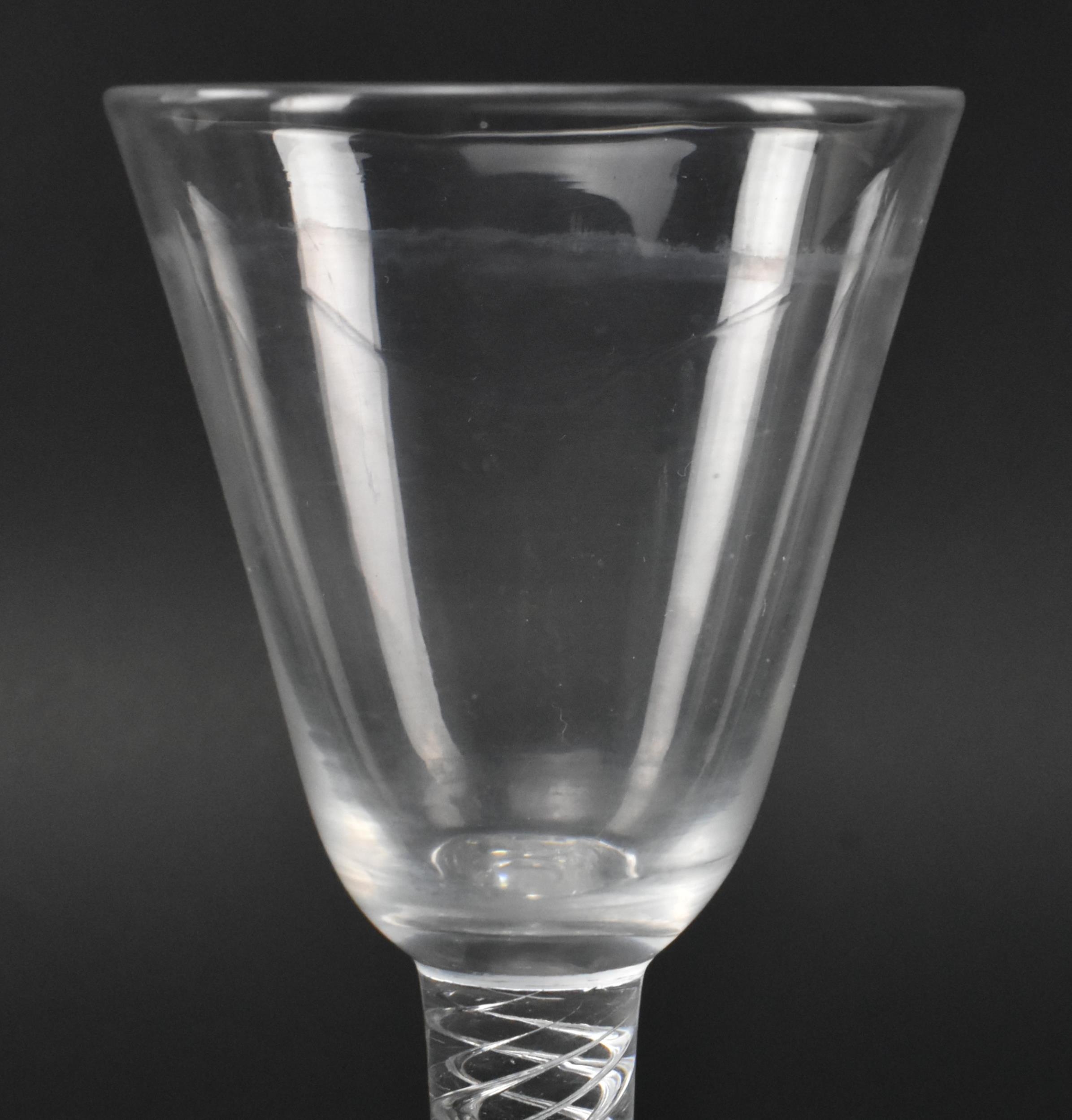 A George III late 18th century hand blown lead glass double series air twist stem wine glass. The glass having a tapering funnel bowl over a double series air twist stem raised on conical circular foot. Smooth pontil to underside. Measures approx. 16cm tall x 8cm in diameter.