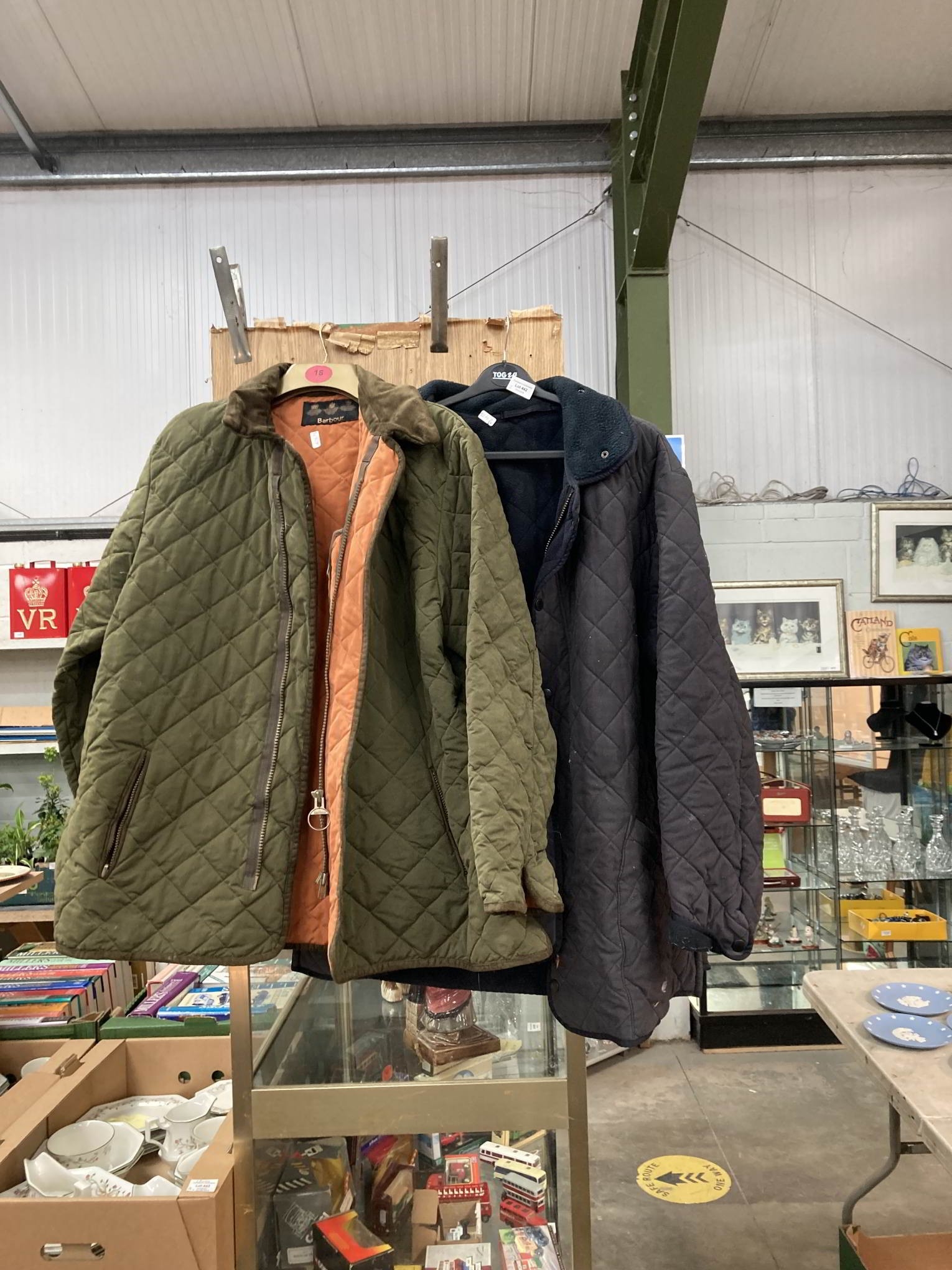Barbour green quilted jacket (no size) & a Barbour black long quilted jacket size L