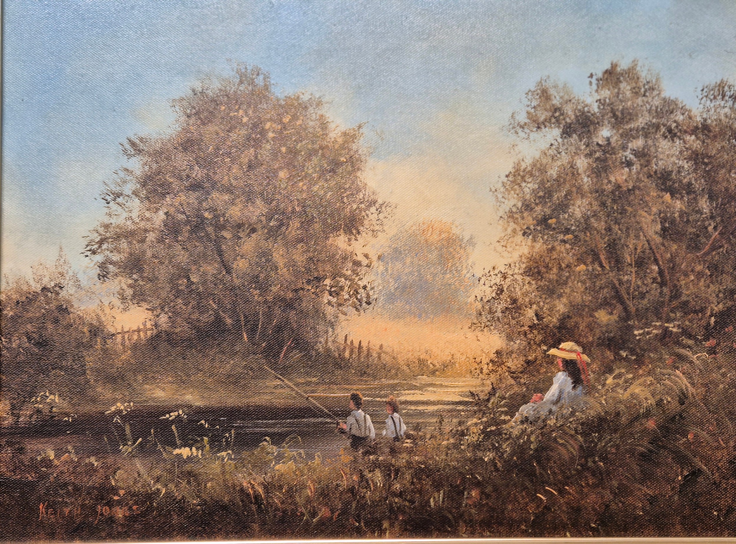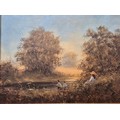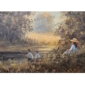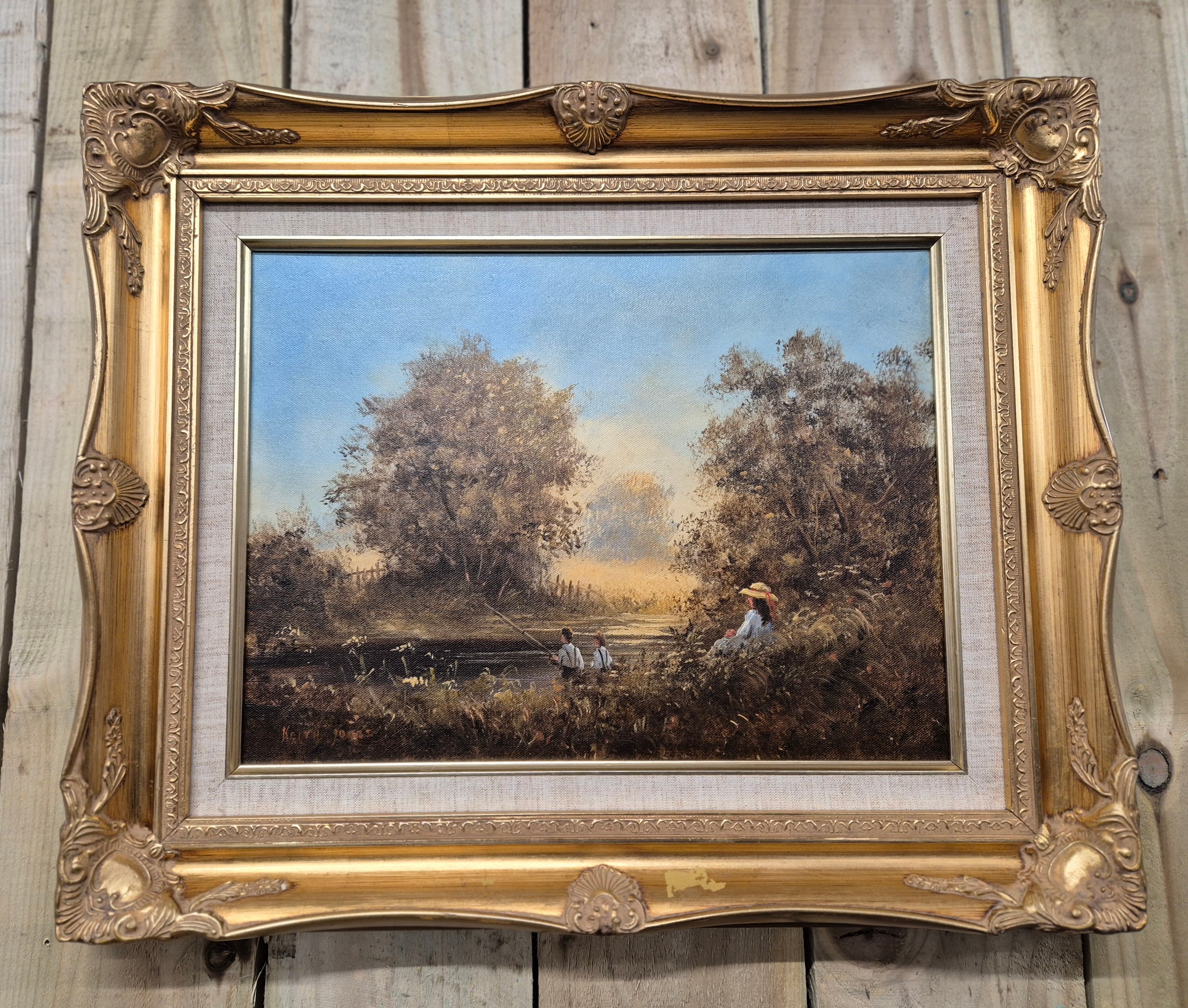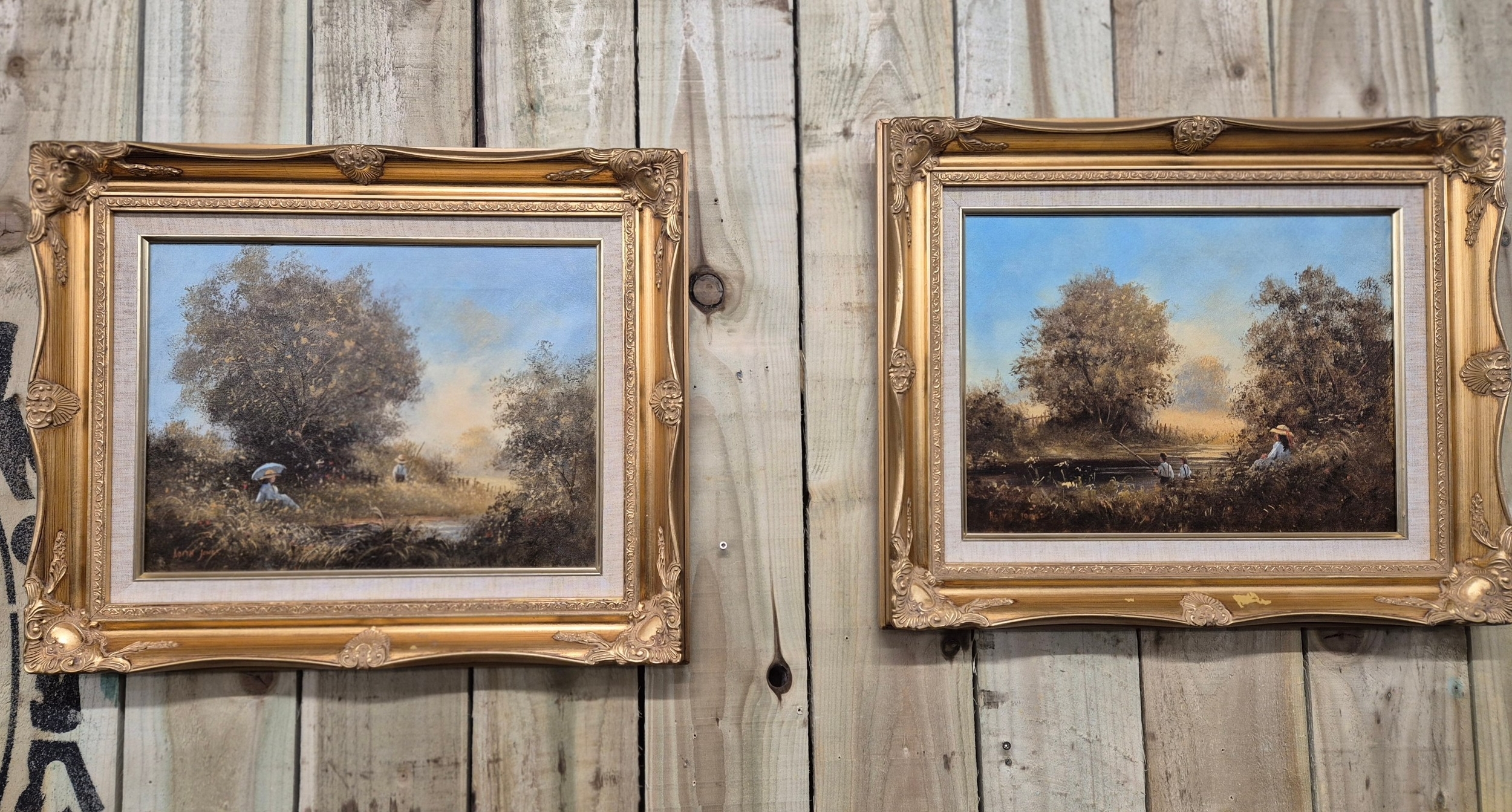 Two original oil paintings on canvas. Depicting girl watching boy fish. Signed. Fitted within gilt frames. Artwork- 29x39.5cm. From the private collection of Preston House.