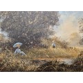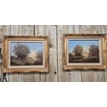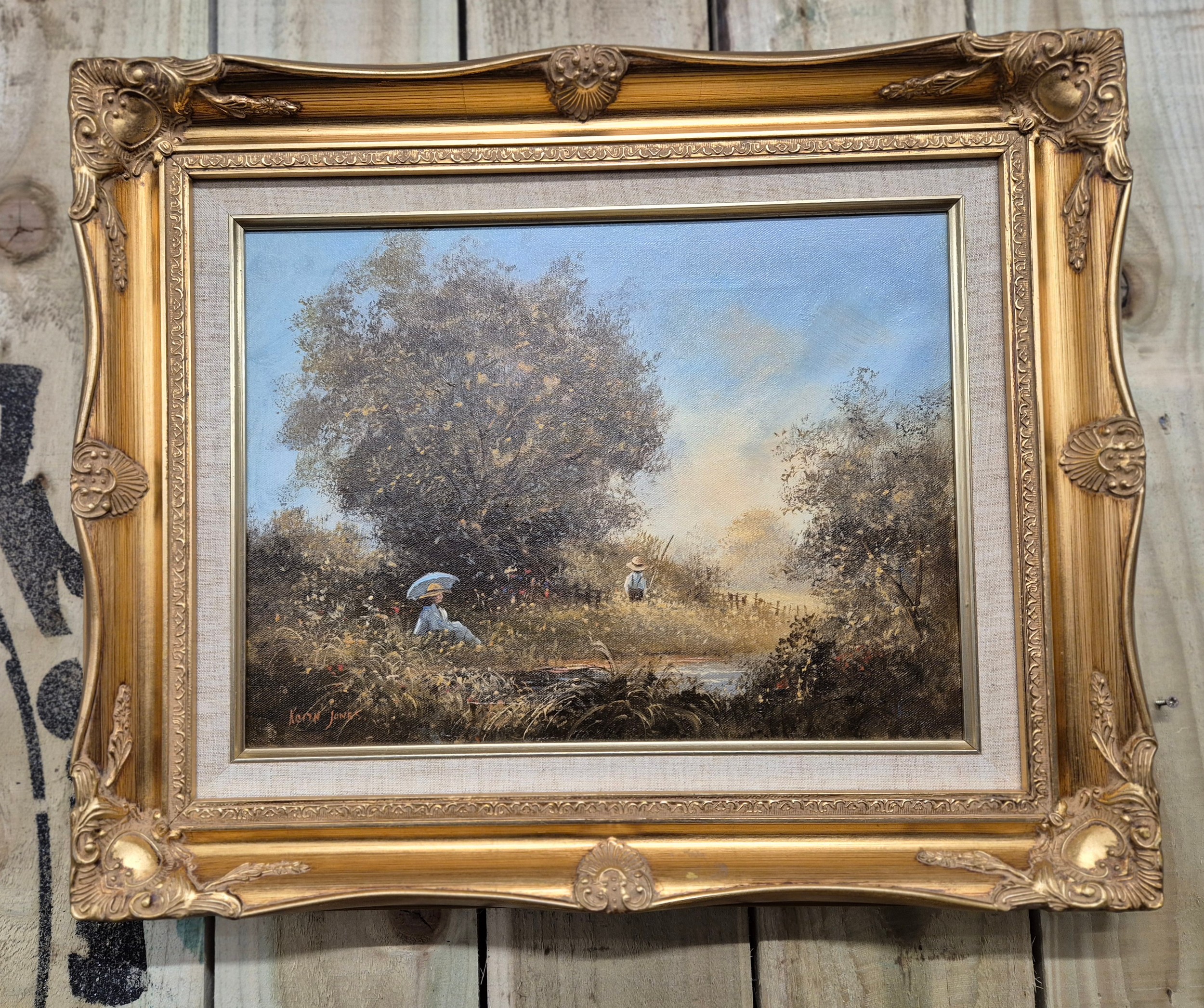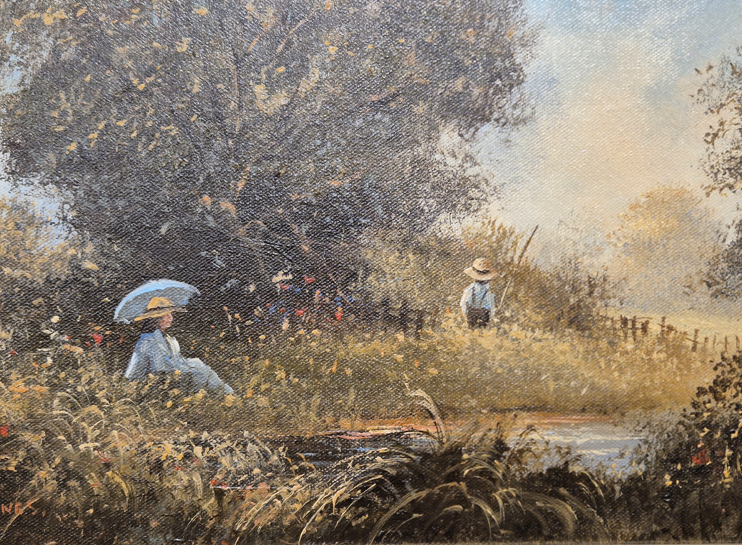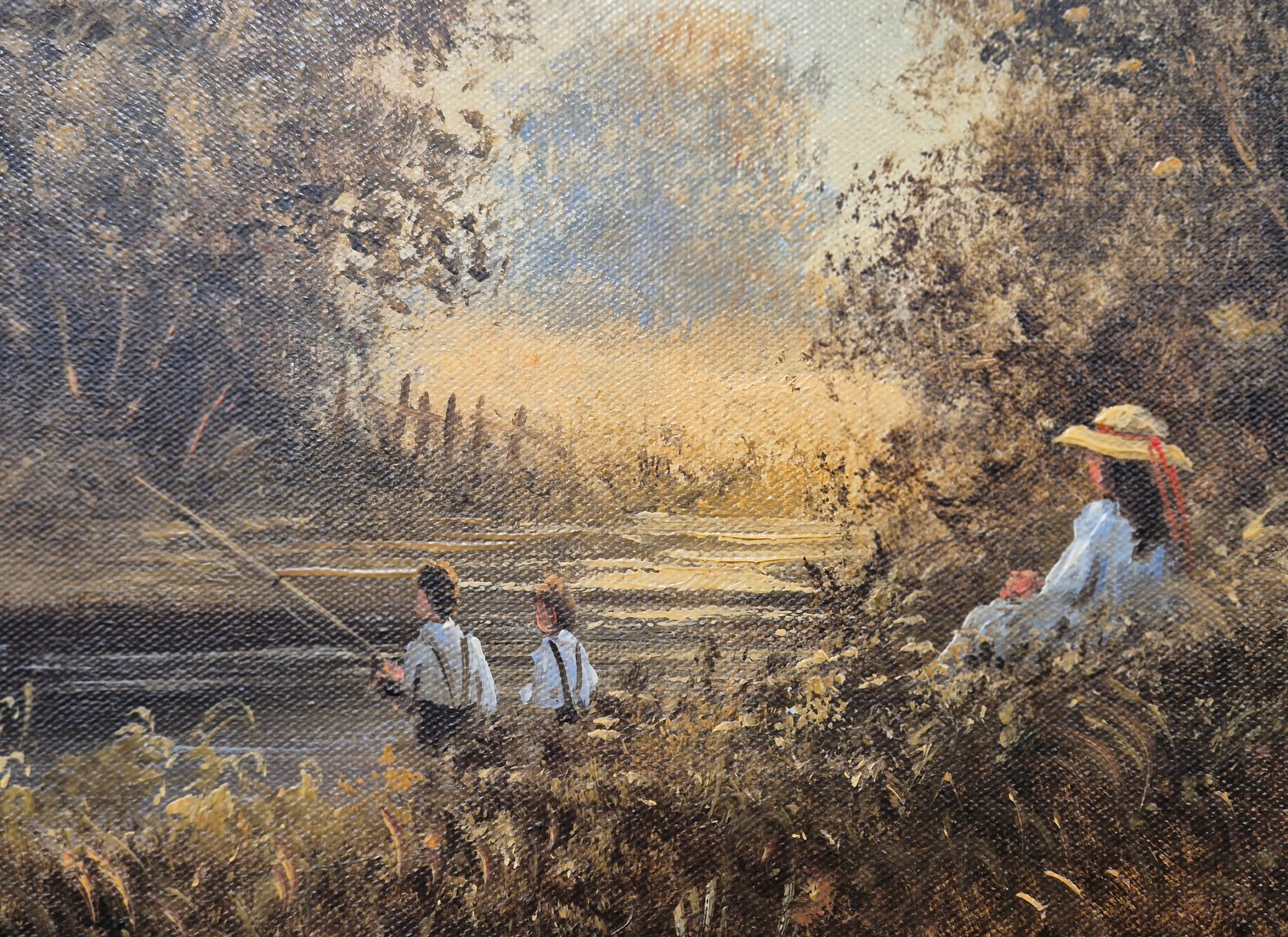 Two original oil paintings on canvas. Depicting girl watching boy fish. Signed. Fitted within gilt frames. Artwork- 29x39.5cm. From the private collection of Preston House.