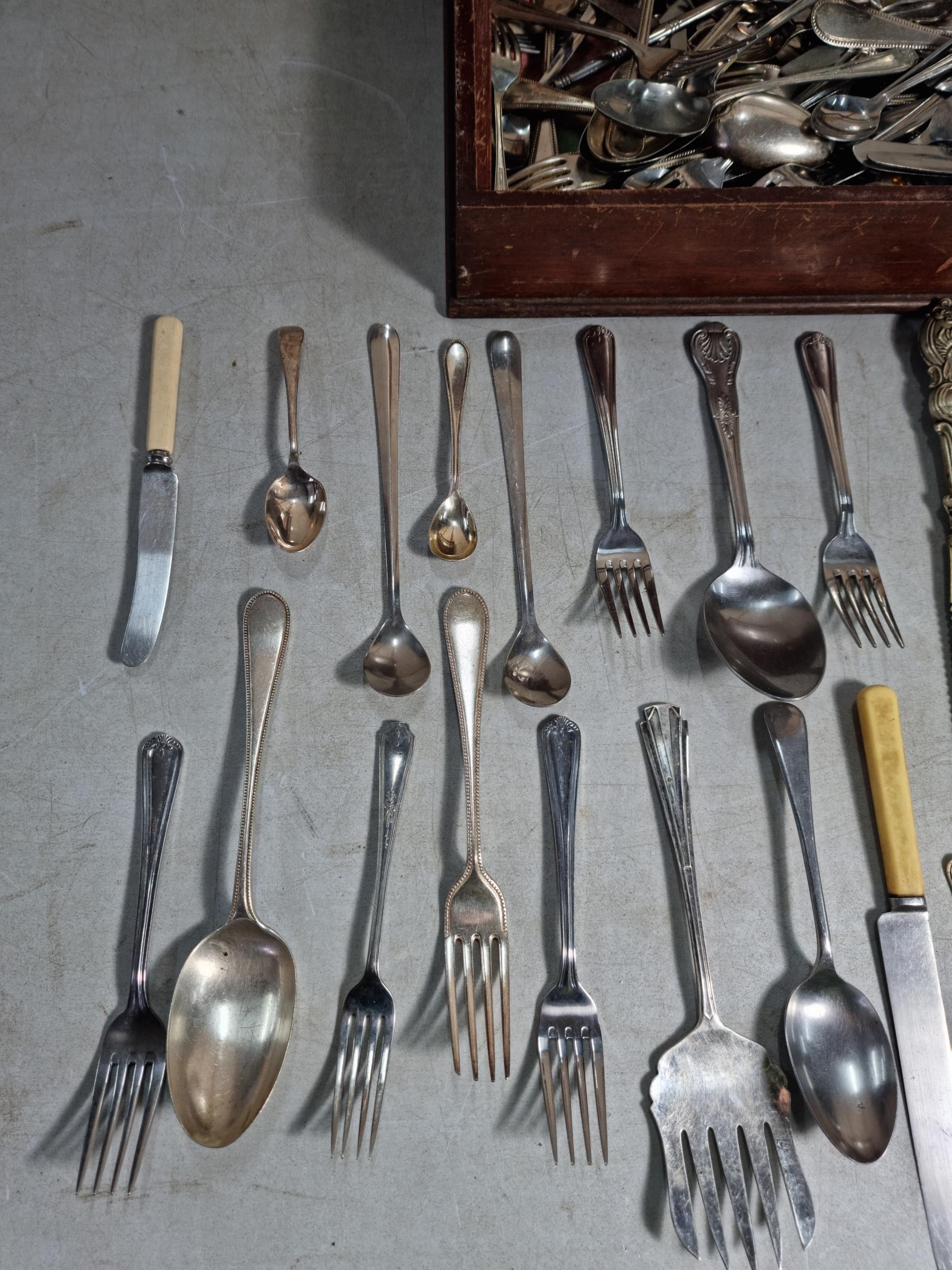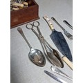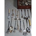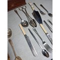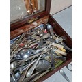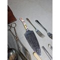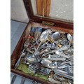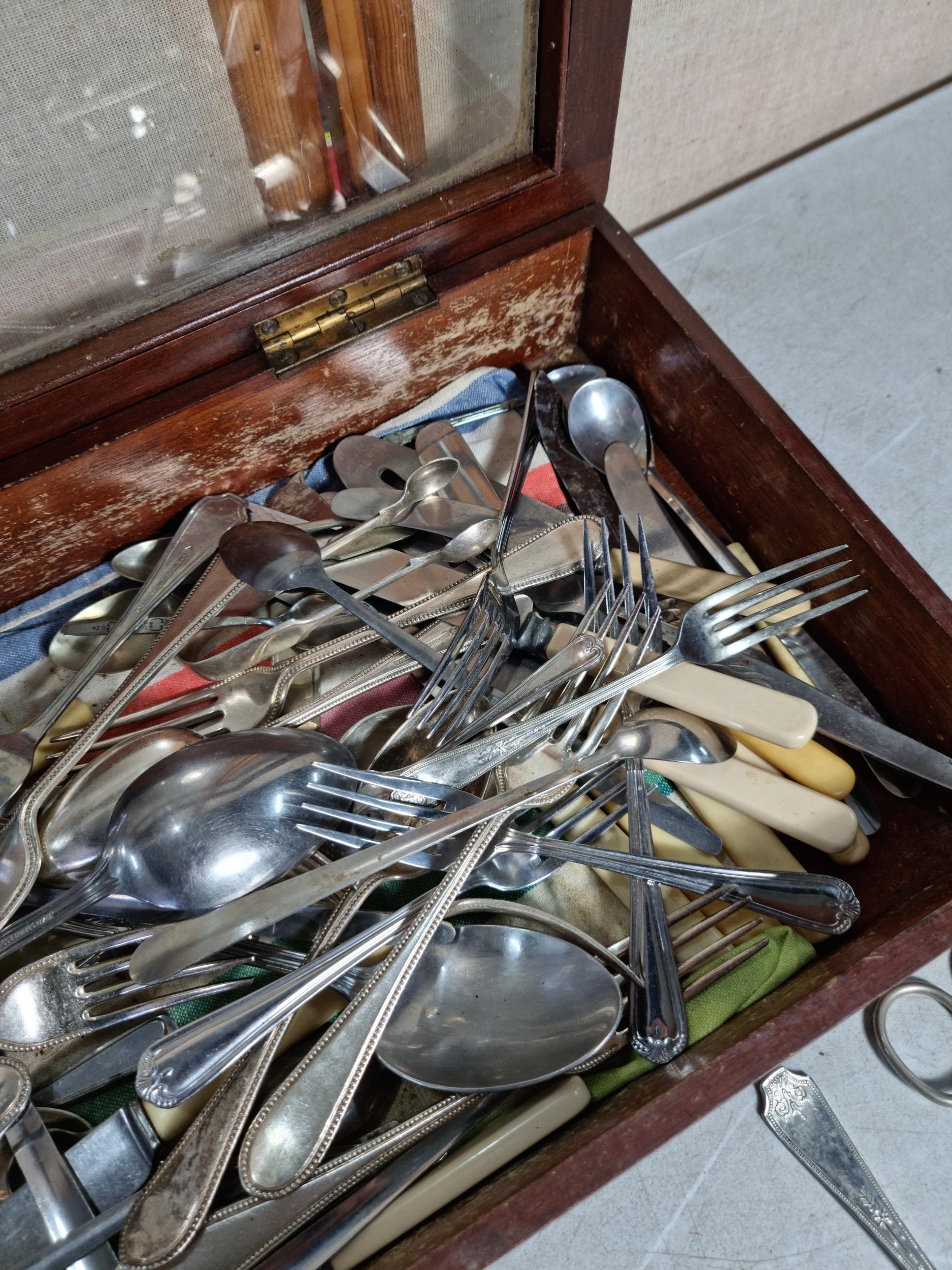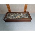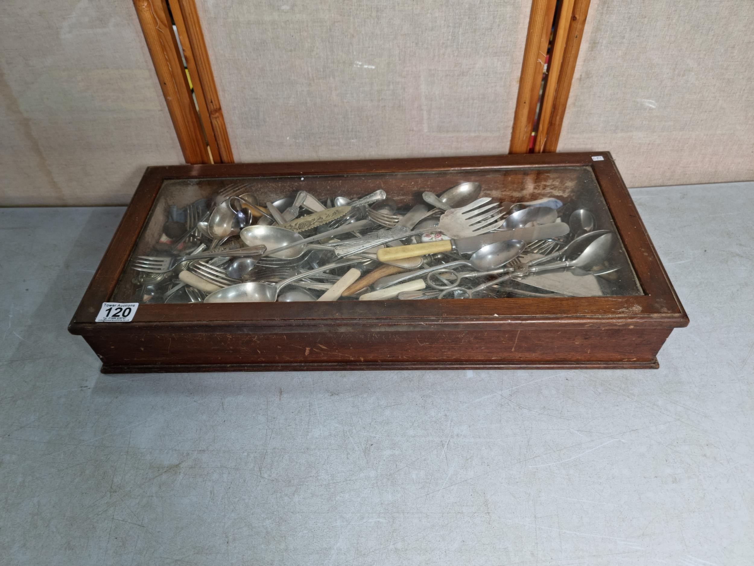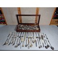 Very large qty of various antique, vintage and some modern flatware, cutlery and kitchen tools complete with a glazed tabletop display cabinet measuring 62.5cm x 28.5cm x 9cm.