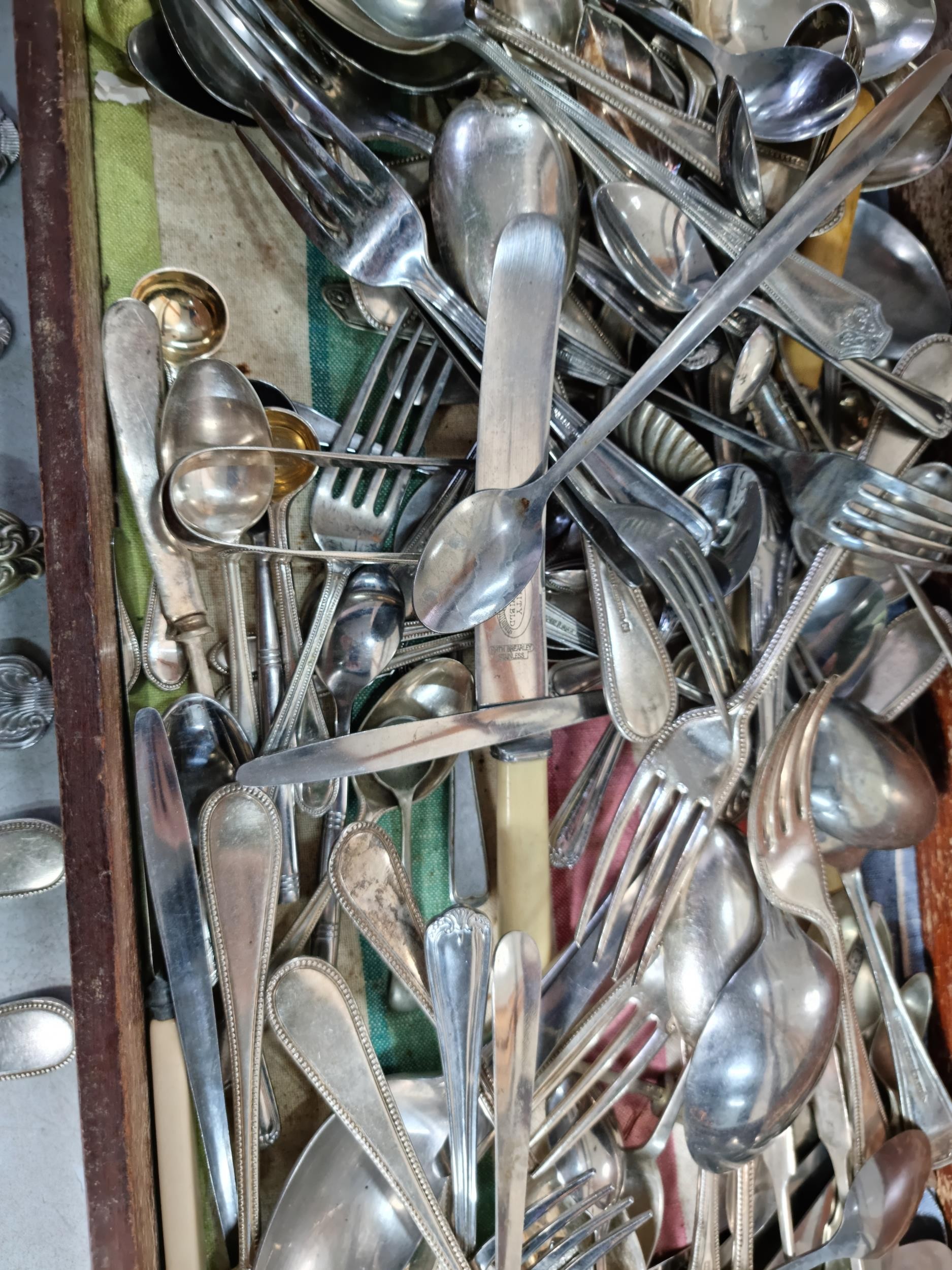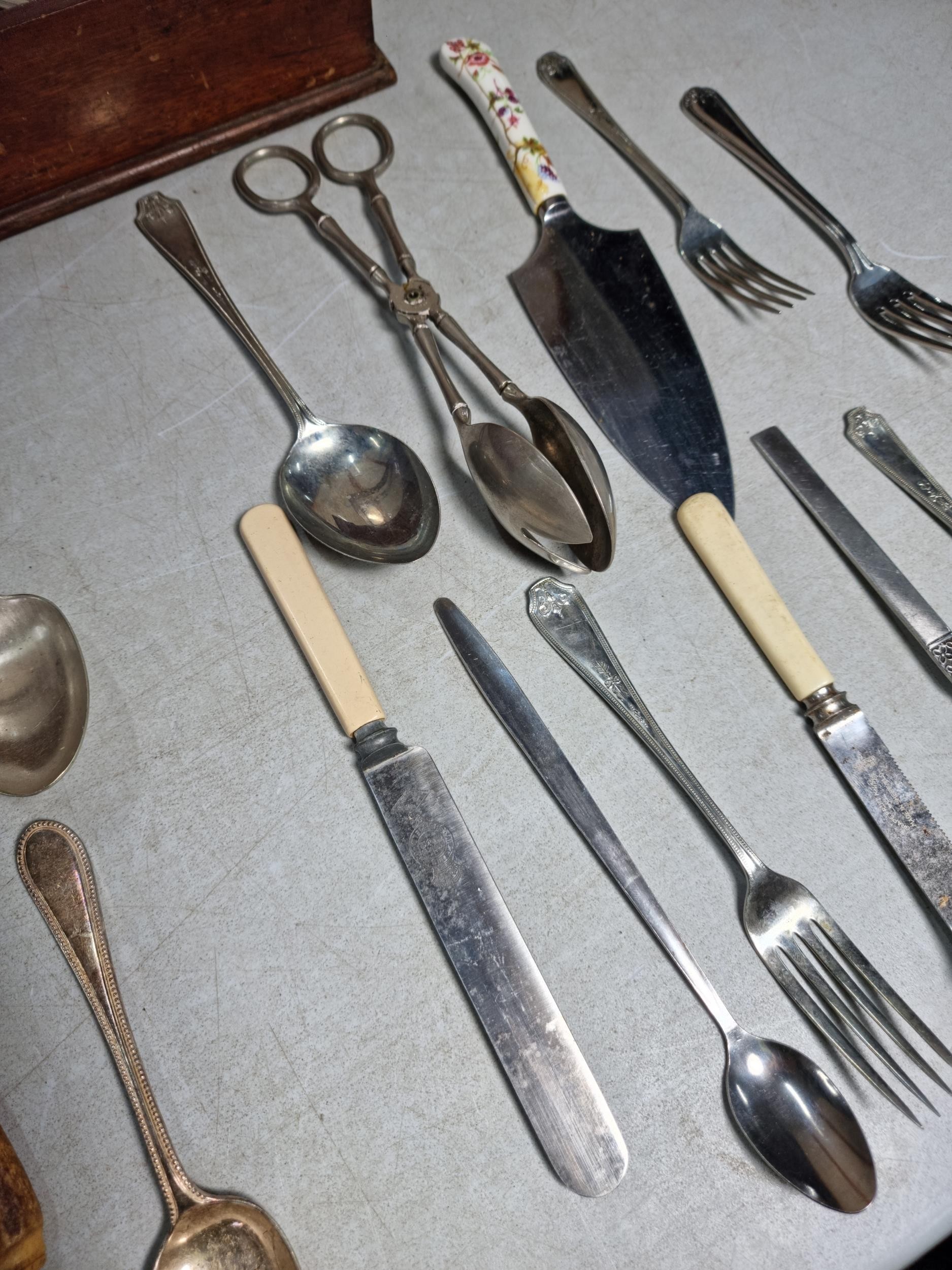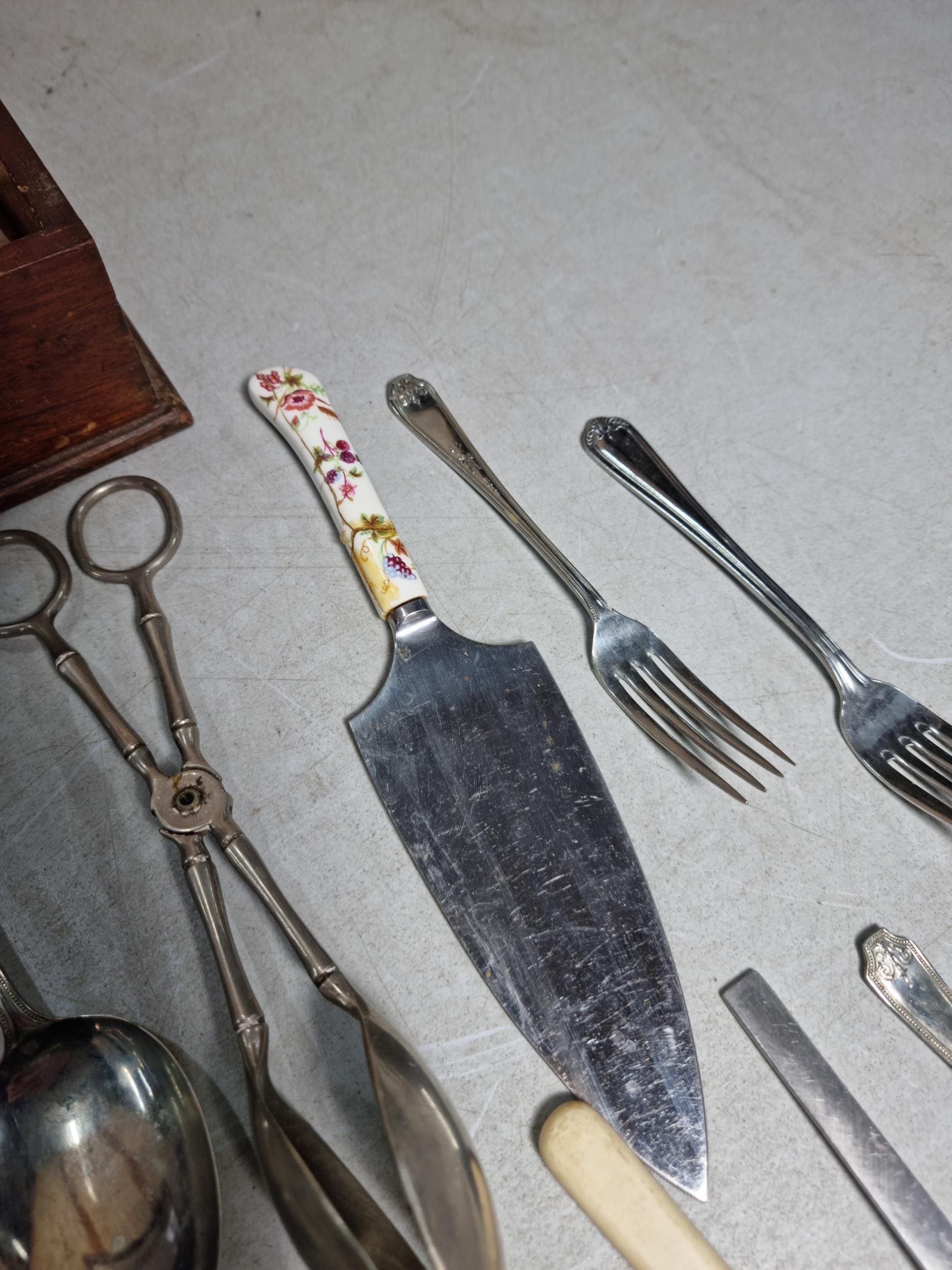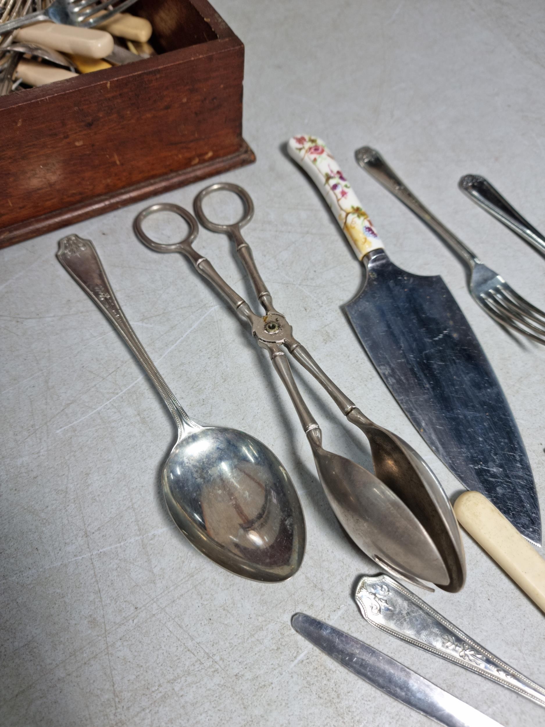 Very large qty of various antique, vintage and some modern flatware, cutlery and kitchen tools complete with a glazed tabletop display cabinet measuring 62.5cm x 28.5cm x 9cm.
