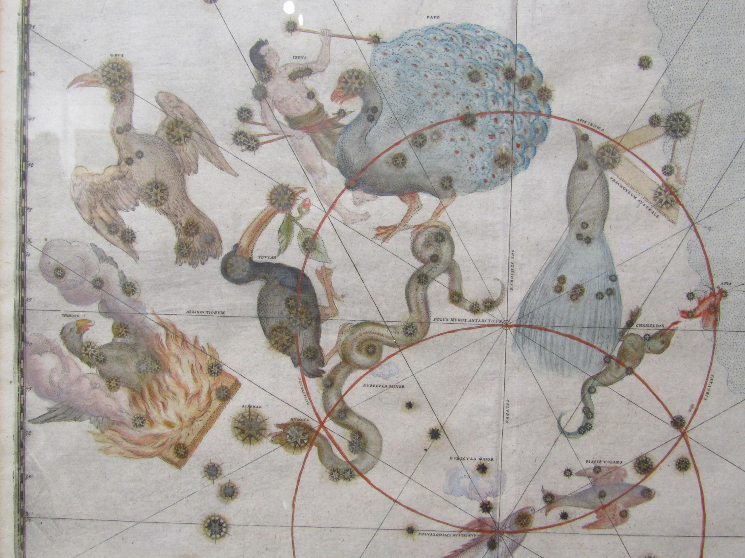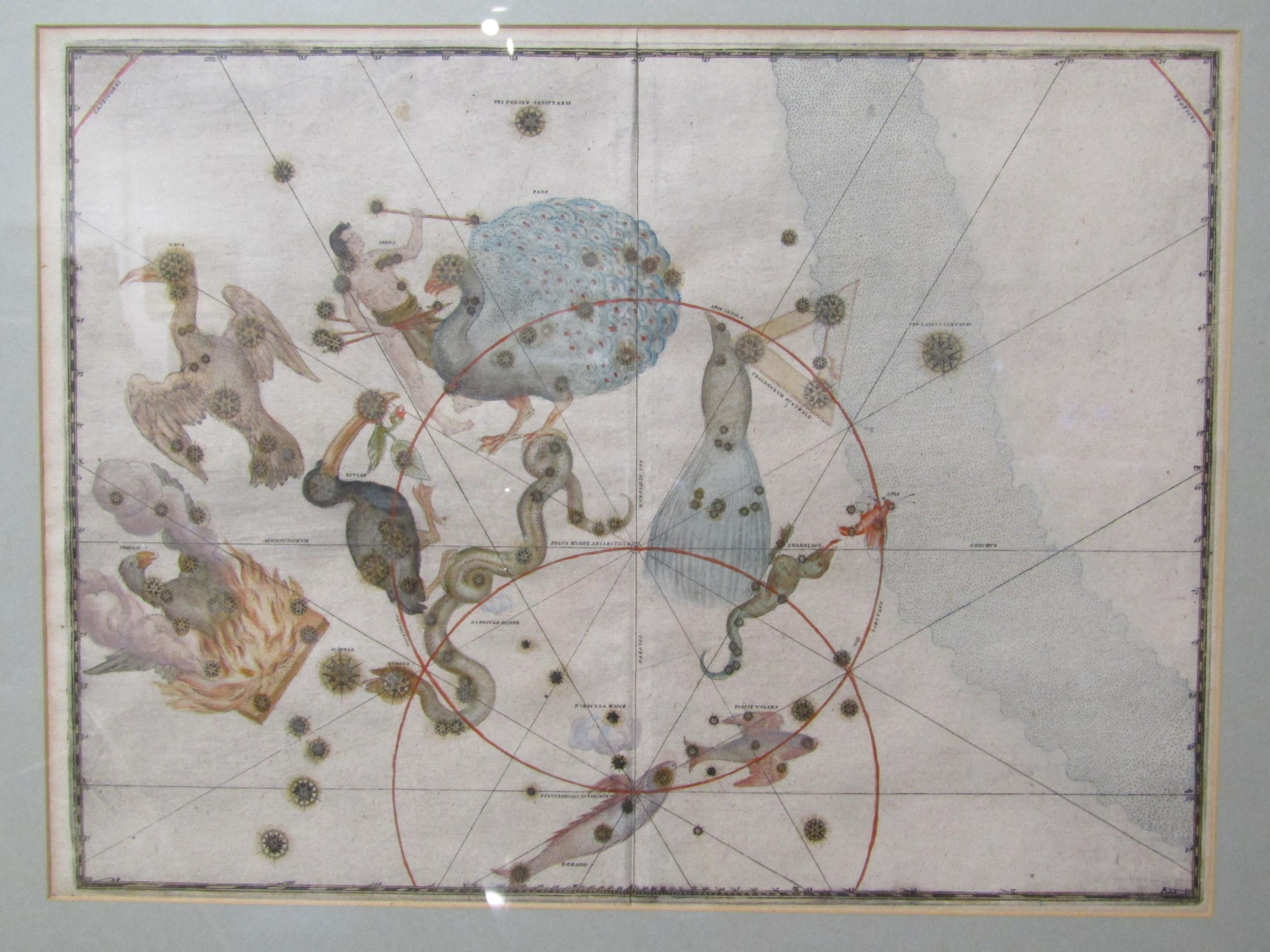 A 17th/18th Century coloured etching depicting star constellations "Southern Birds" after Johann Bayers Uranometria, 29cm x 39cm (R) £100
